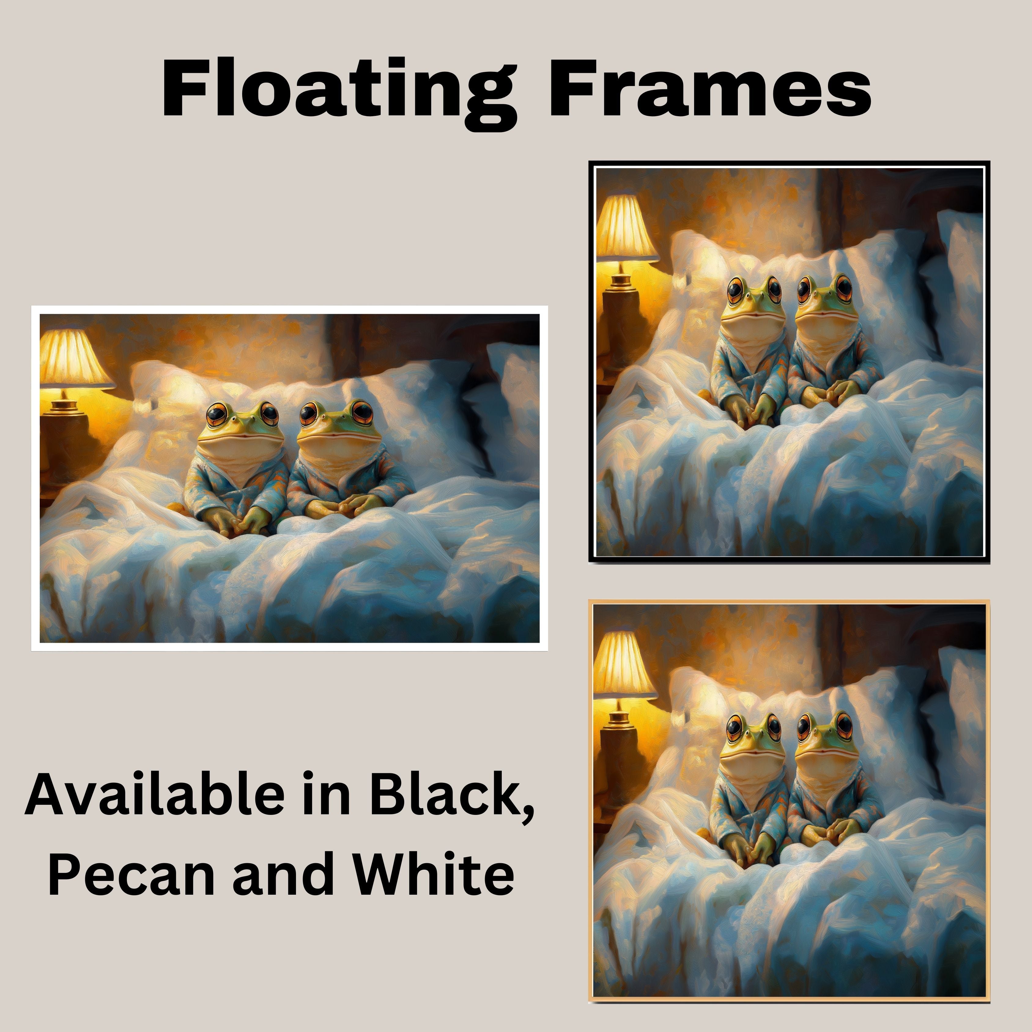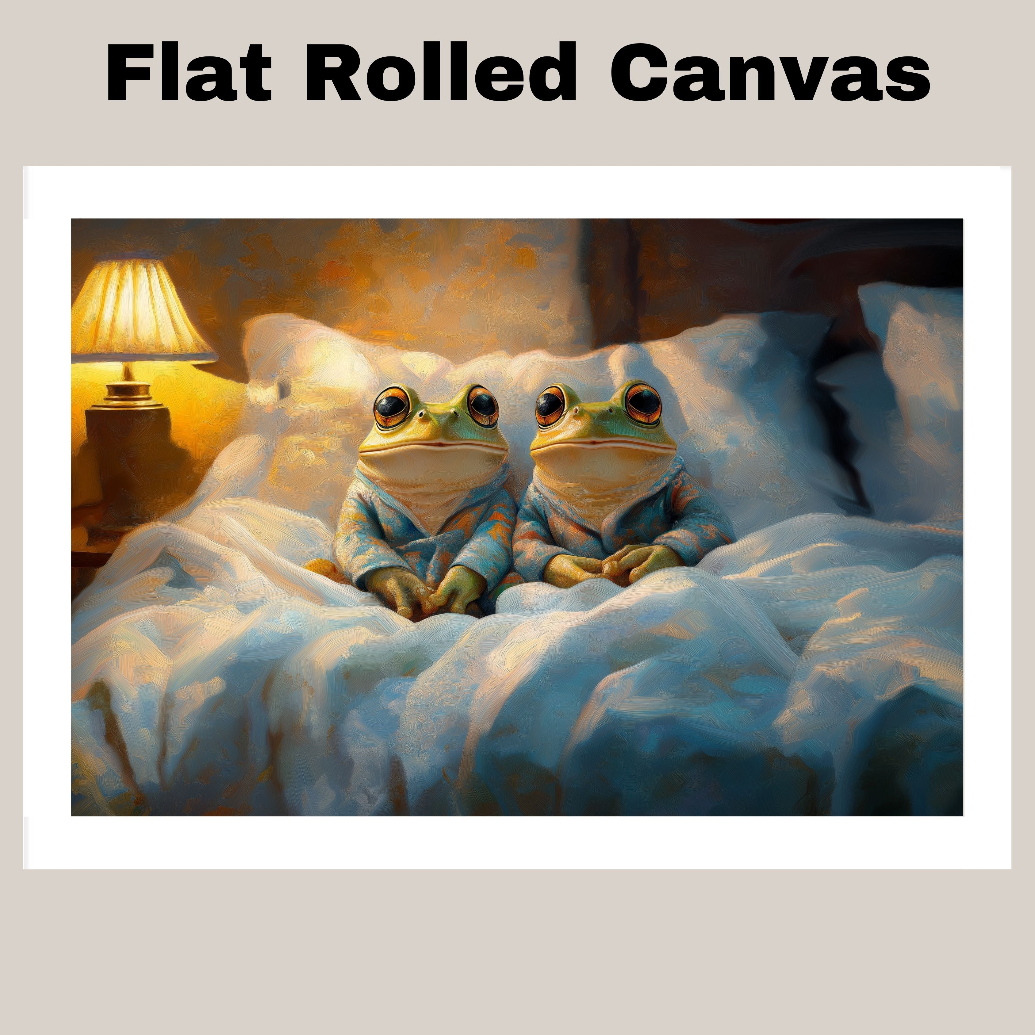 Charming Painting of Two Frogs in Pajamas Sitting in Bed Under a Warm Lamp Glow with Peaceful Expressions and a Cozy Nighttime Atmosphere on Ready to Hang 1.5" Thick Canvas Wrap, Floating Framed Canvas, Flat Rolled Canvas