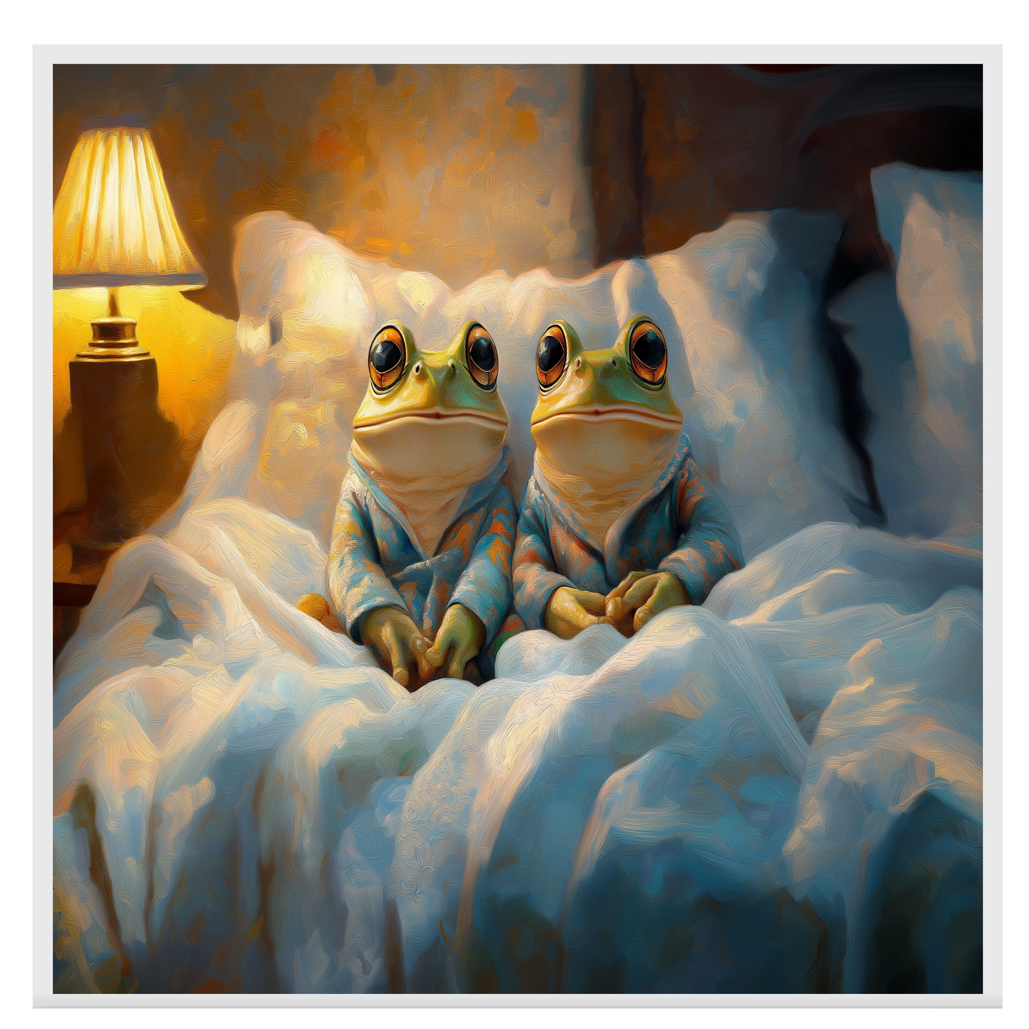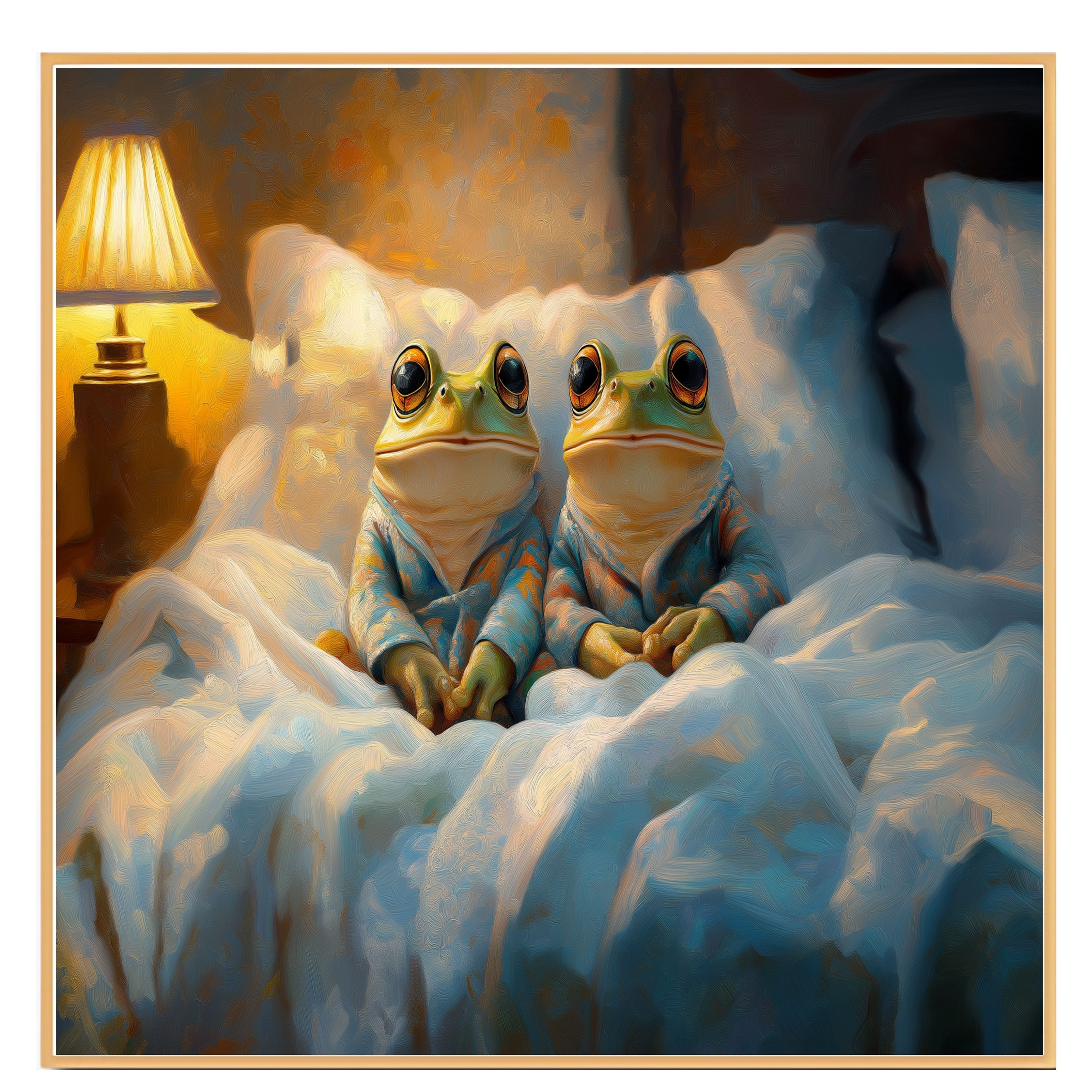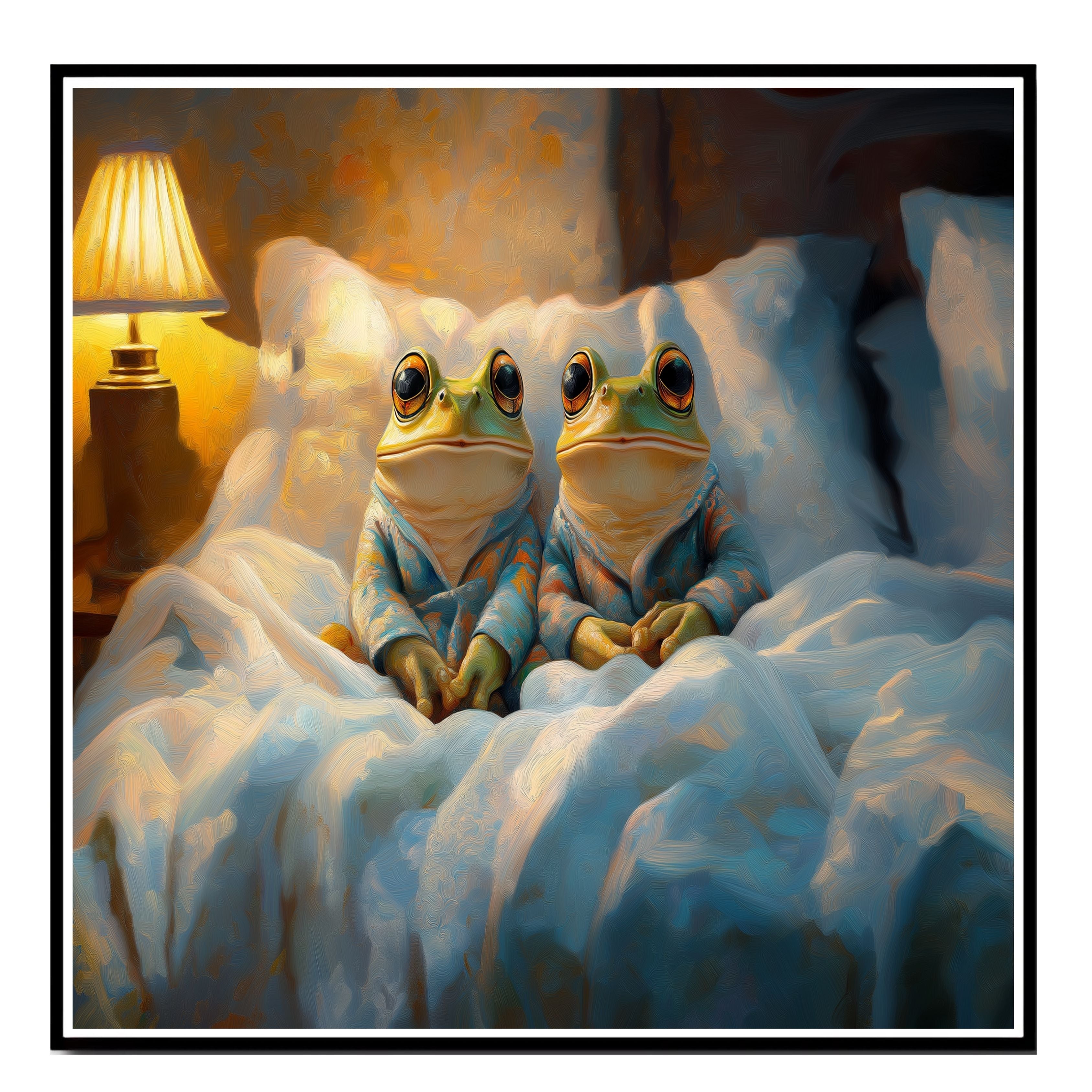 This heartwarming painting captures two frogs in pajamas, nestled under blankets with a soft lamp glow creating a tranquil bedtime mood. Their relaxed expressions and detailed textures evoke comfort and serenity. A perfect choice for whimsical decor, cozy bedrooms, or frog-themed collections.