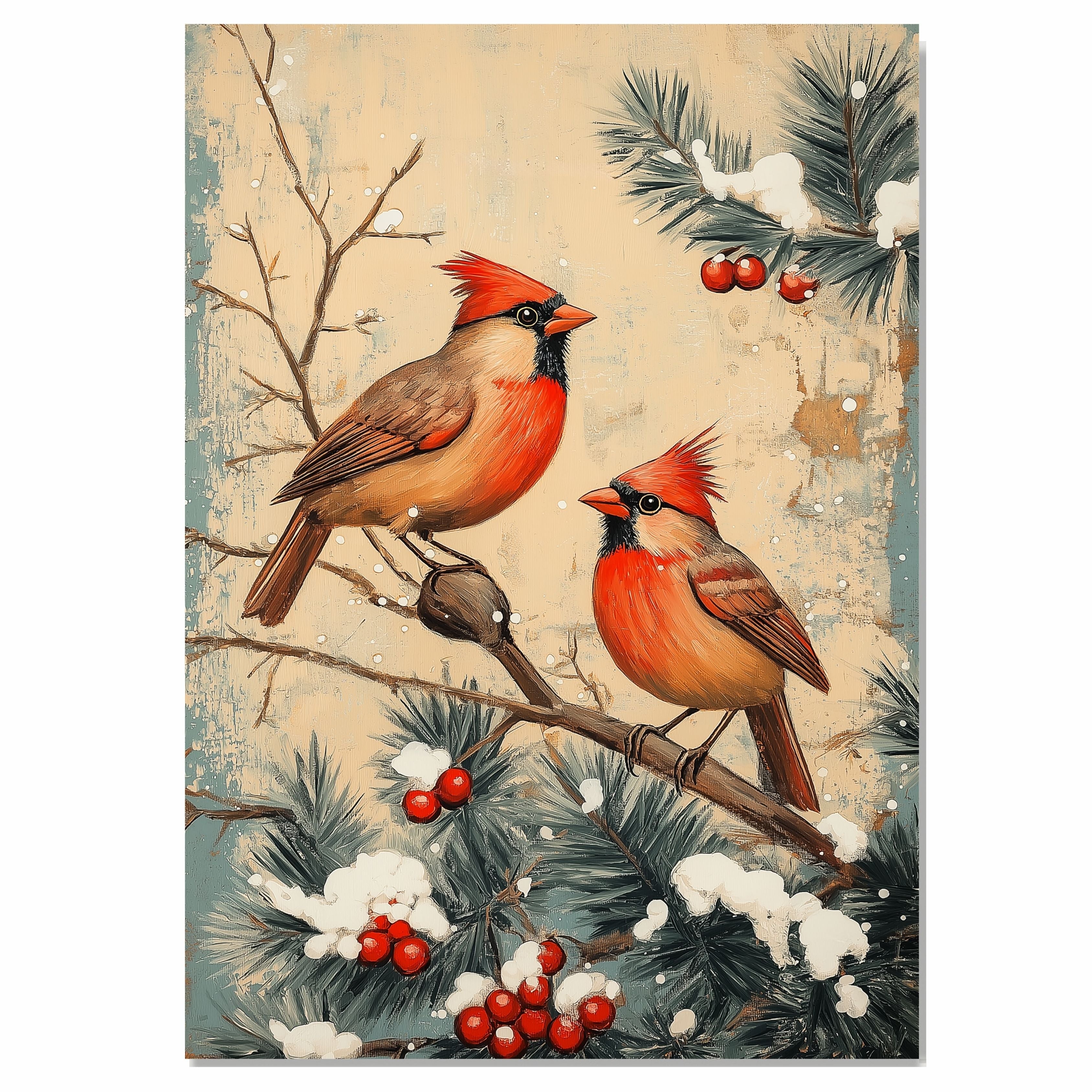 This nostalgic winter scene features two vibrant cardinals perched on snow-dusted pine branches adorned with red berries. With a classic retro aesthetic and warm natural tones, this artwork evokes the peaceful beauty of winter and is perfect for Christmas decor, seasonal gifting, or for anyone who appreciates timeless nature-inspired art.
