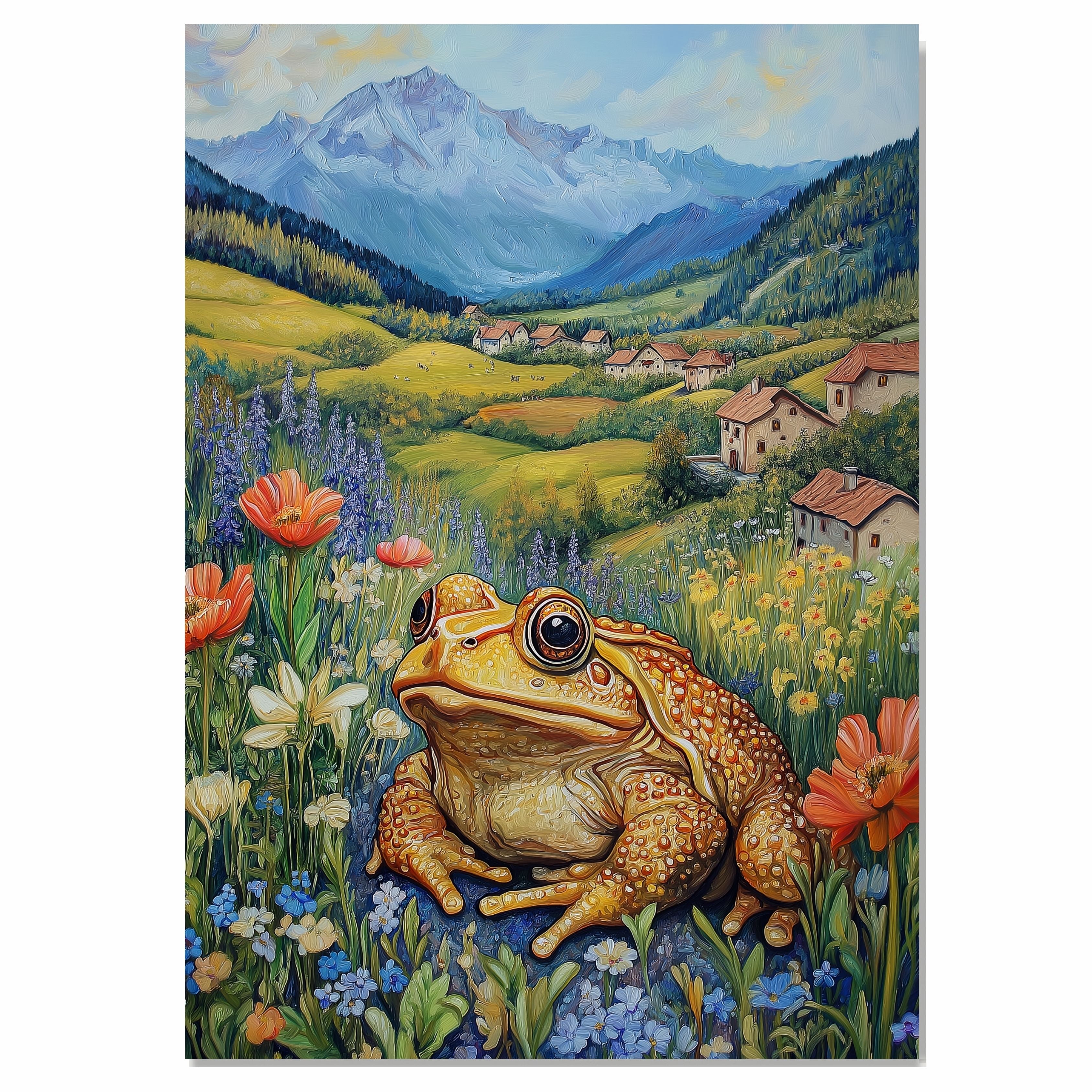 Bring vibrant countryside charm to your home with this cheerful hand painted artwork featuring a bright toad surrounded by colorful wildflowers and scenic mountains A joyful and nature inspired addition to home wall decor or a thoughtful gift.