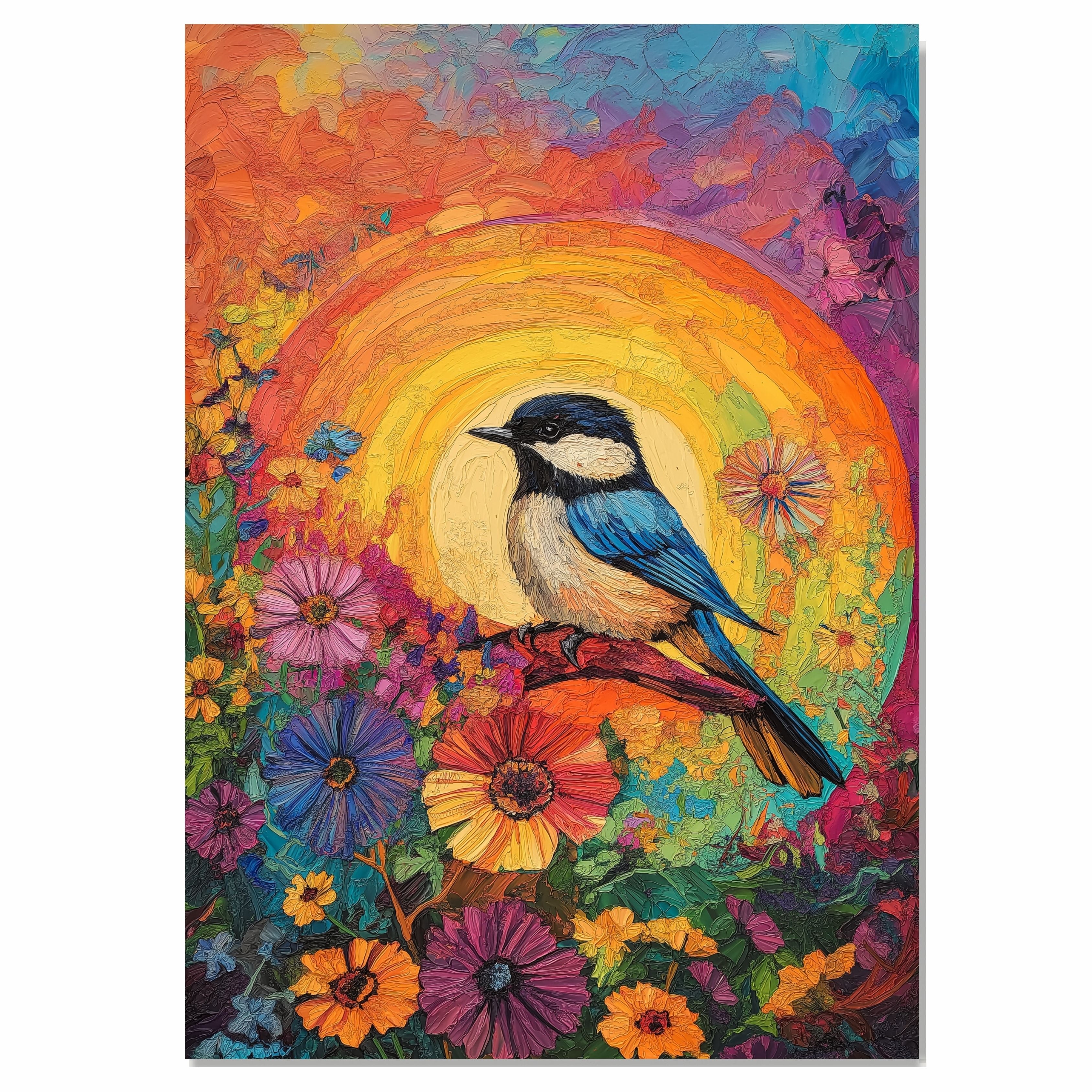 This vivid painting features a chickadee perched amidst blooming wildflowers with a radiant rainbow sun behind it. Rich in texture and saturated color, the piece blends nature and energy in a joyful and expressive composition, ideal for bold, cheerful spaces.