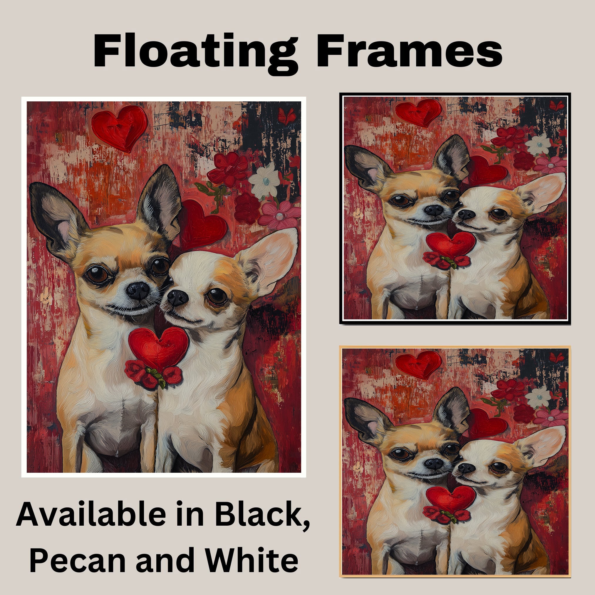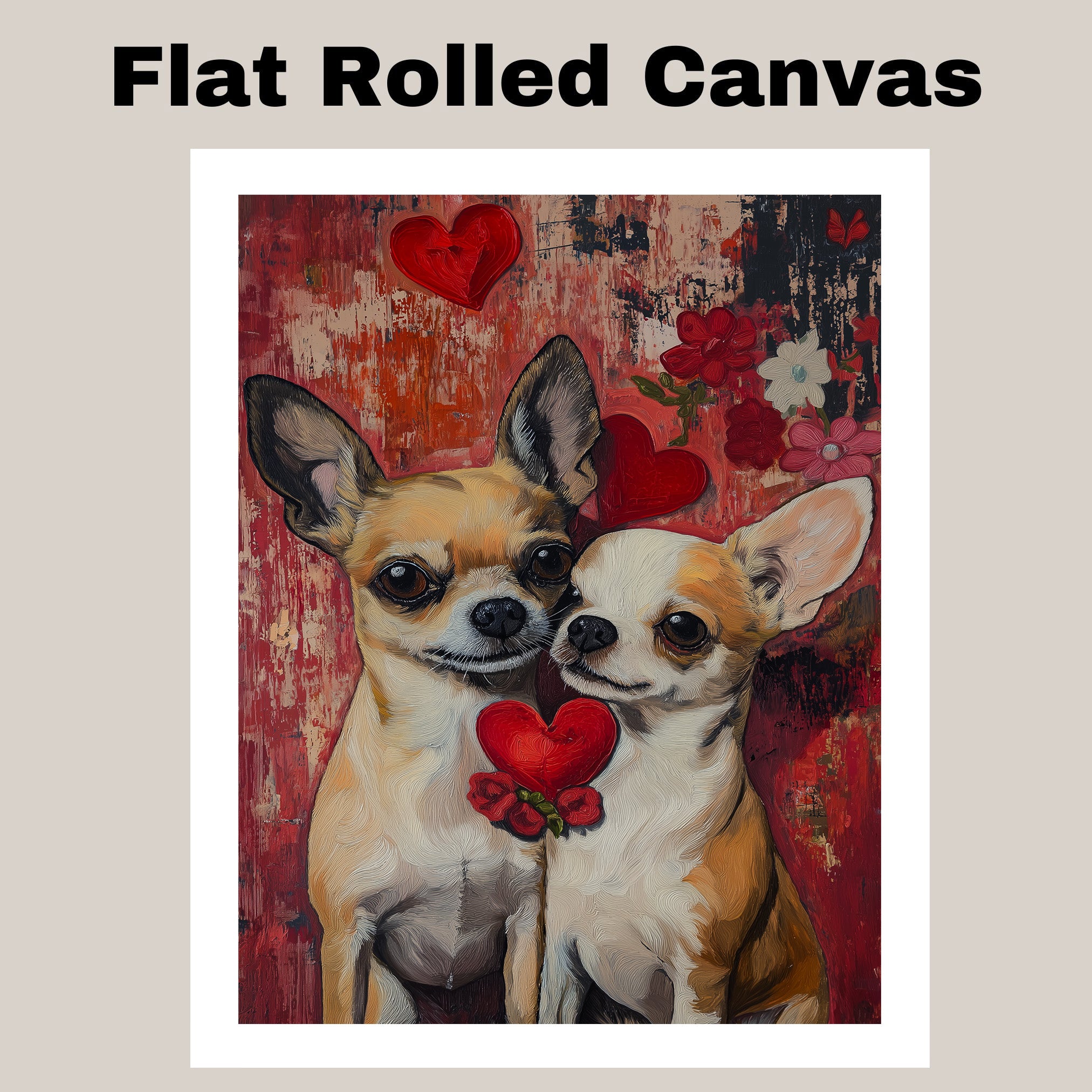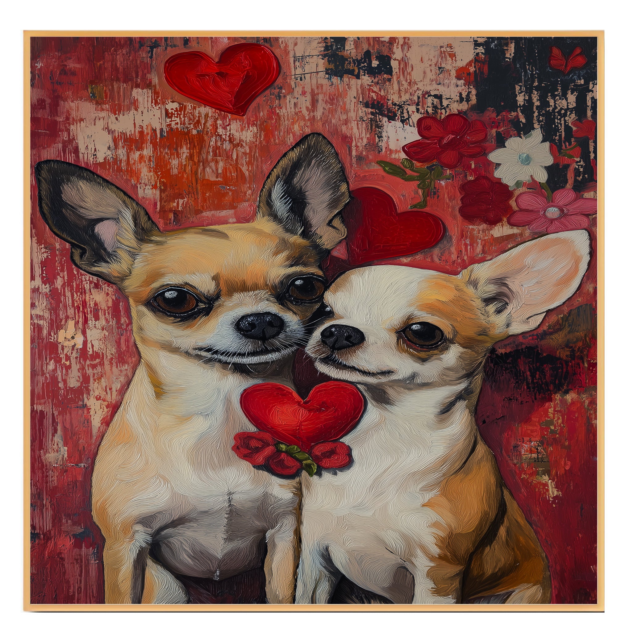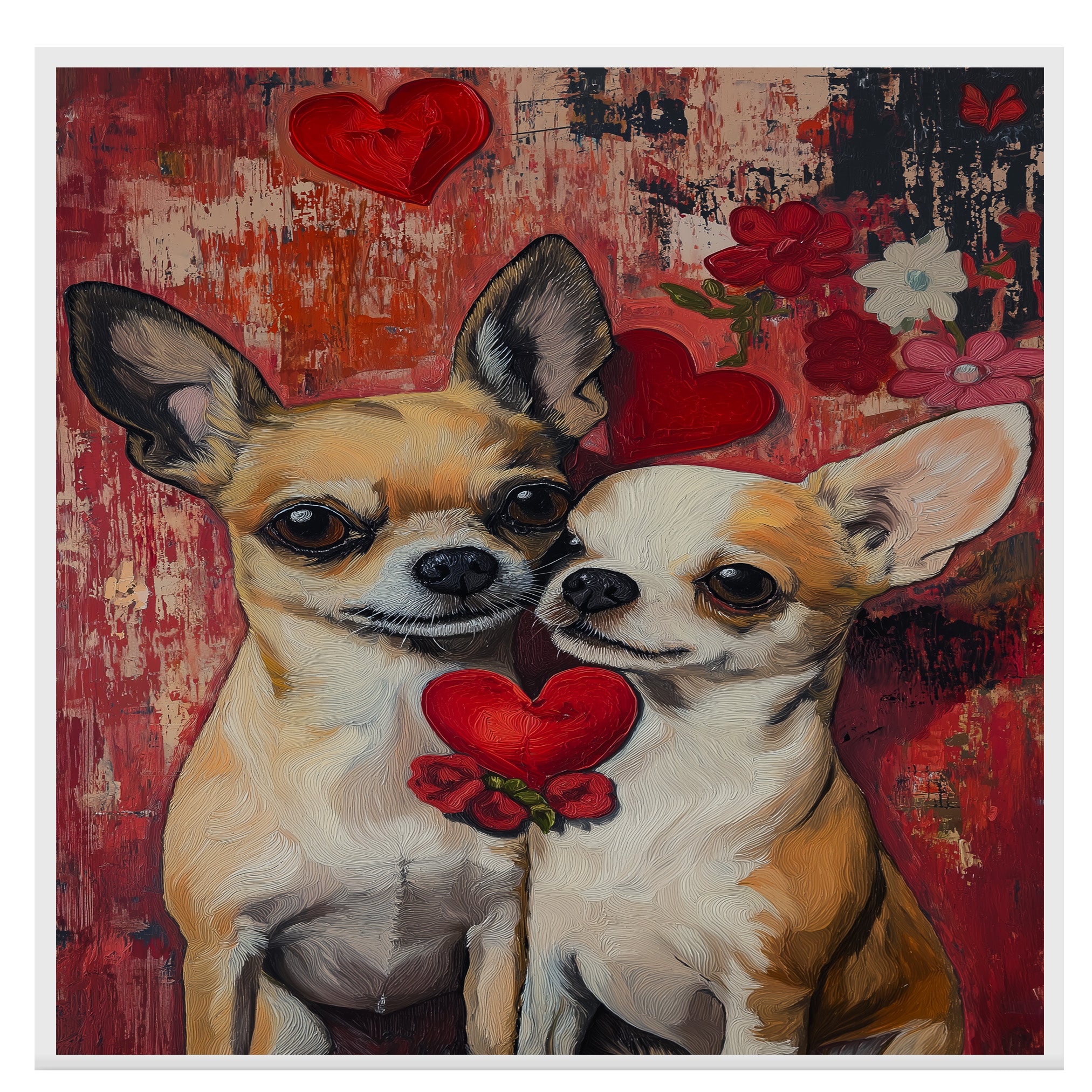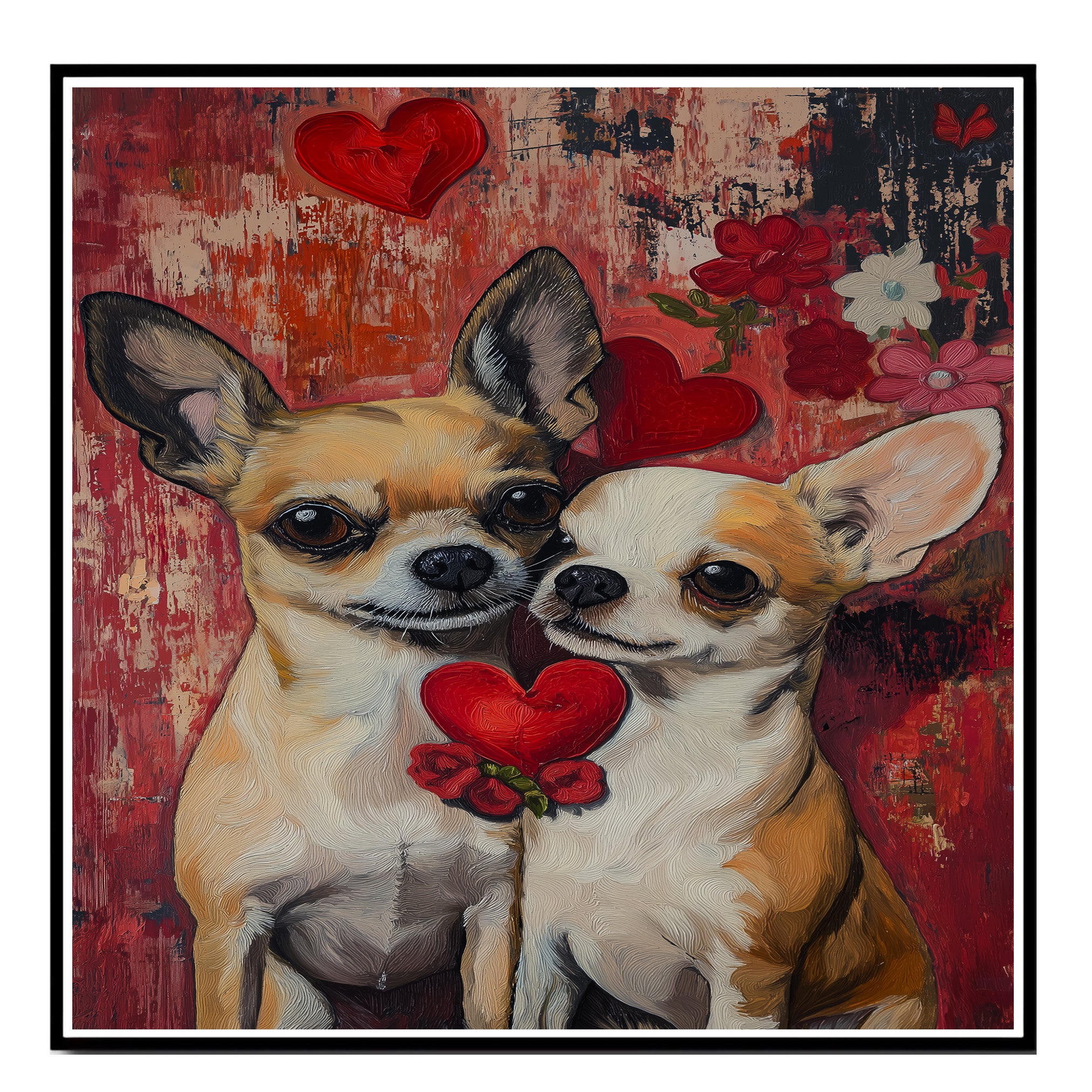 Celebrate the bond of love and loyalty with this charming painting featuring an adorable chihuahua couple surrounded by hearts and flowers. Set against a rustic red and black textured background, this heartwarming artwork is ideal for dog lovers, romantic spaces, or thoughtful gifts for special occasions.