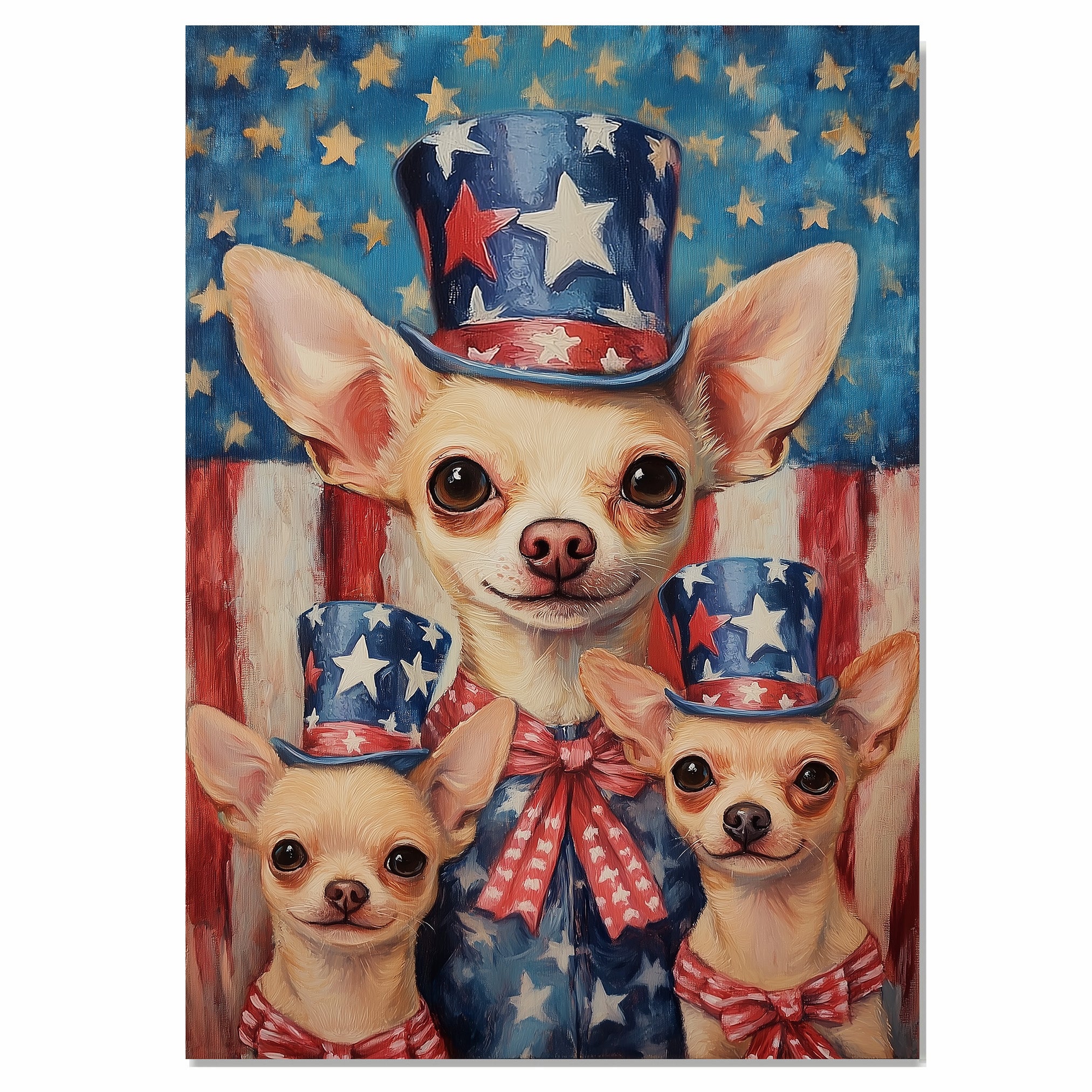 Add charm and personality to your space with this heartwarming oil-style painting of a proud Chihuahua mother and her two pups dressed in red, white, and blue. With star-spangled top hats and striped bow ties, this artwork is perfect for celebrating the Fourth of July or adding a whimsical Americana touch to any room. A delightful gift for dog lovers and patriotic souls alike.