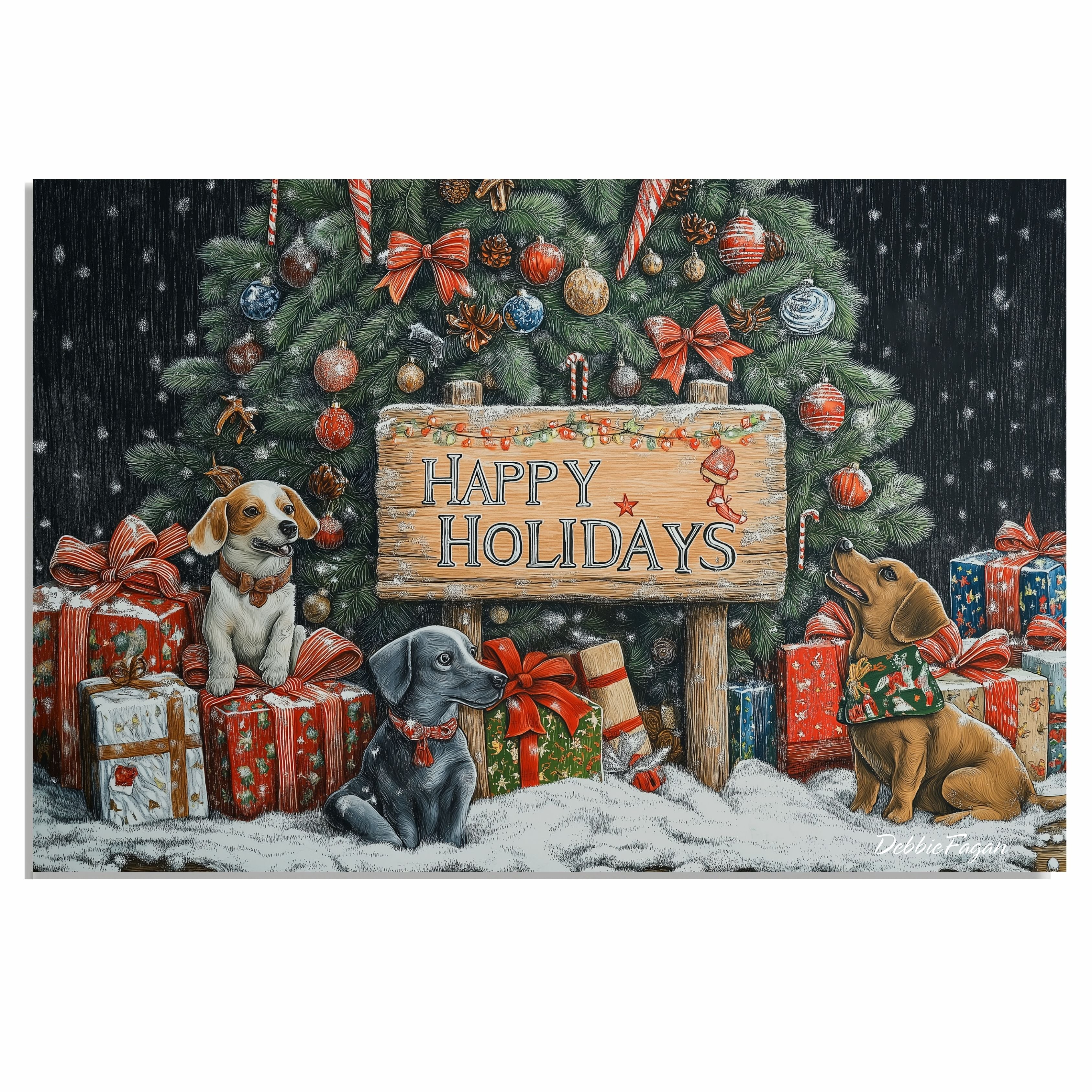Cute Pups Surrounded by Gifts Under the Christmas Tree in a Winter Wonderland Painting Our Puppy Wishes...