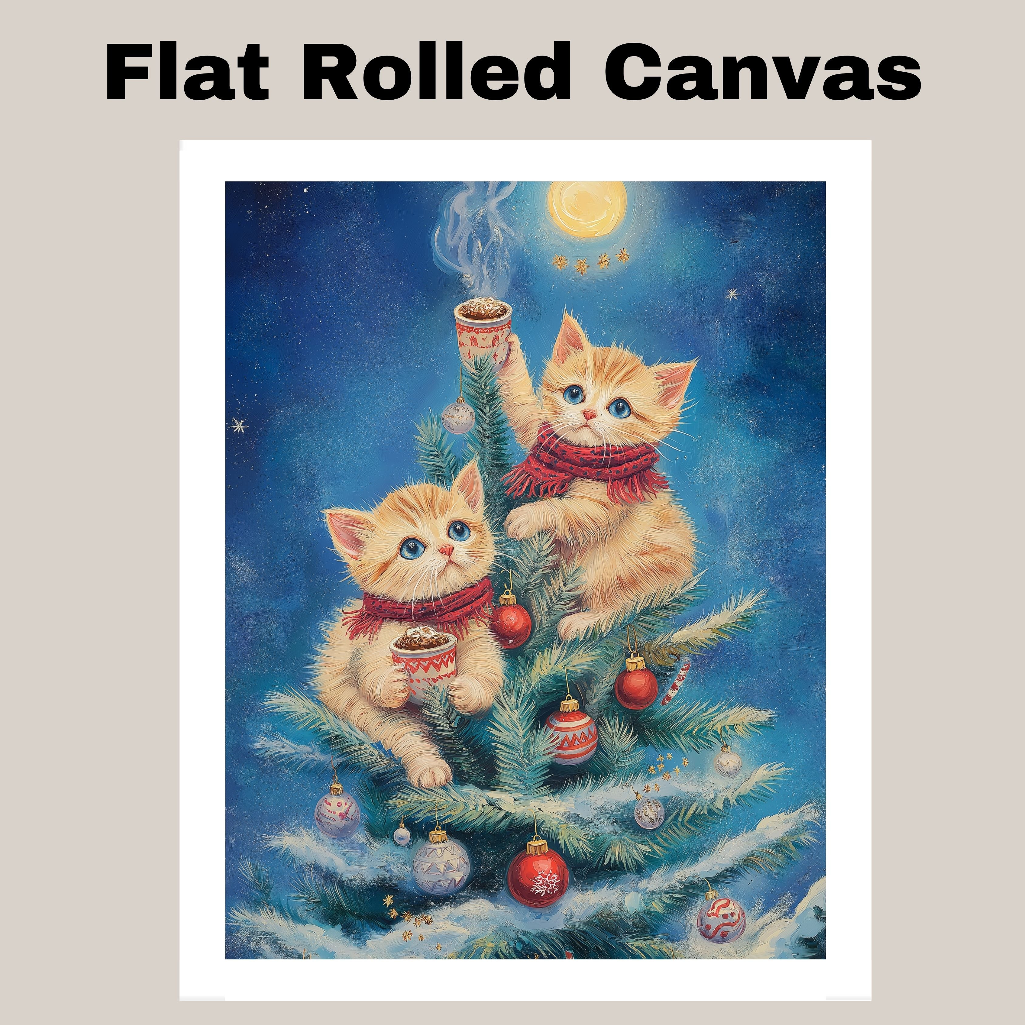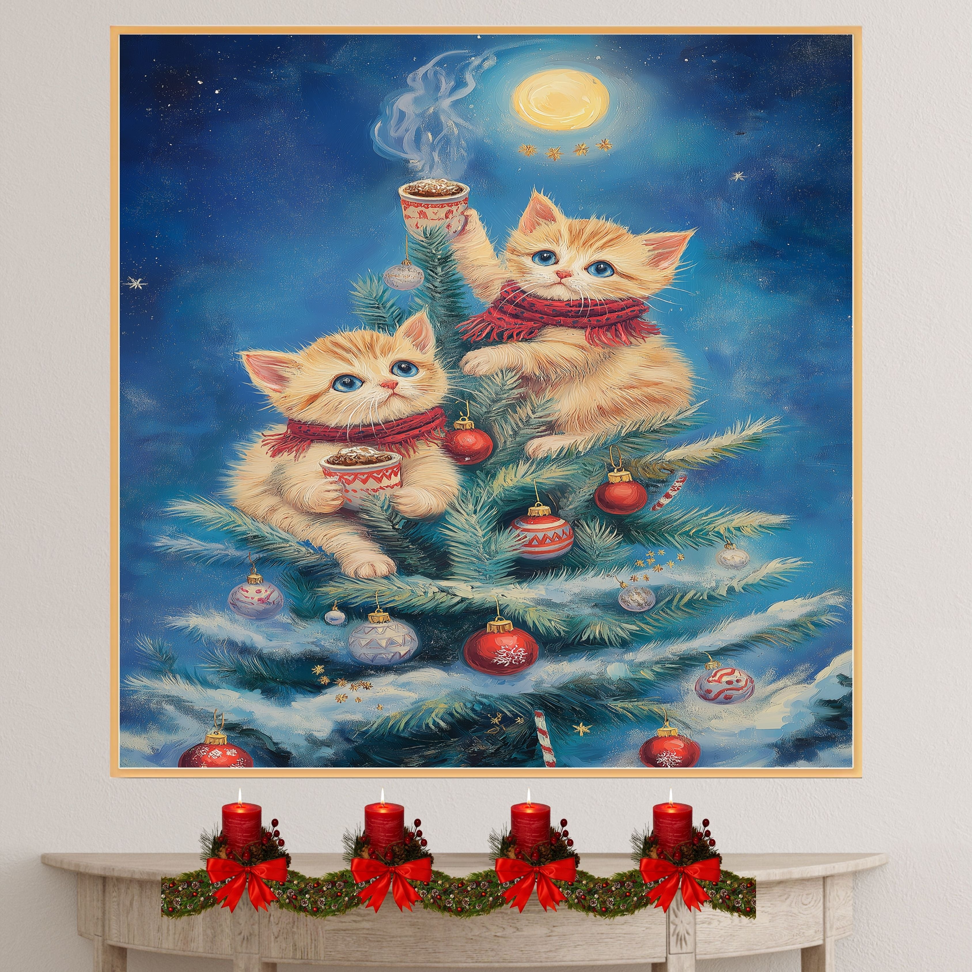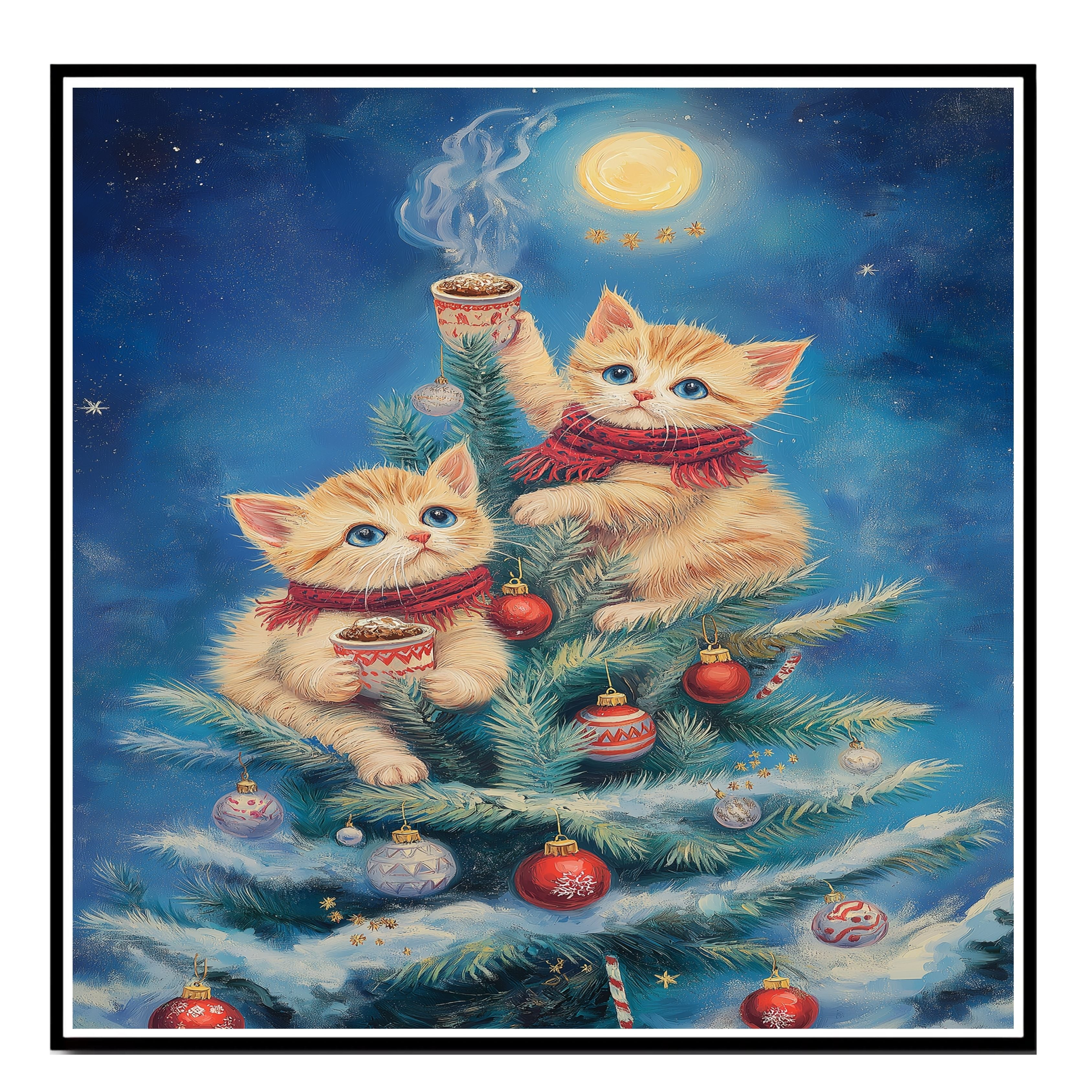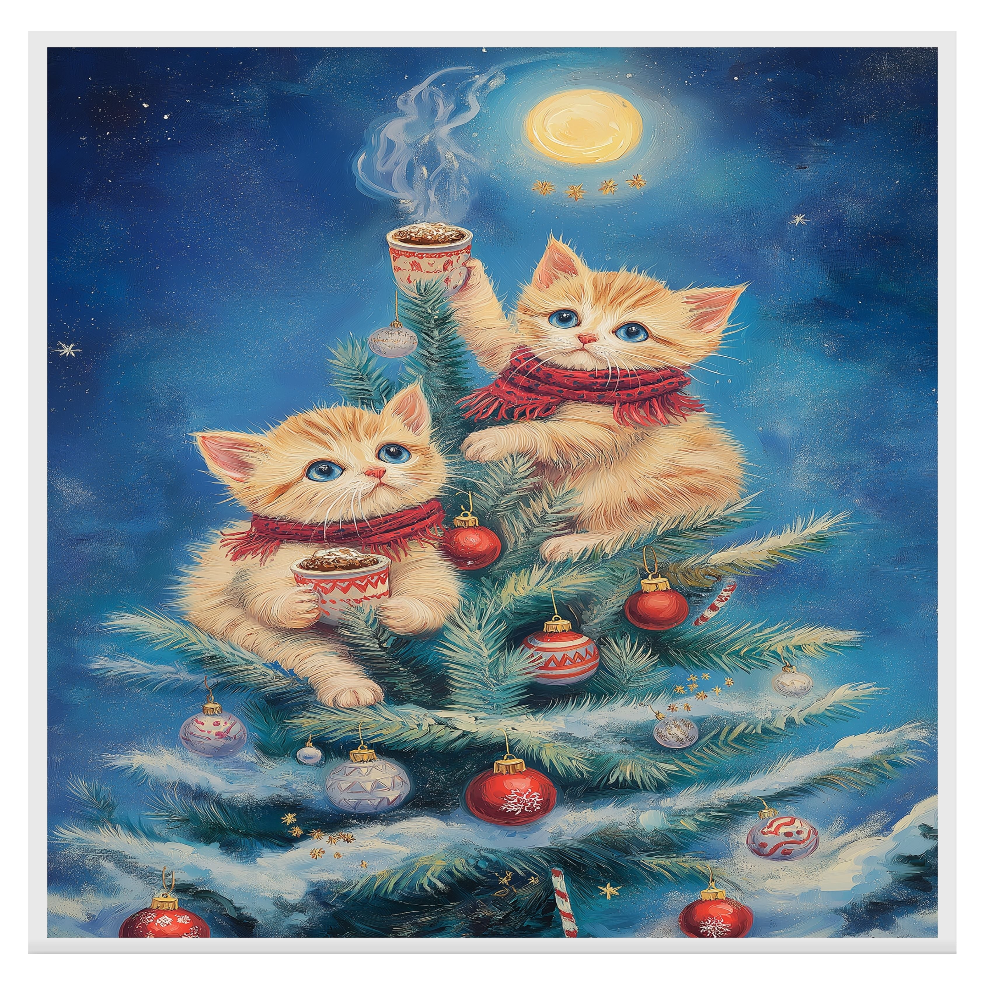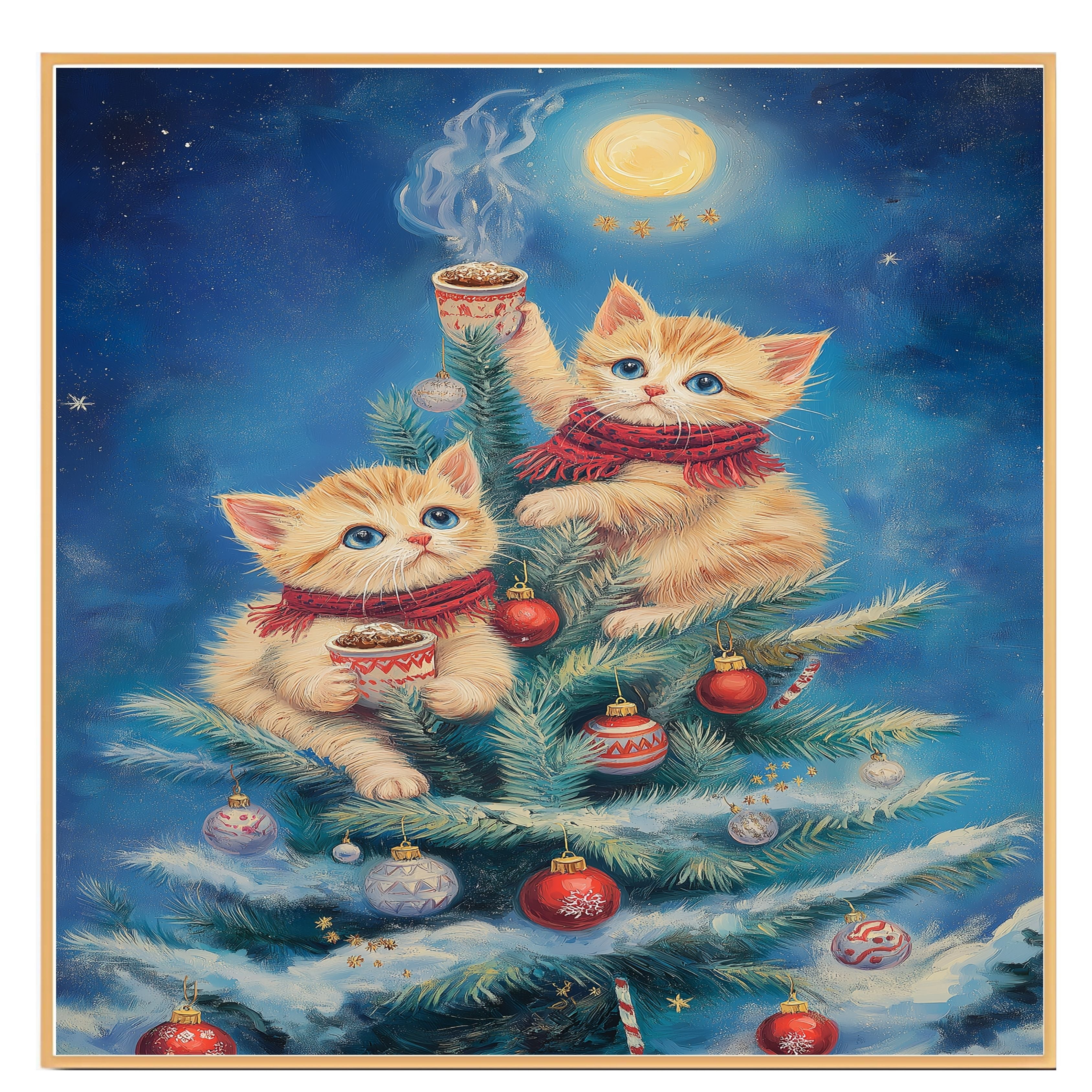 Bring charm and warmth to your holiday décor with this Christmas kittens canvas wall art! Featuring two adorable orange tabby kittens in a snow-dusted Christmas tree, sipping hot cocoa under a glowing moon, this whimsical painting is full of festive cheer. Perfect for cat lovers and cozy winter interiors, this print adds playful personality to your seasonal space.