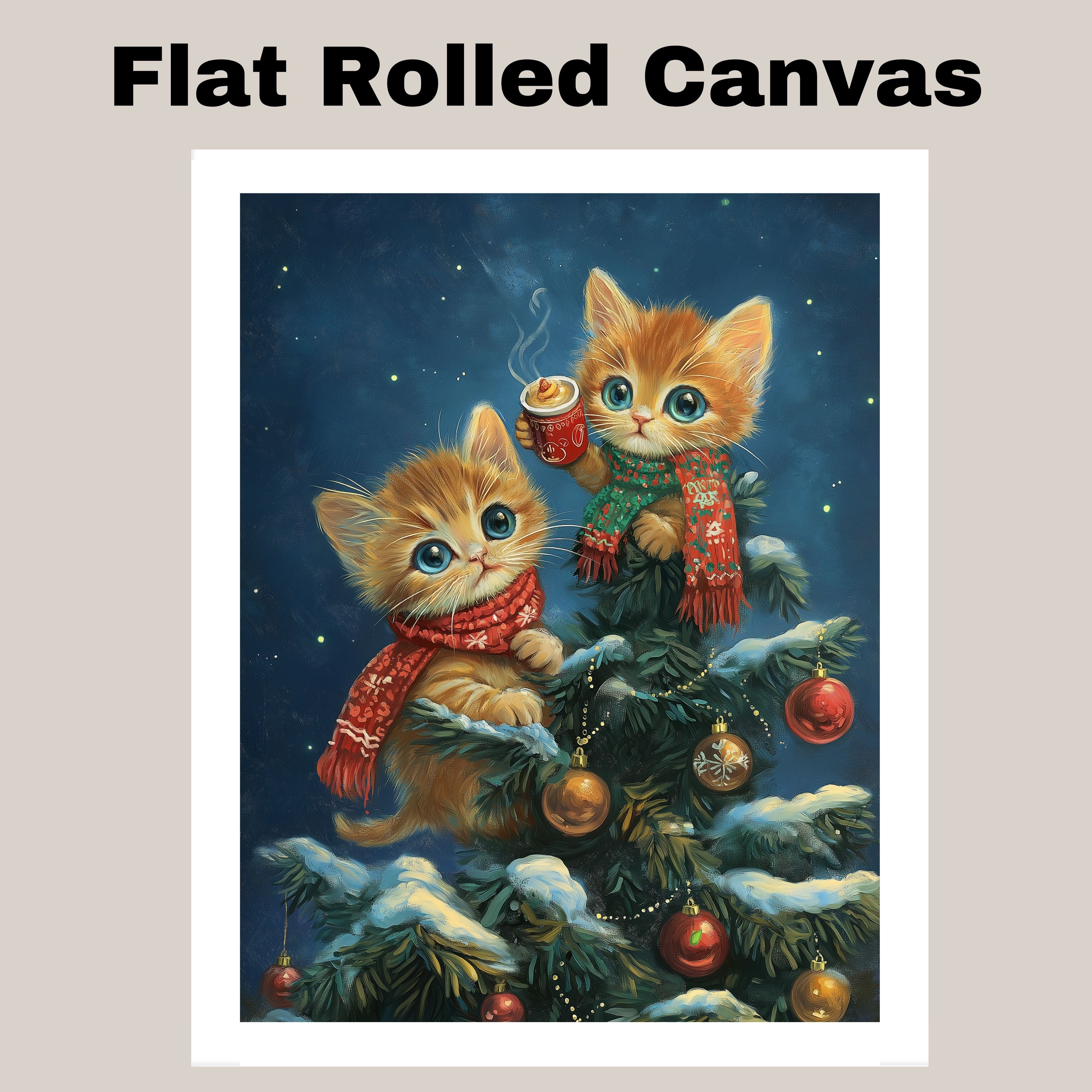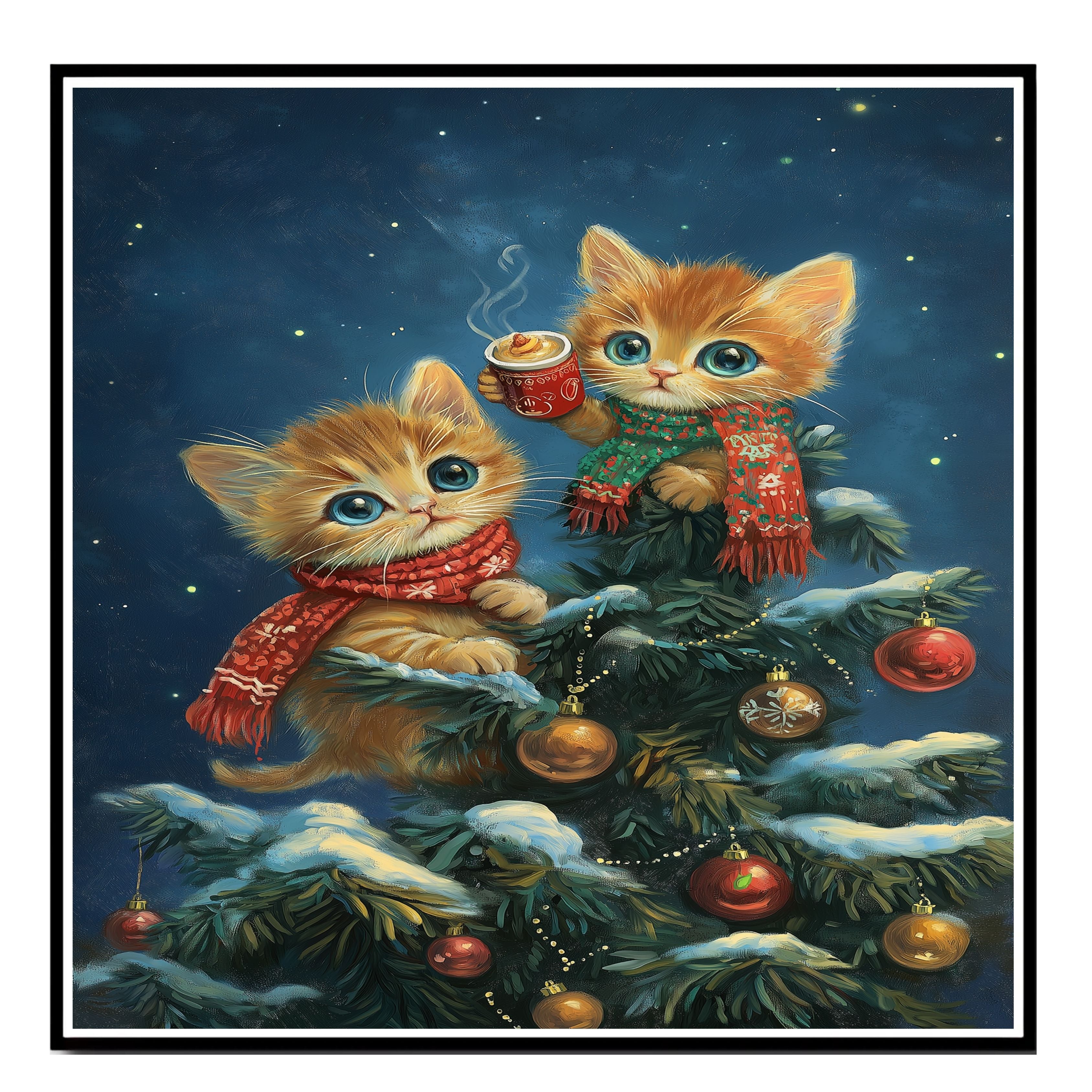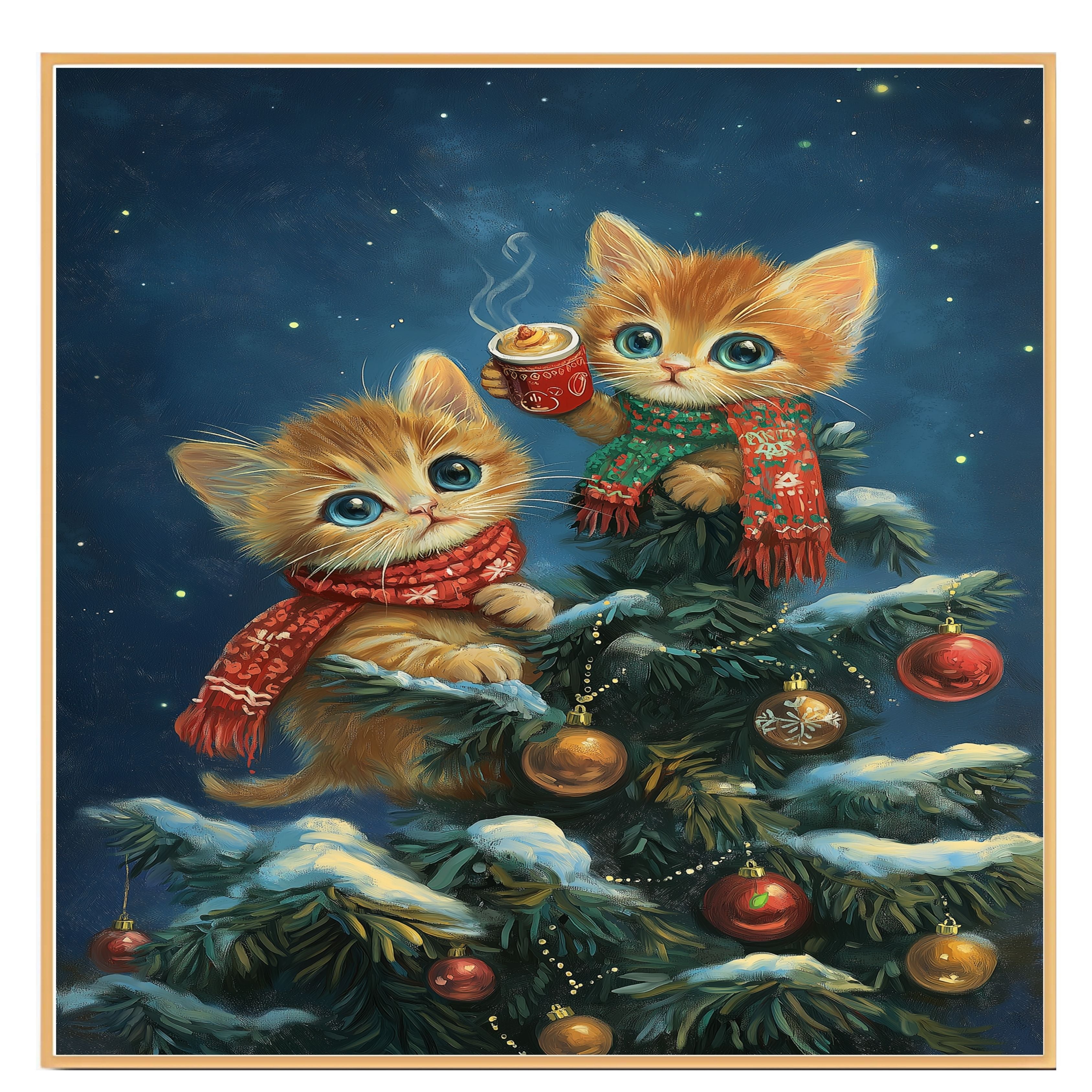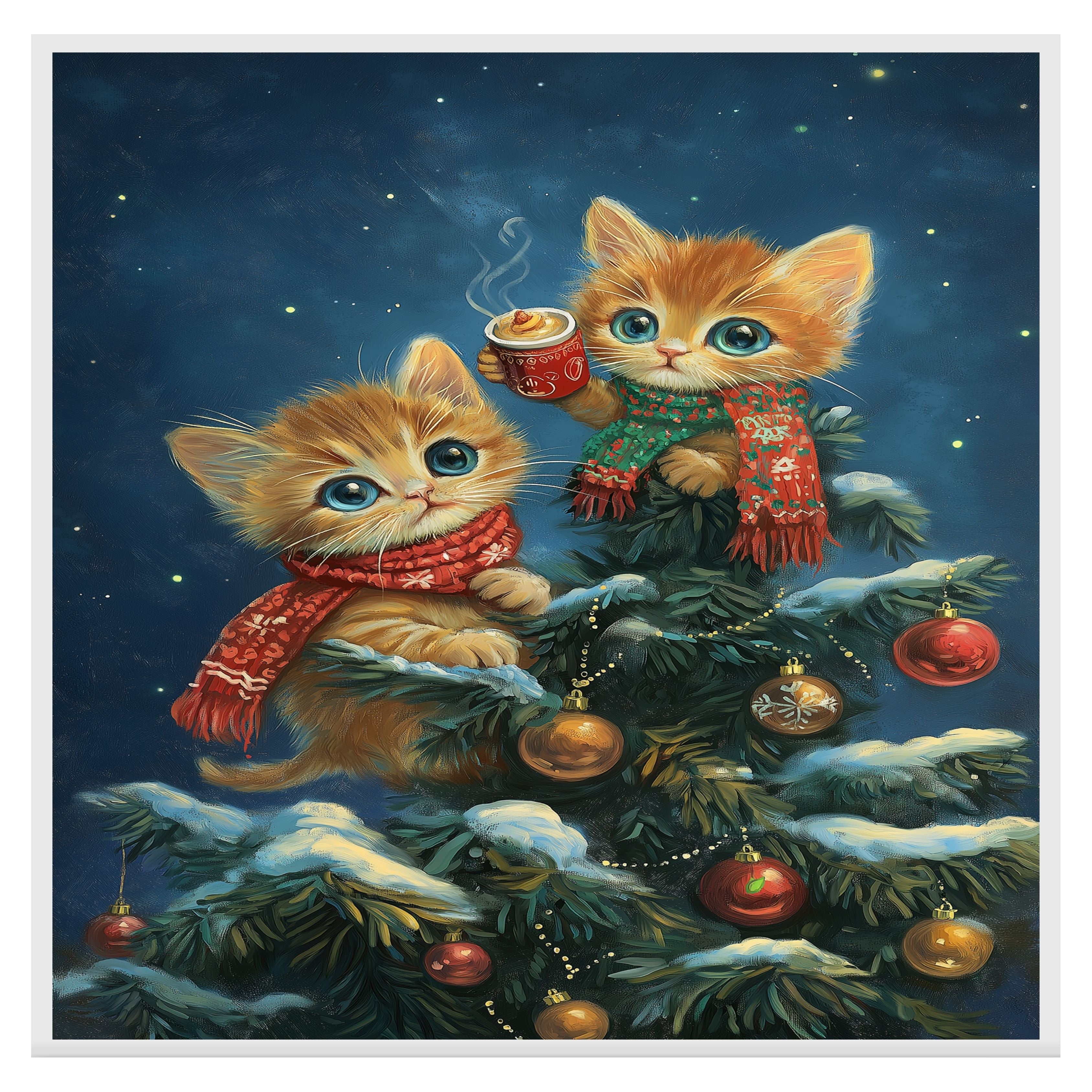 Warm up your holiday décor with this charming Christmas kittens canvas! Two fluffy orange tabby kittens, bundled in festive scarves, perch in a snow-covered Christmas tree adorned with red and gold ornaments. One holds a steaming mug of cocoa, creating a cozy wintertime vibe. Ideal for cat lovers, festive interiors, or as a heartwarming seasonal gift.