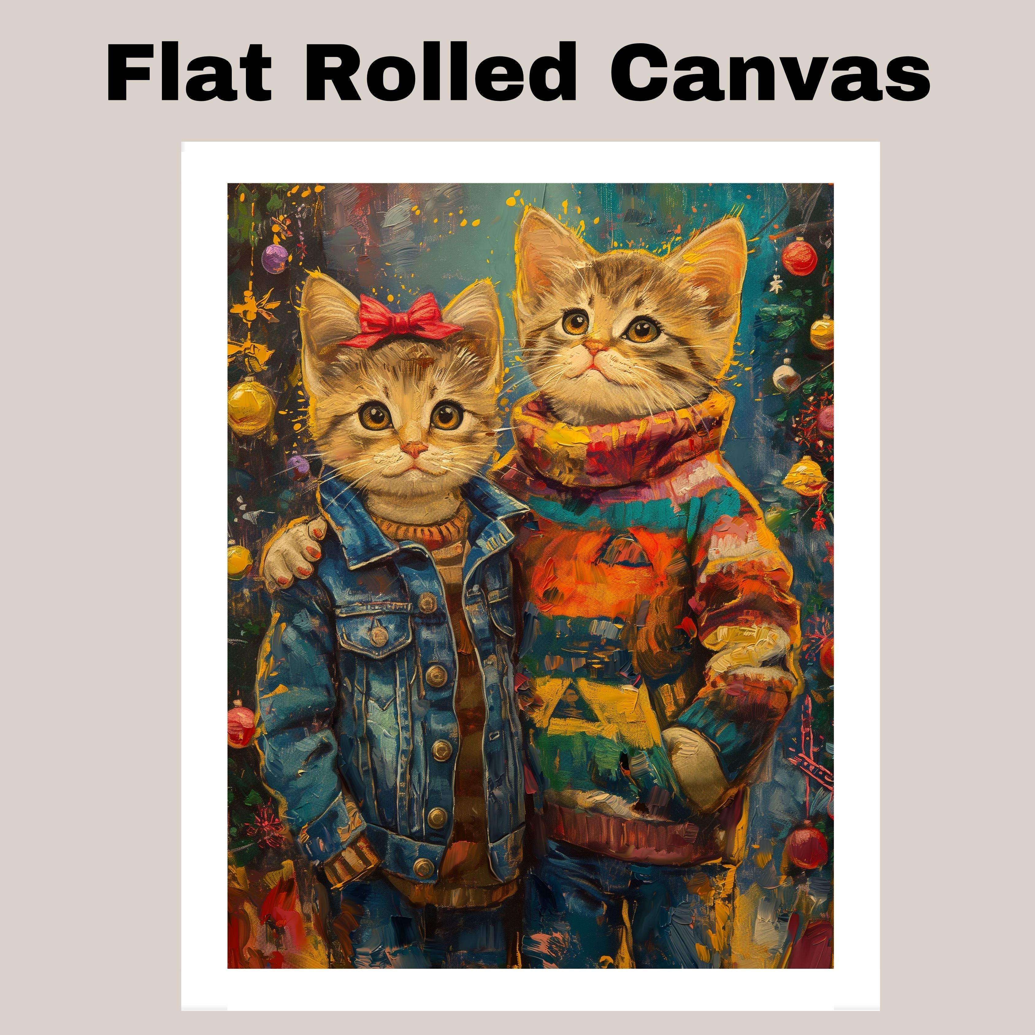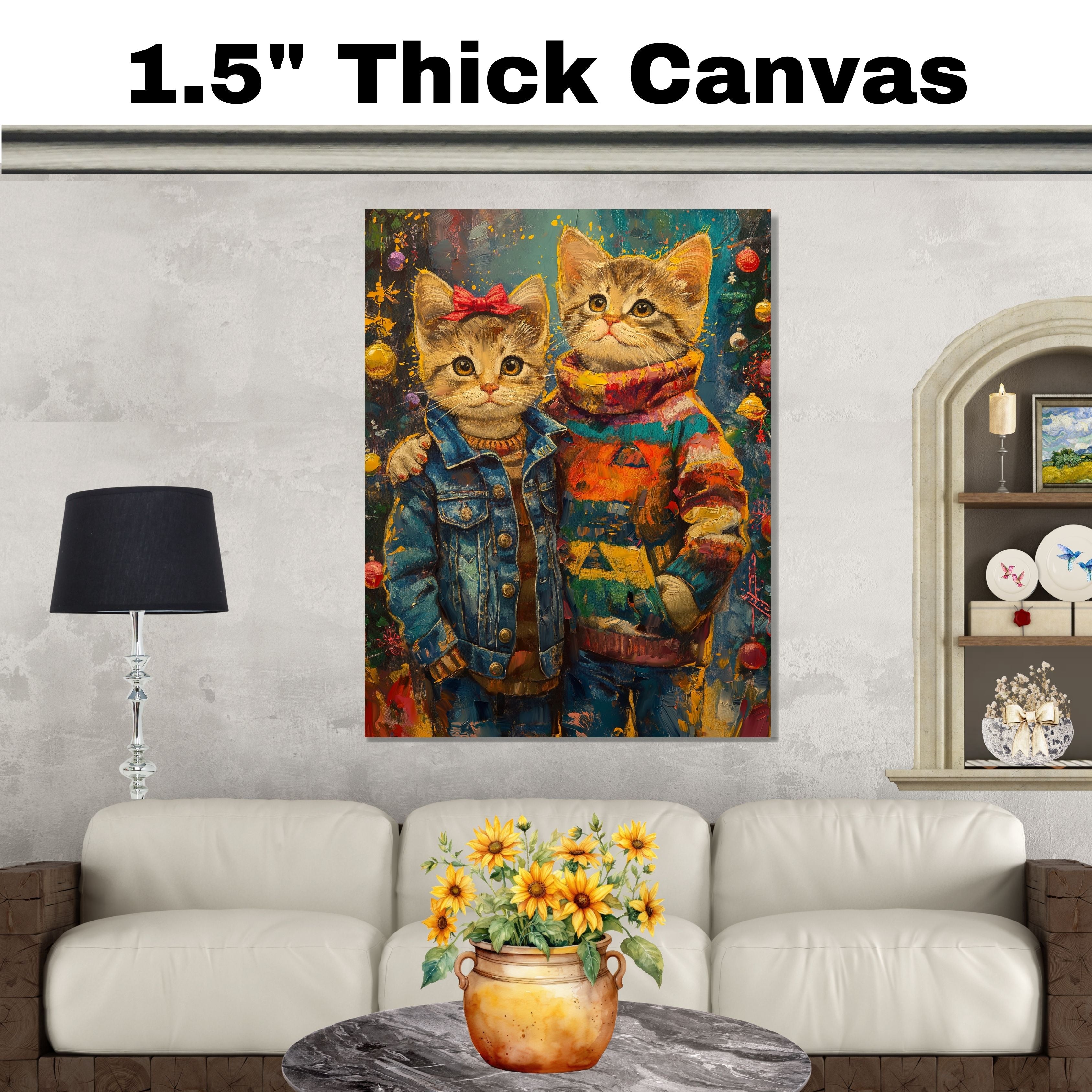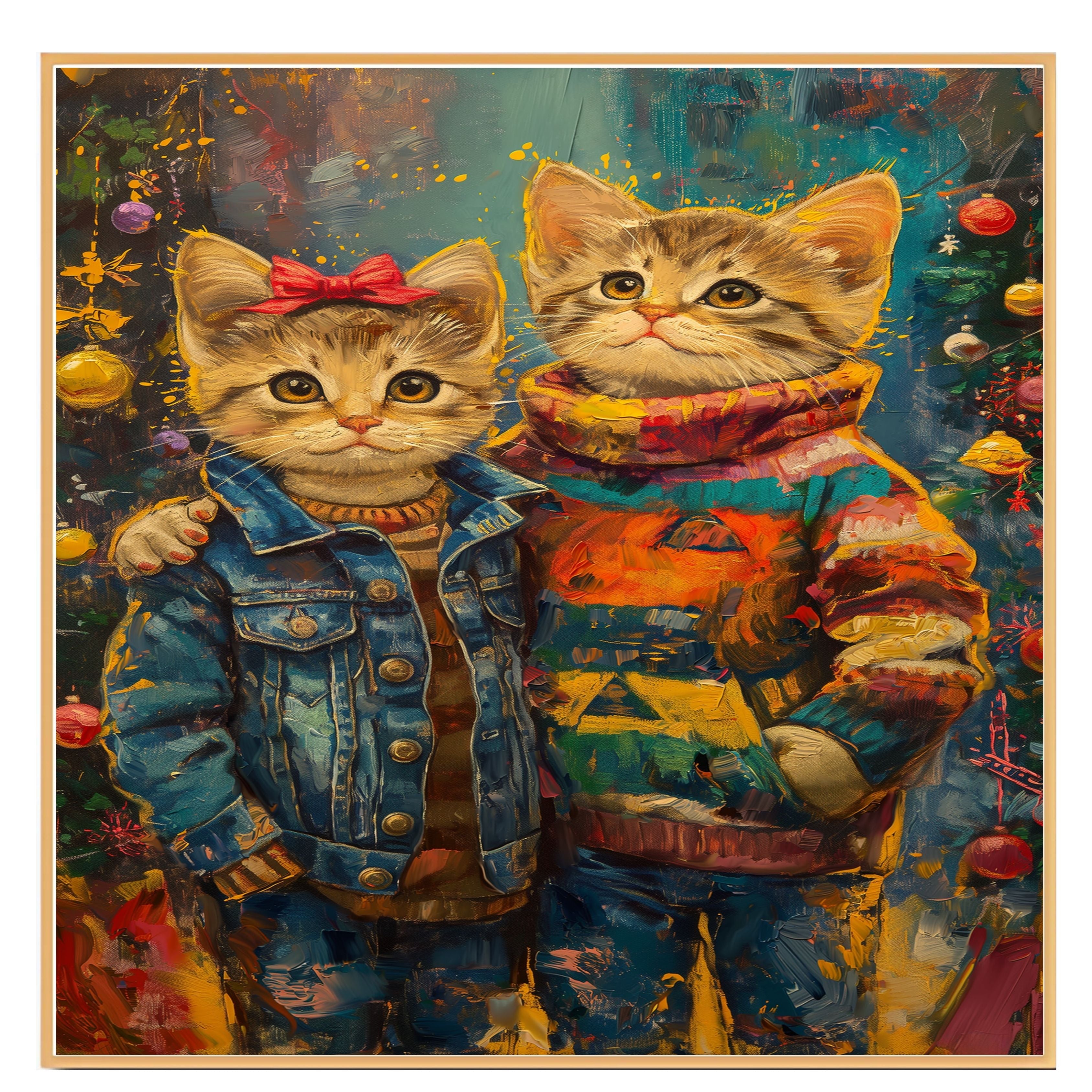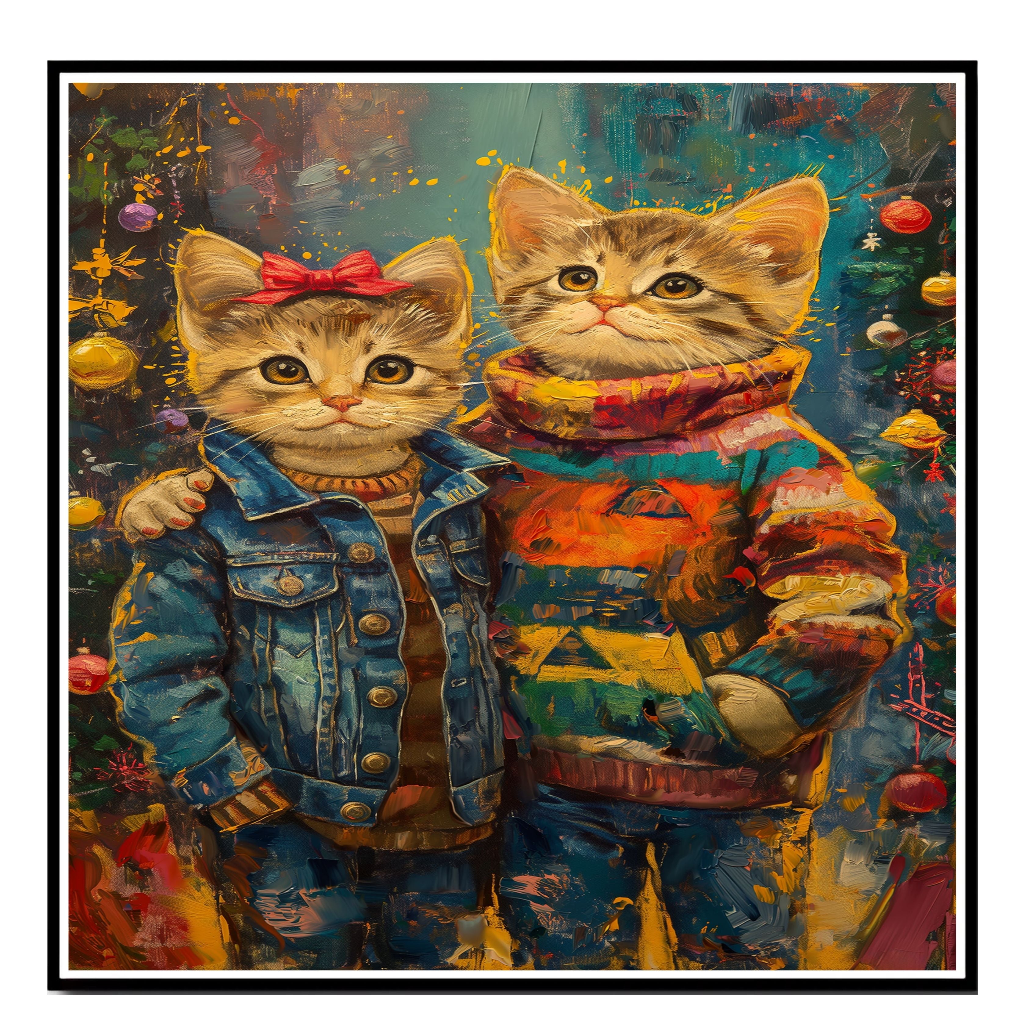 Celebrate the festive season with this delightful Christmas Kittens painting featuring two adorable kittens in cozy denim jackets and colorful sweaters, surrounded by holiday decorations. This heartwarming artwork brings playful charm, warmth, and vibrant holiday spirit to any room. Ideal for cozy home decor, office spaces, or as a thoughtful Christmas gift for cat lovers, this cheerful piece captures the magical joy of winter celebrations beautifully.