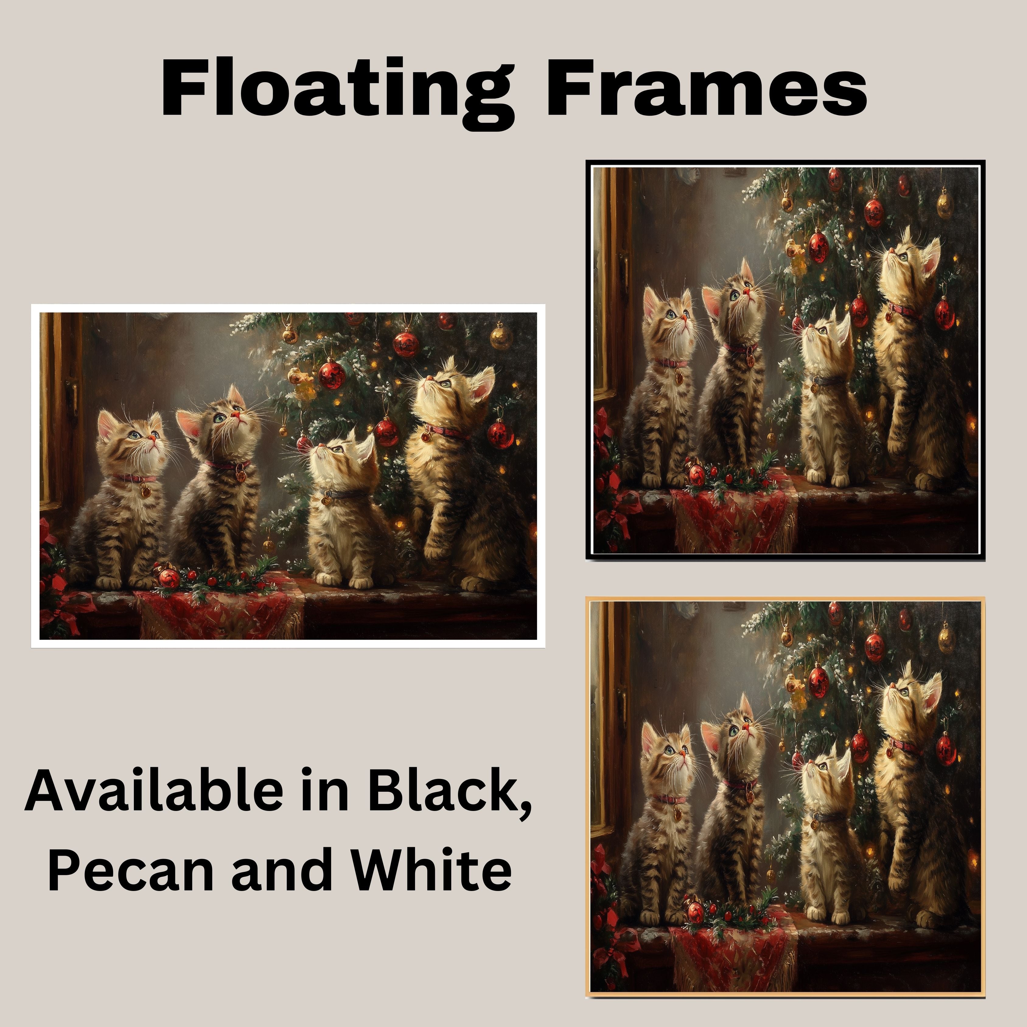 Christmas Magic: Four Adorable Kittens Under the Tree Retro Holiday Painting on Ready to Hang 1.5" Thick Canvas Wrap, Floating Framed Canvas, Flat Rolled Canvas
