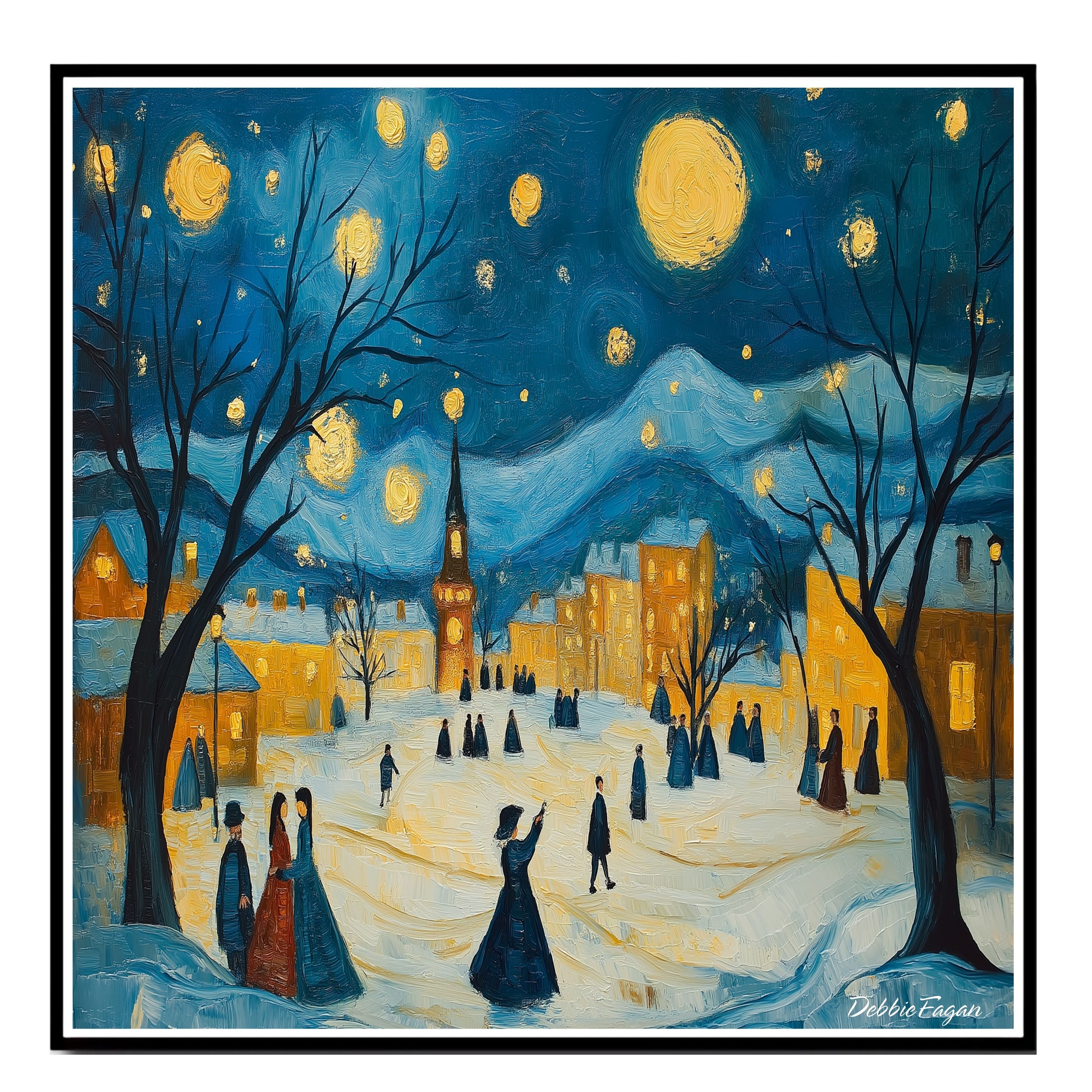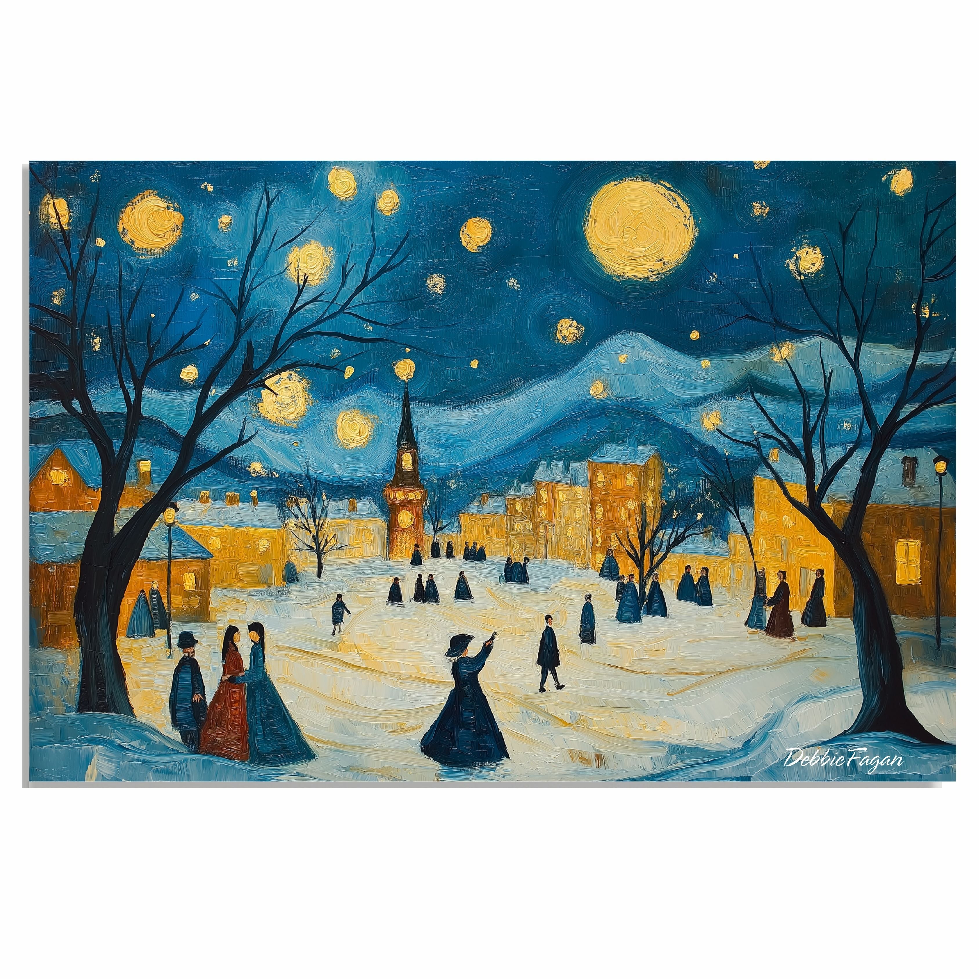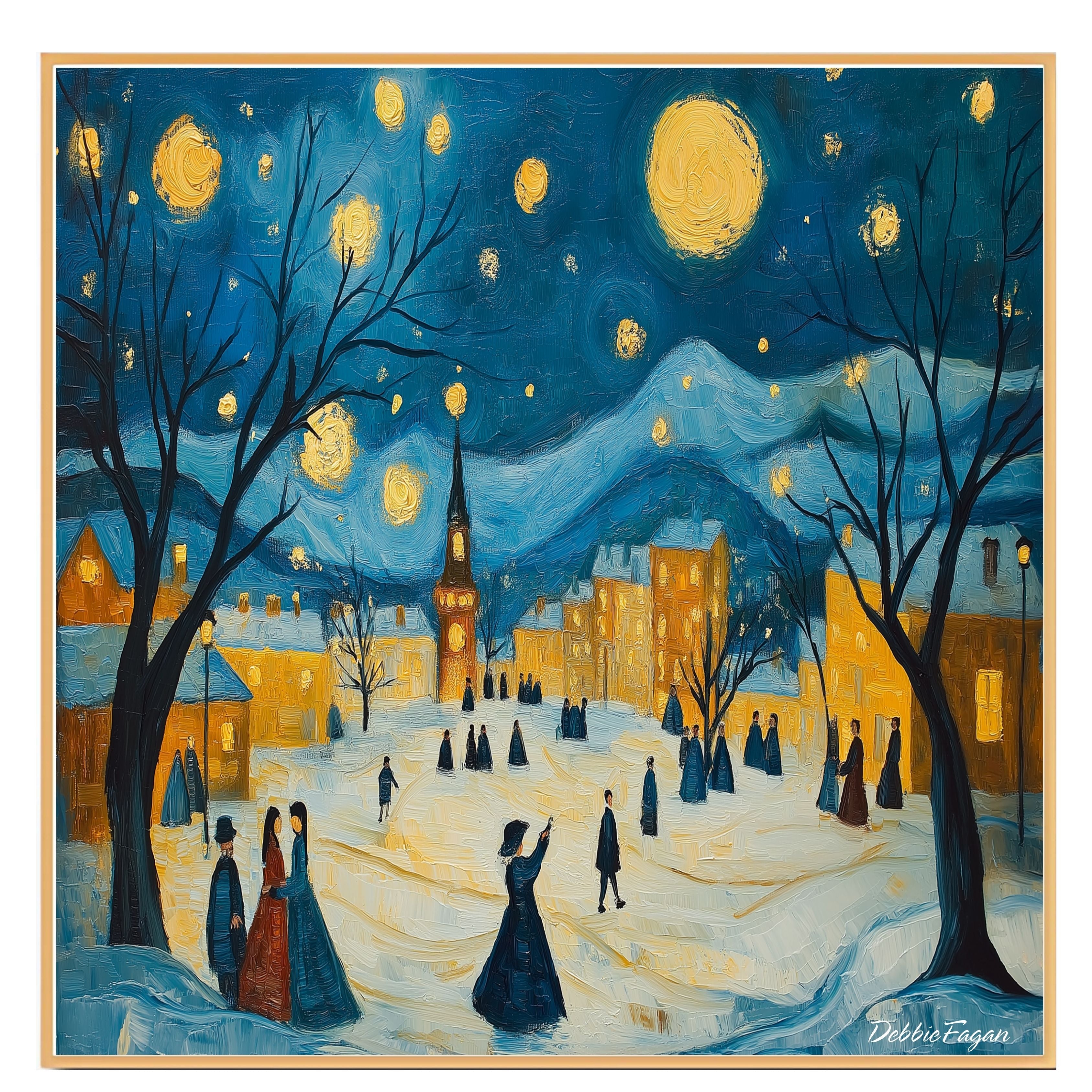 Charming winter scene in the style of Van Gogh, featuring villagers strolling under a star-lit sky in a glowing Christmas village square.