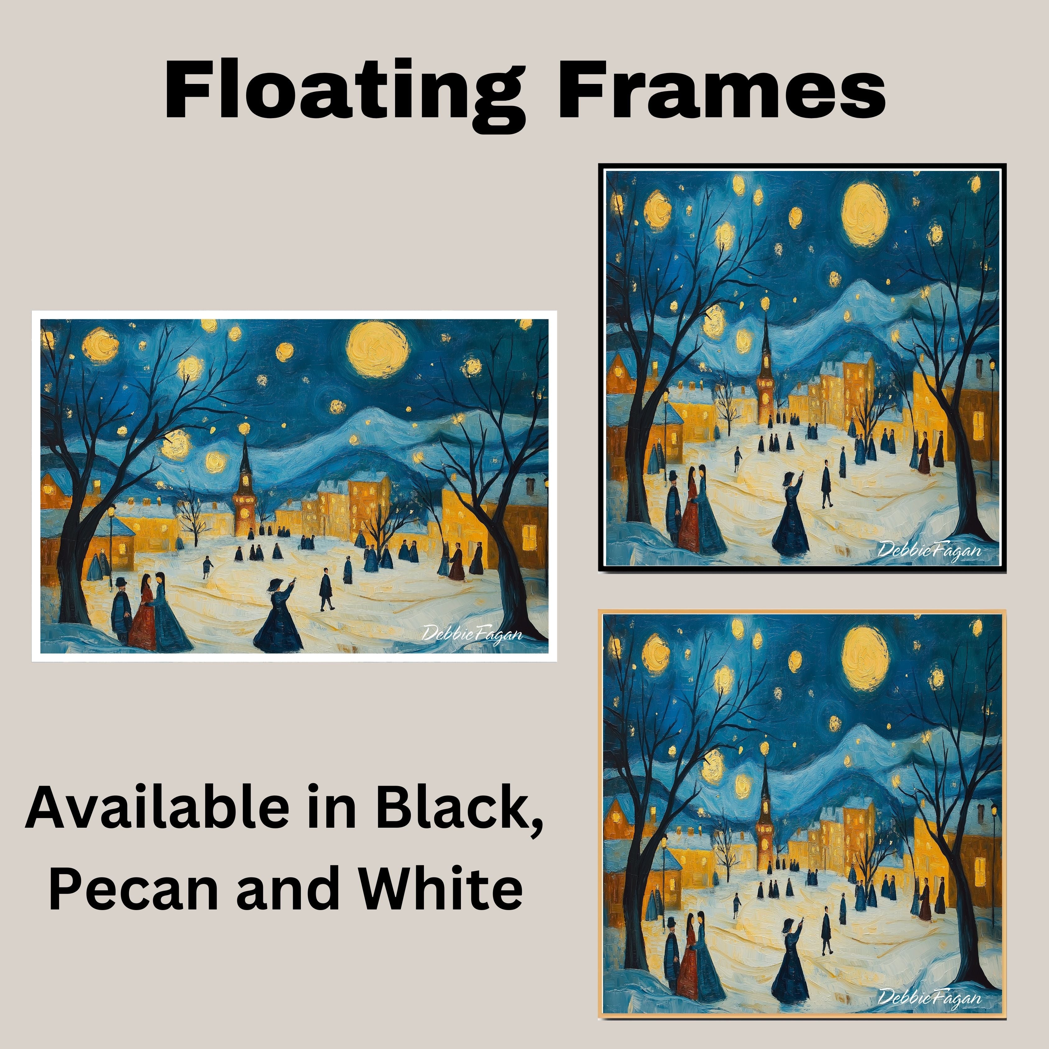 1.5" Thick Floating Framed Canvas: Available in Black, Pecan, and White Grain. Durable shrink-resistant frame. Comes with easy-to-install hanging kits, ready for immediate display.