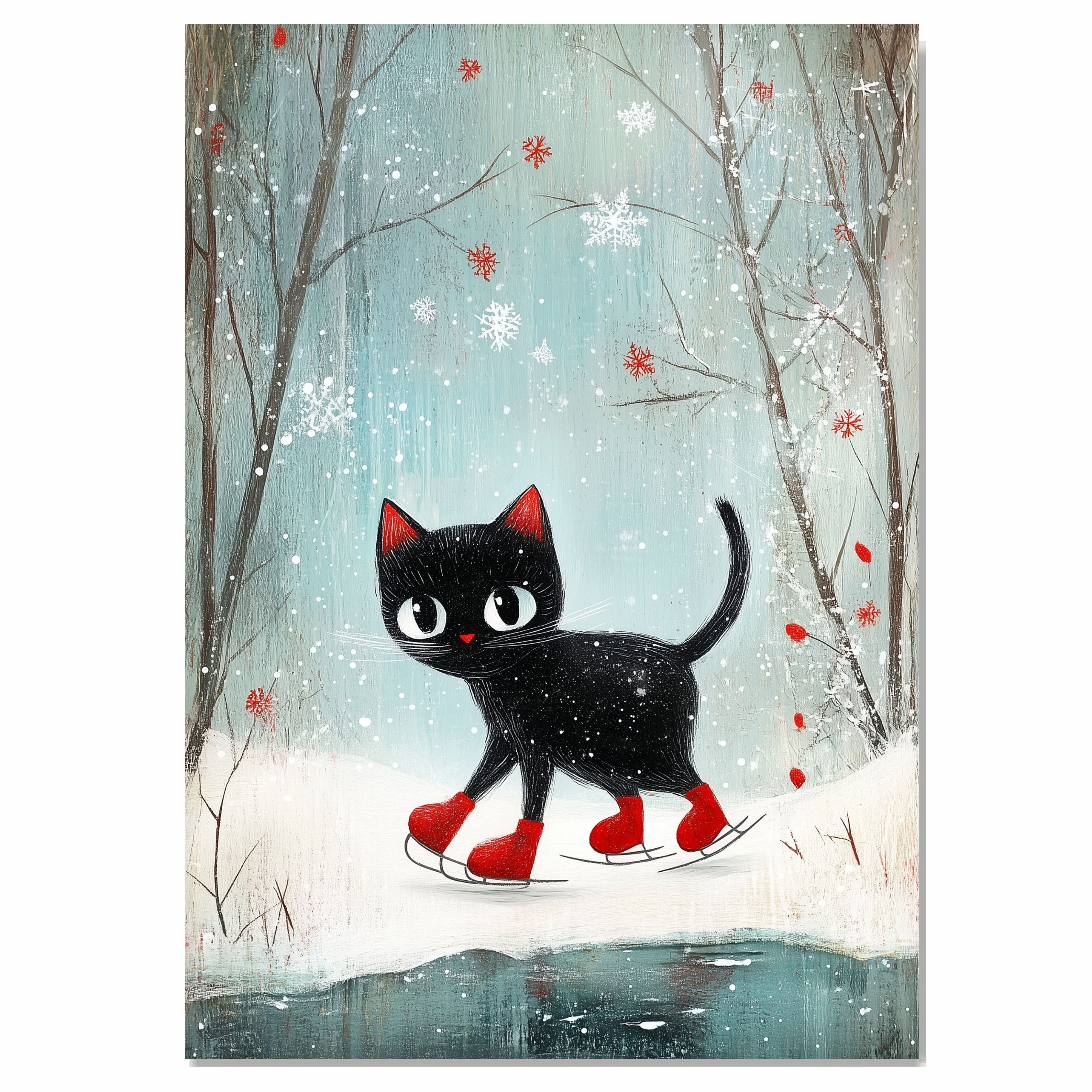 Celebrate the winter season with this playful Christmas wall art featuring a wide-eyed black cat gliding across a frozen pond in bright red skates. Surrounded by snowflakes and bare trees, this whimsical illustration radiates festive cheer and cozy charm. A perfect addition to holiday décor or a thoughtful gift for cat lovers.