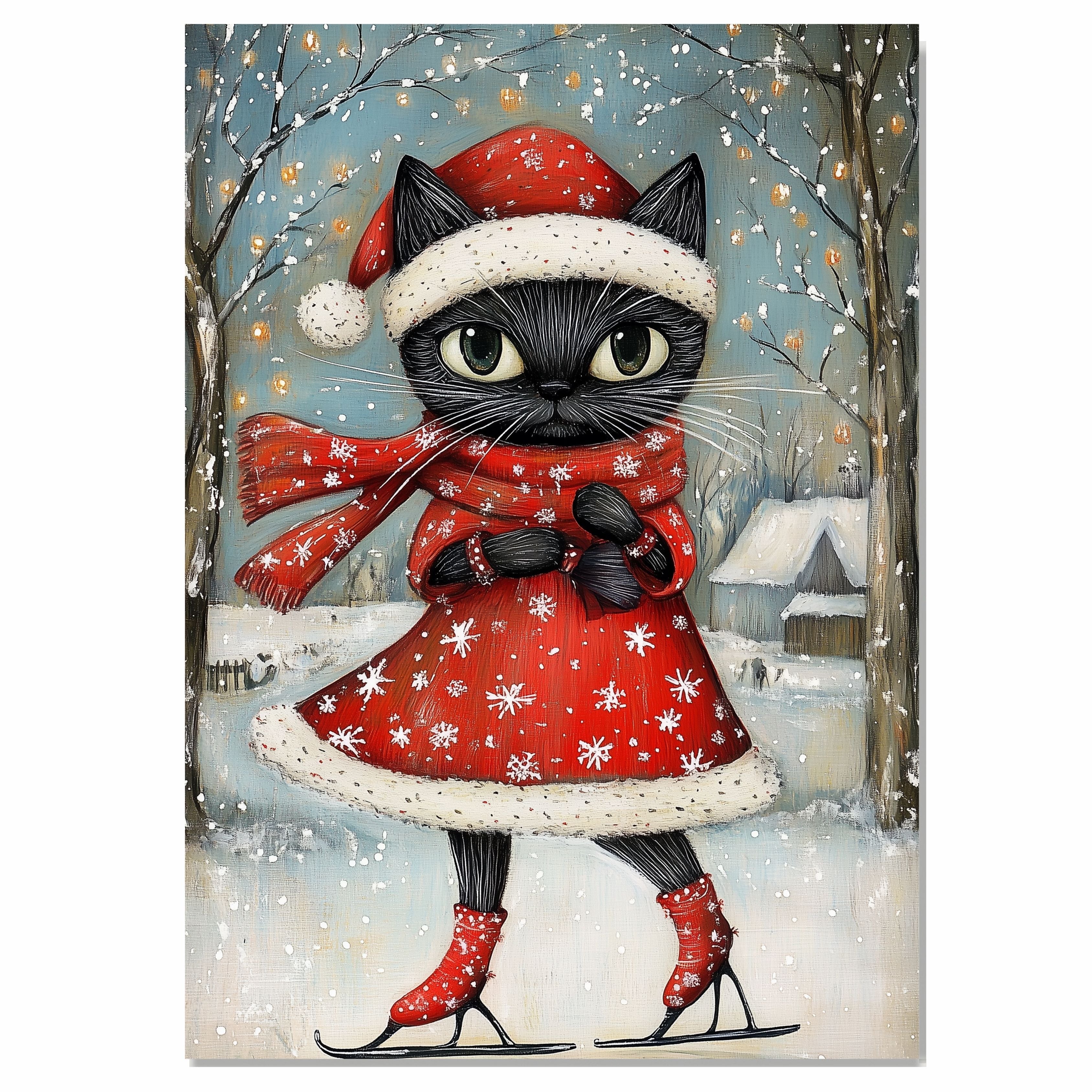Bring cozy holiday cheer to your space with this whimsical Christmas wall art featuring a wide-eyed black cat dressed in a red Santa outfit and ice skates. Set against a softly lit snowy forest, this heartwarming illustration is perfect for cat lovers and festive décor enthusiasts. A playful and charming addition to any winter or Christmas-themed home.