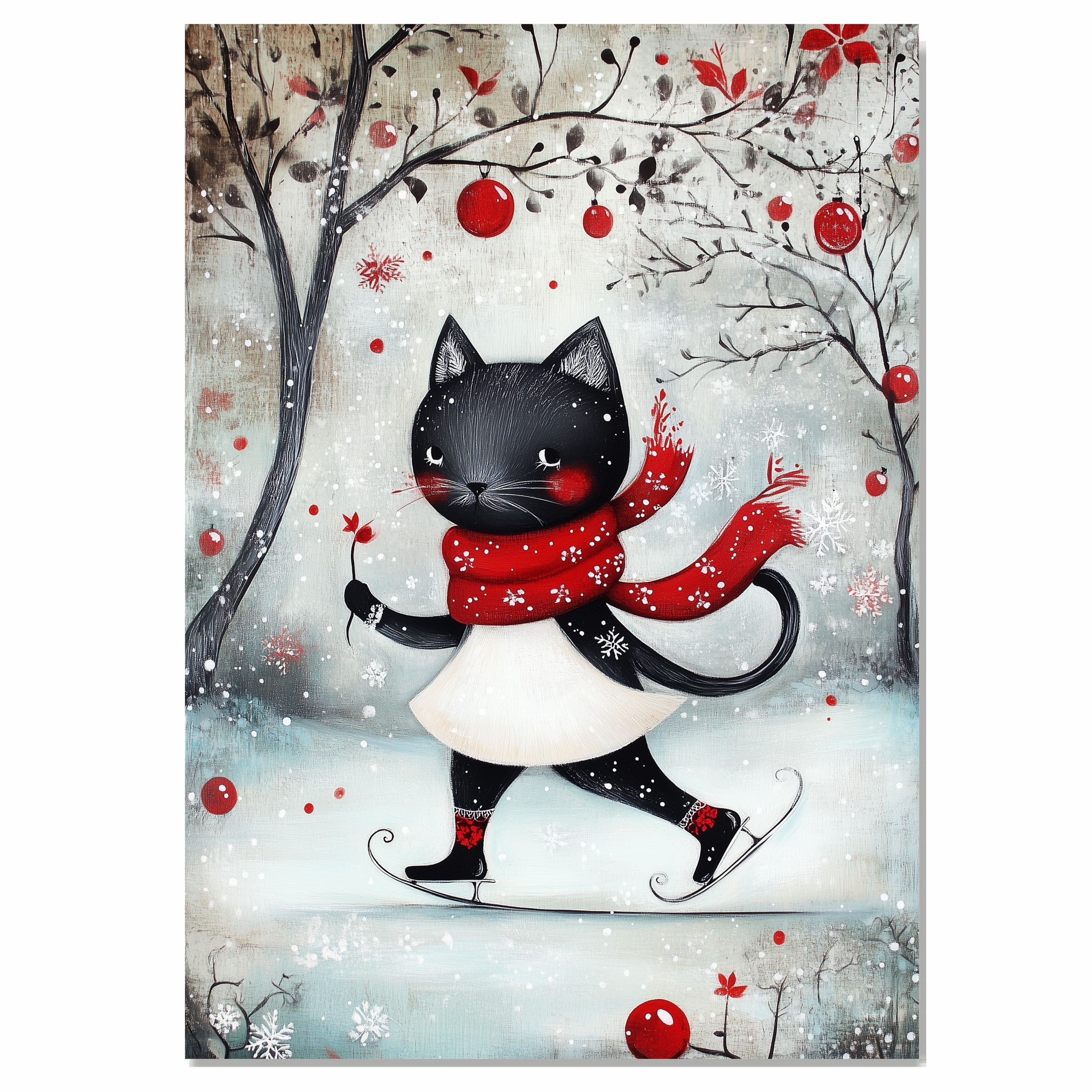 Celebrate the magic of the season with this charming Christmas wall art featuring a sweet black cat ice skating through a snowy forest. Dressed in a red scarf and white dress, this whimsical illustration captures cozy winter vibes and playful holiday charm. Perfect for cat lovers, seasonal decorators, or anyone who appreciates heartwarming festive art.