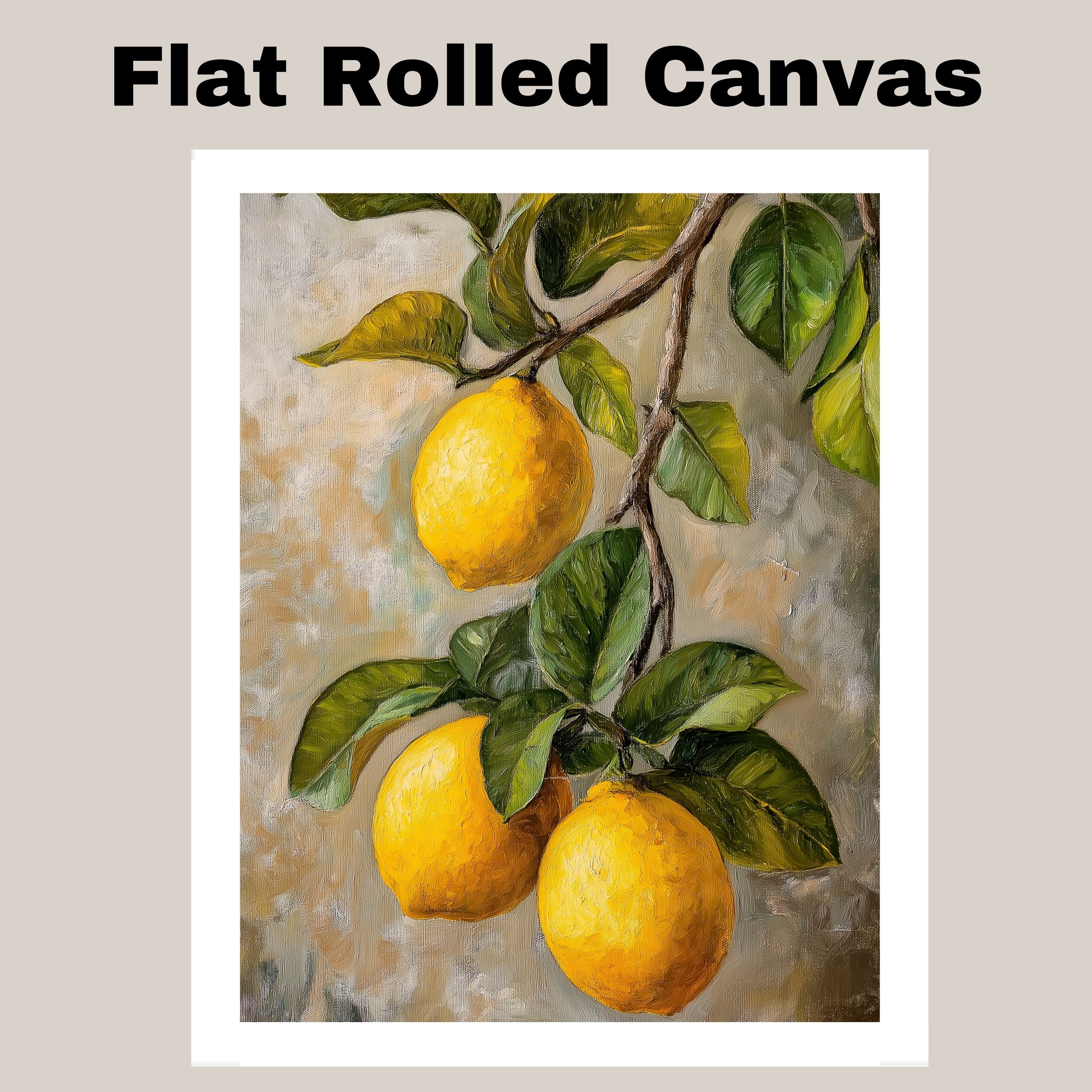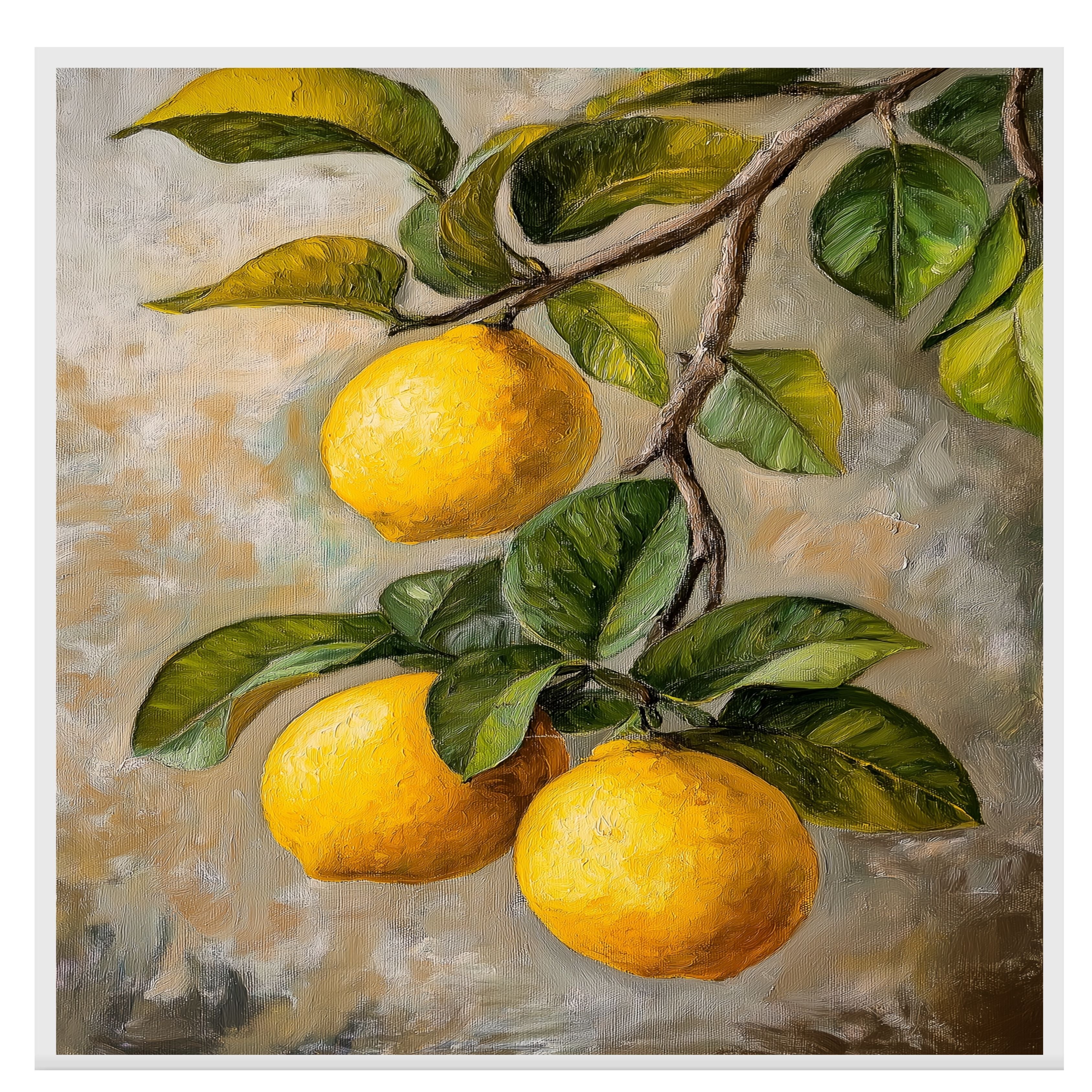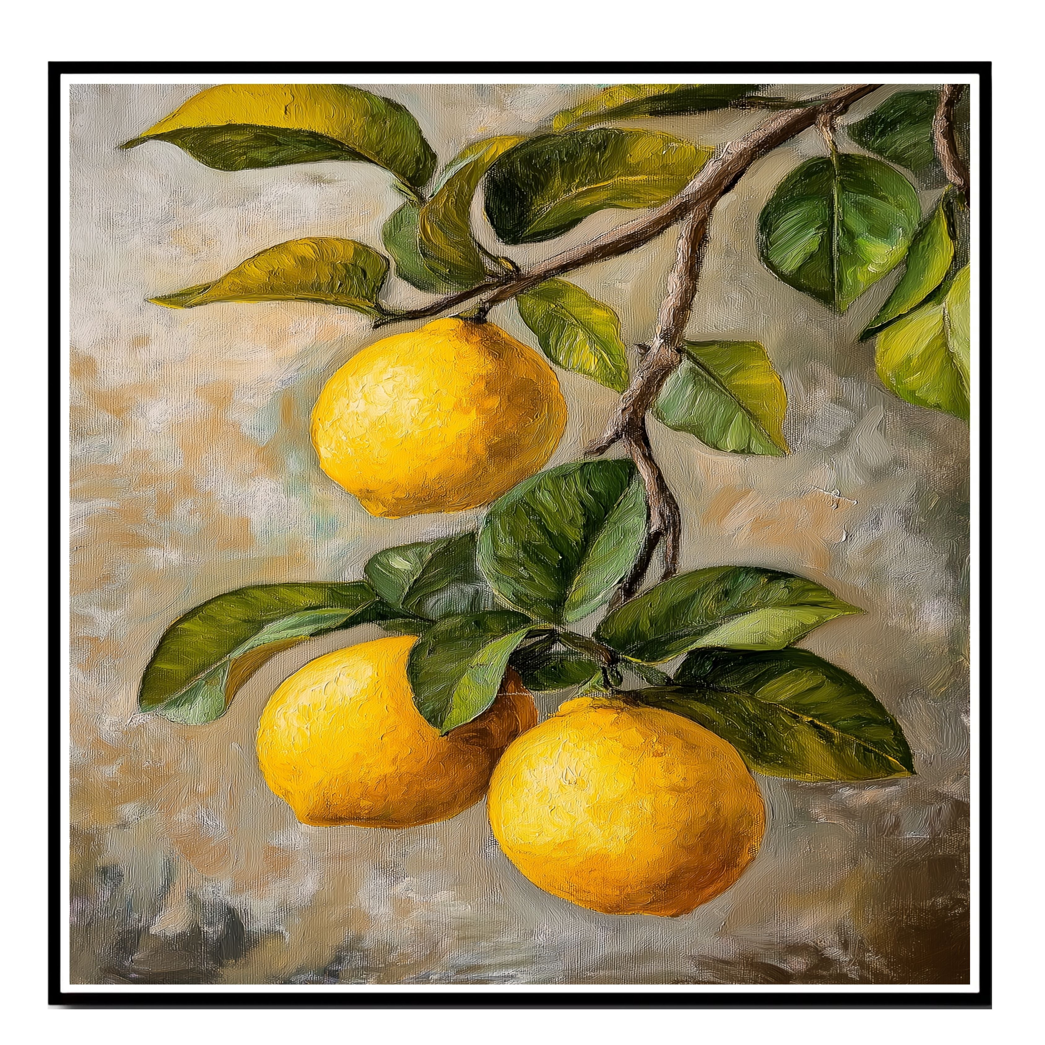 This detailed vintage-inspired painting highlights a close-up view of bright yellow lemons hanging from a leafy branch, rendered with rich textures and warm tones. Ideal for kitchens, dining rooms, or farmhouse-style interiors, this citrus-themed artwork adds a vibrant and rustic charm to any space. A perfect gift or accent for fruit lovers and botanical art collectors.
