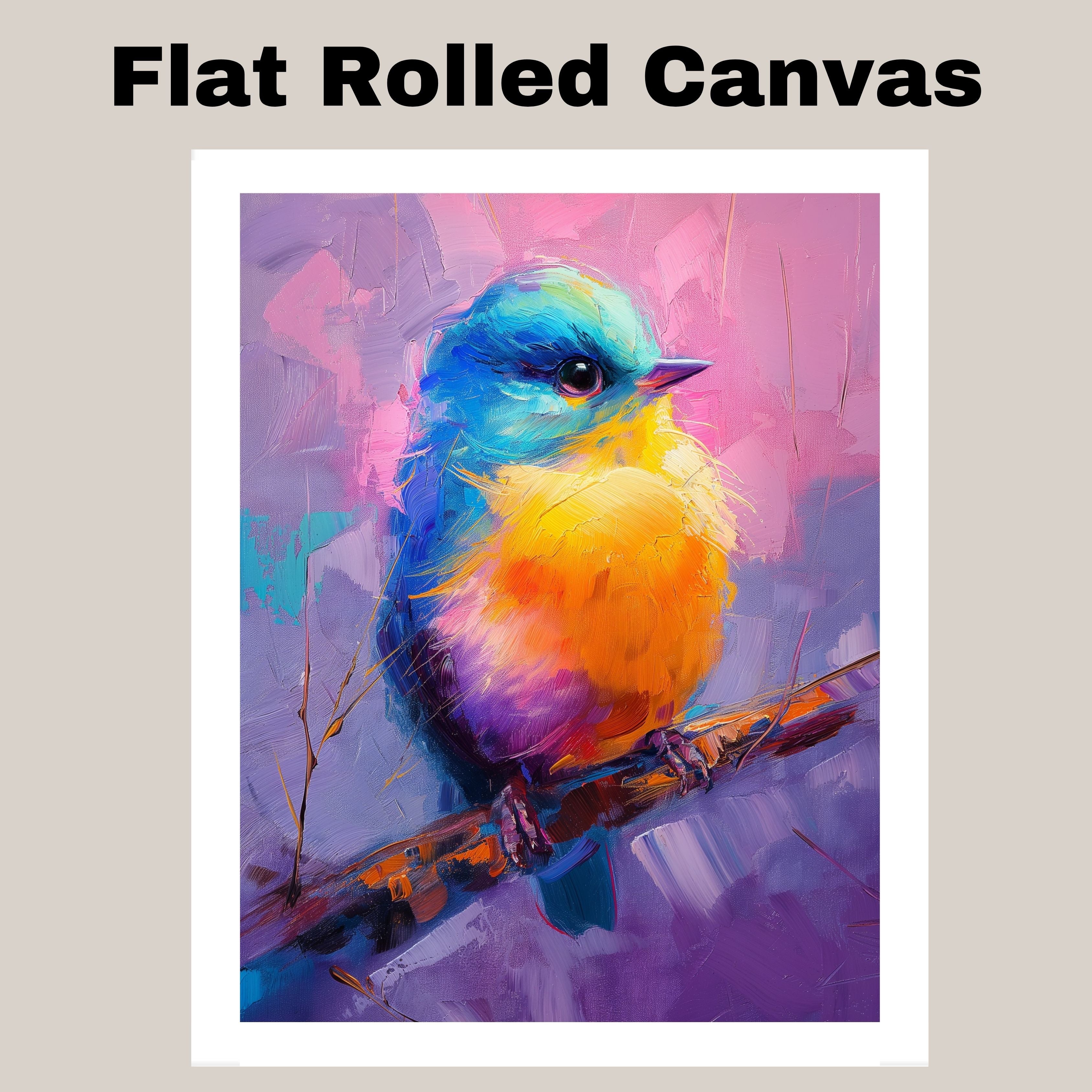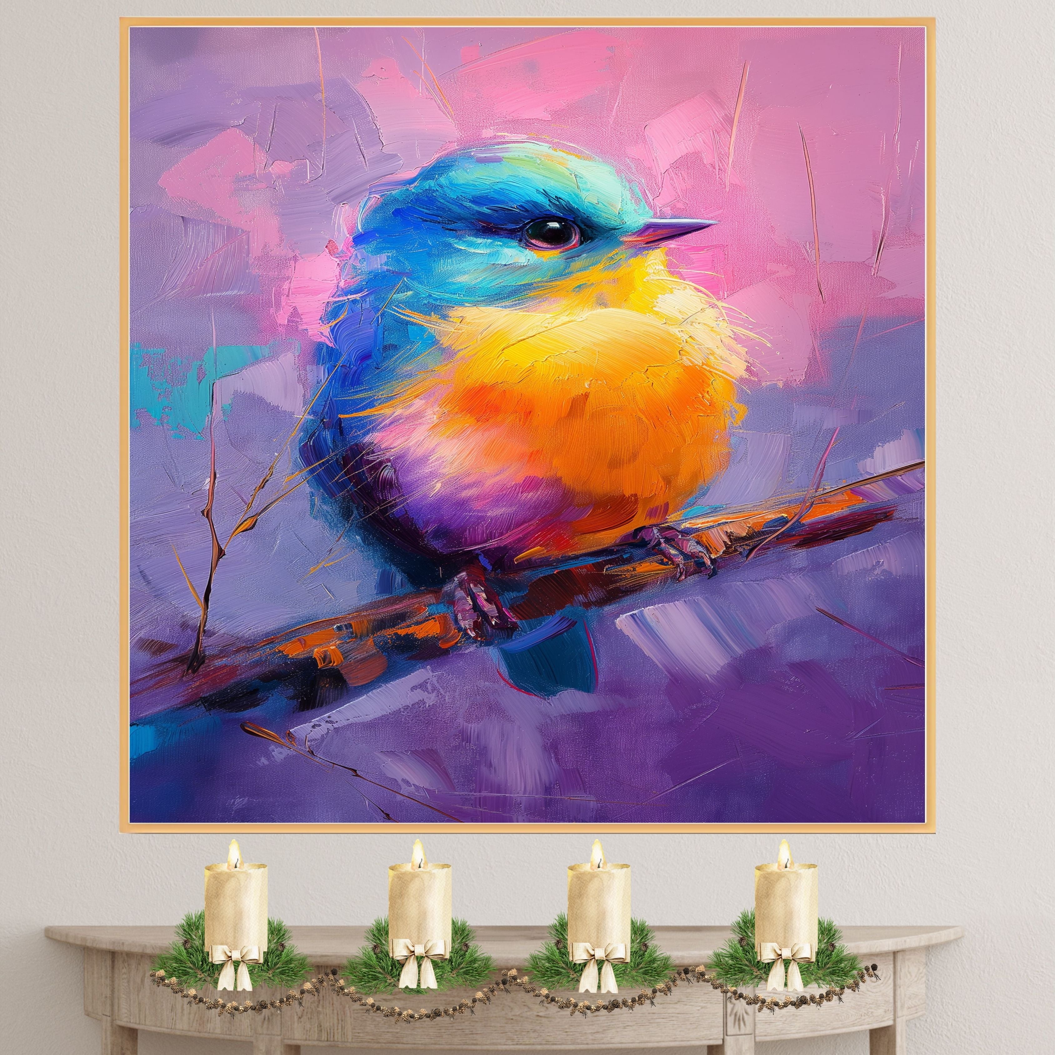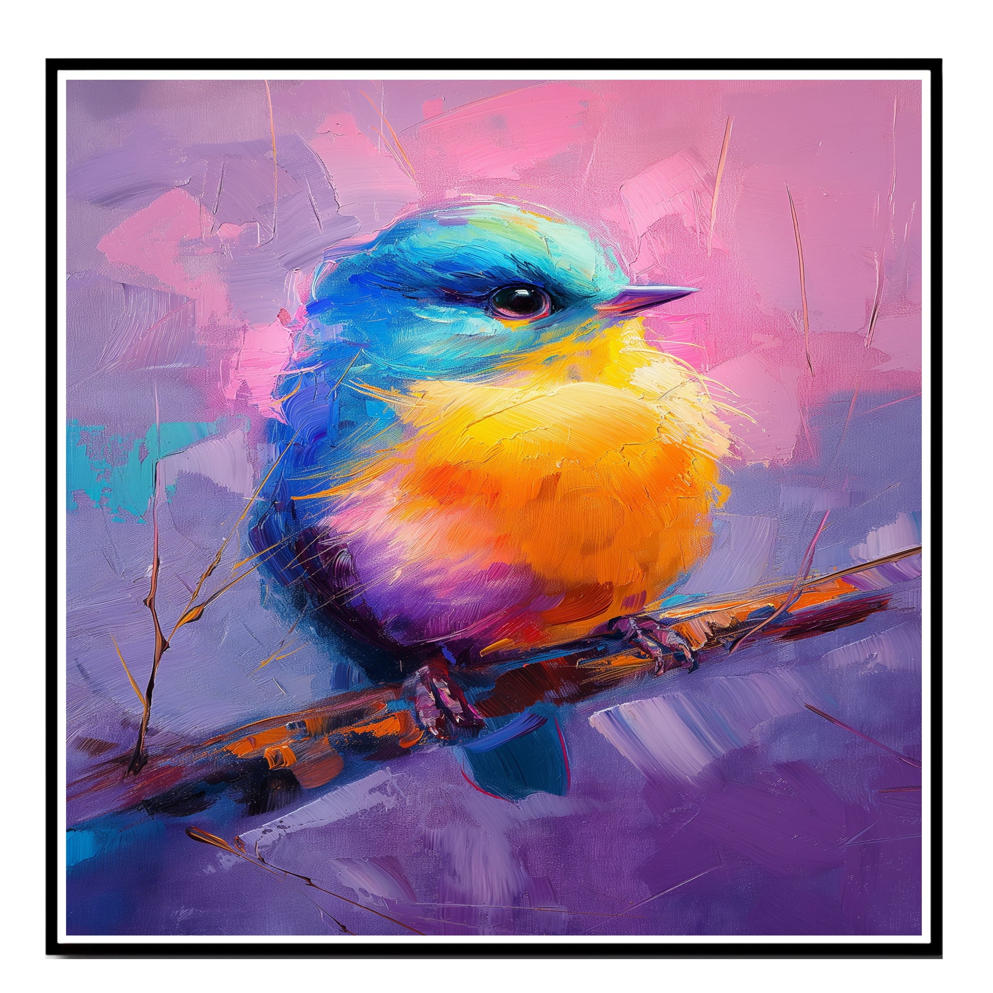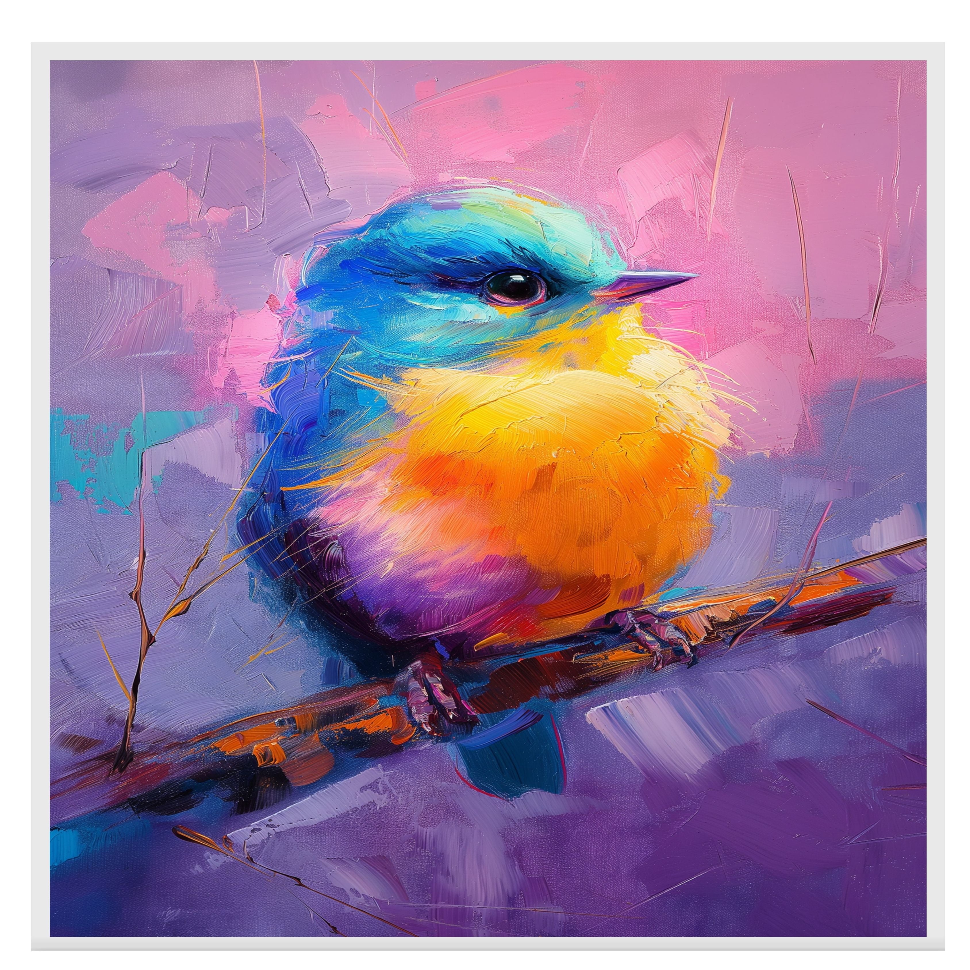 Let this color-drenched baby bird bring light and character to your decor. Saturated in intense hues and expressive brush detail, this piece is perfect for modern bohemian interiors or creative studio spaces. A joyful representation of youthful charm in nature.