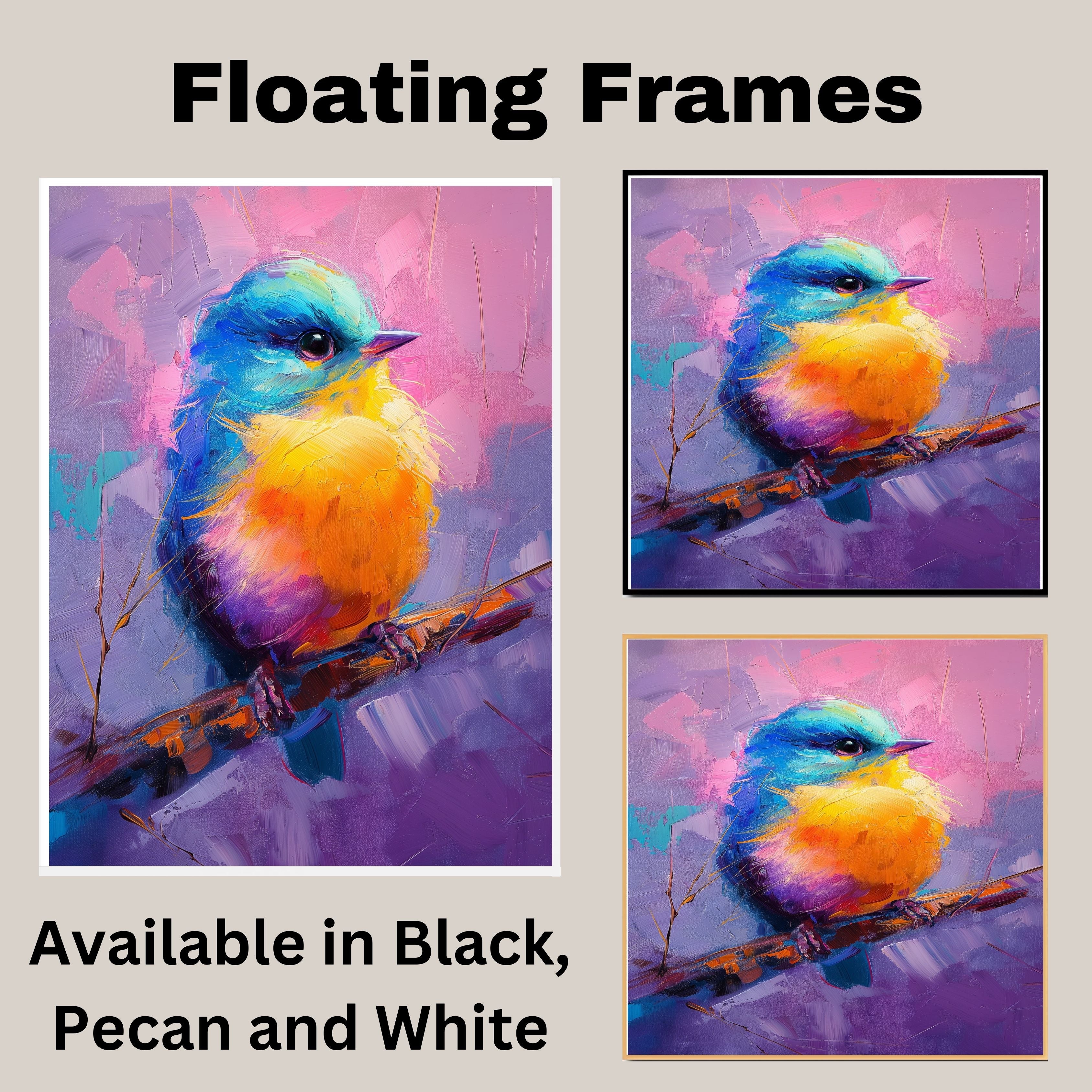 1.5" Thick Floating Framed Canvas: Available in Black, Pecan, and White Grain. Durable shrink-resistant frame. Comes with easy-to-install hanging kits, ready for immediate display.