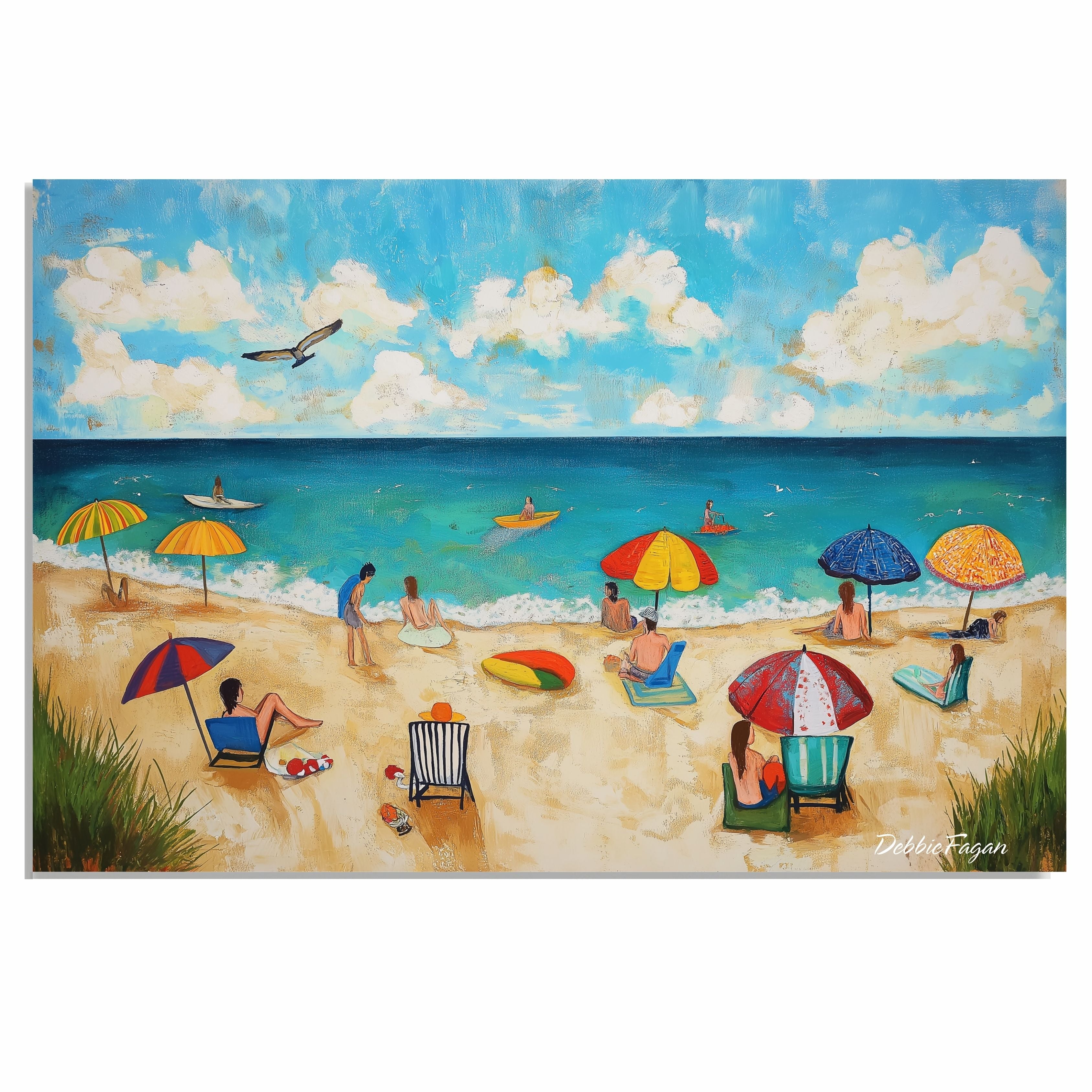 Celebrate summer all year long with this vibrant folk art-style beach painting! Featuring a playful coastal scene of sunbathers, colorful umbrellas, waves, and kayakers under a bright blue sky, this joyful artwork adds a touch of warmth and vacation vibes to any space.