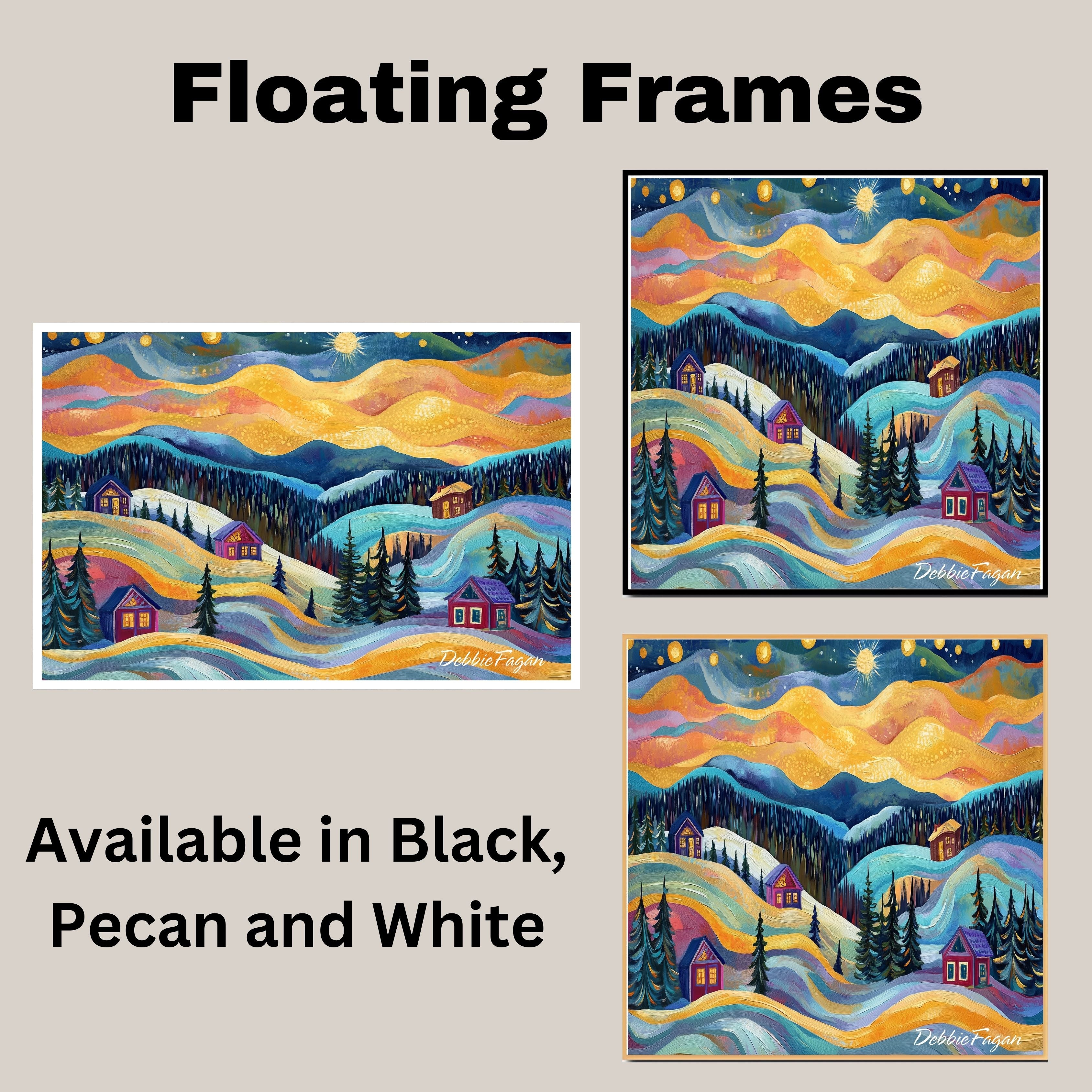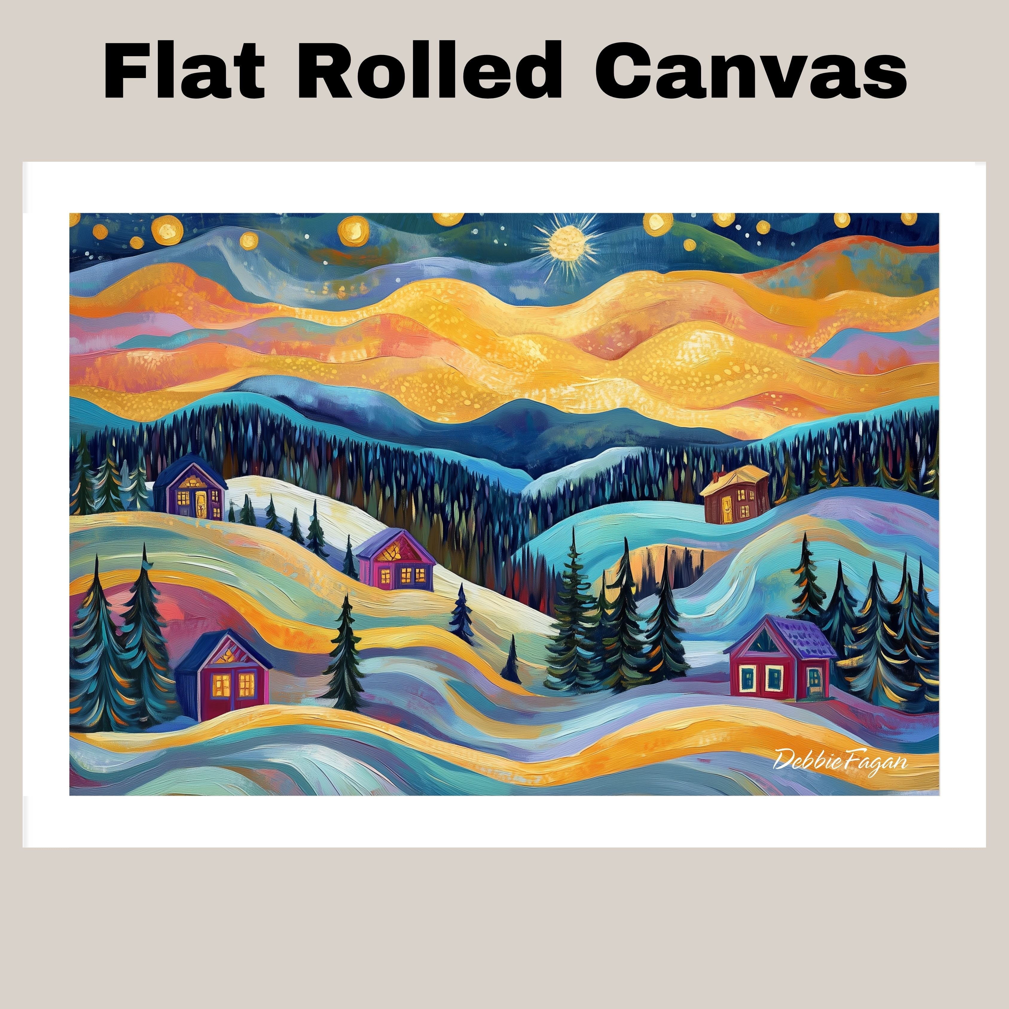 Colorful Christmas Folk Art Landscape with Rolling Snowy Hills, Cozy Cabins, Pine Trees, and a Glowing Sunset Sky on Ready to Hang 1.5" Thick Canvas Wrap, Floating Framed Canvas, Flat Rolled Canvas
