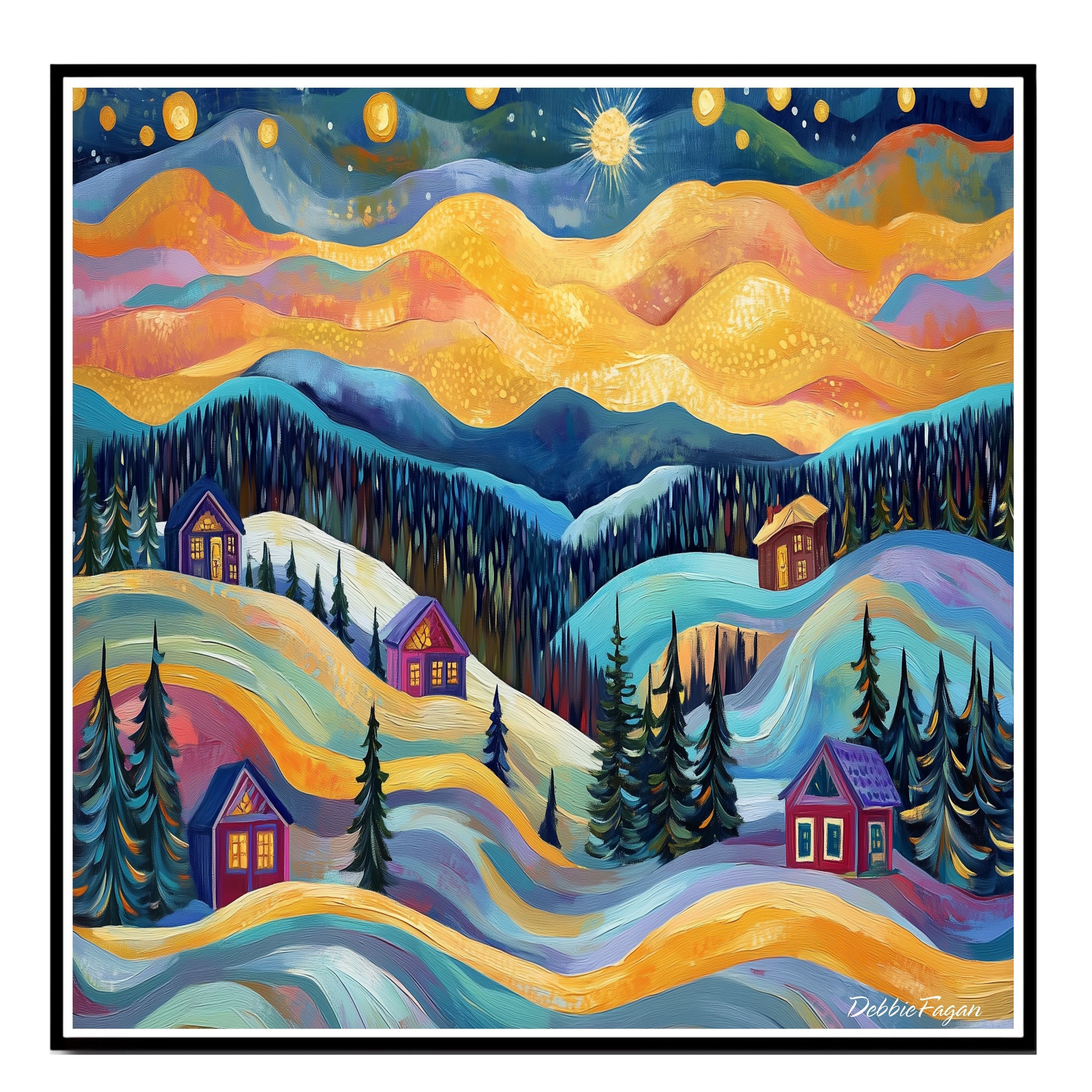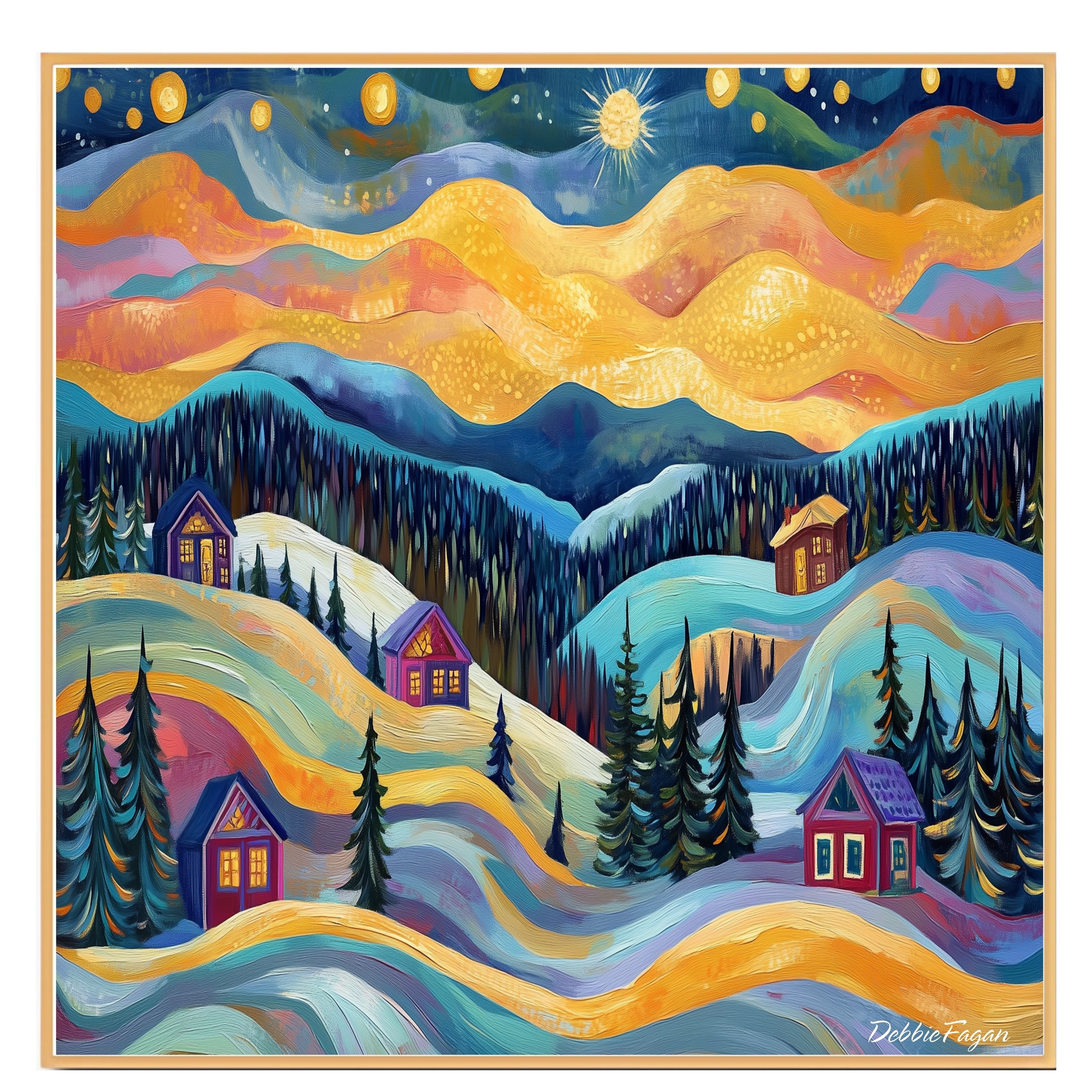 A vibrant folk art painting of snowy rolling hills with festive cabins, glowing windows, evergreen trees, and a golden sunset sky.
