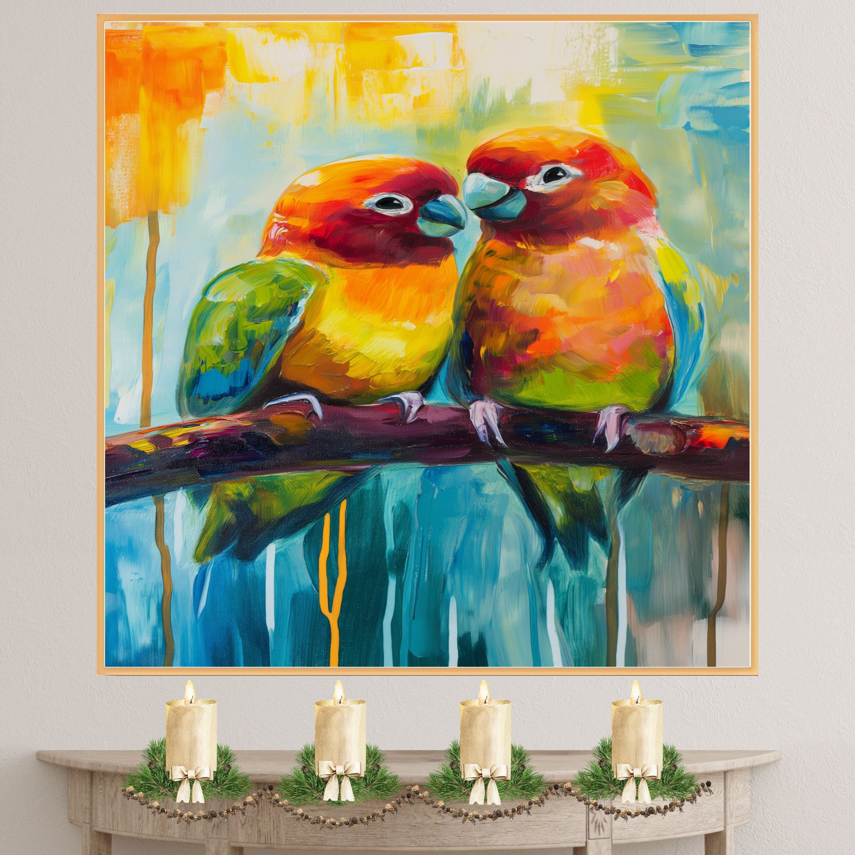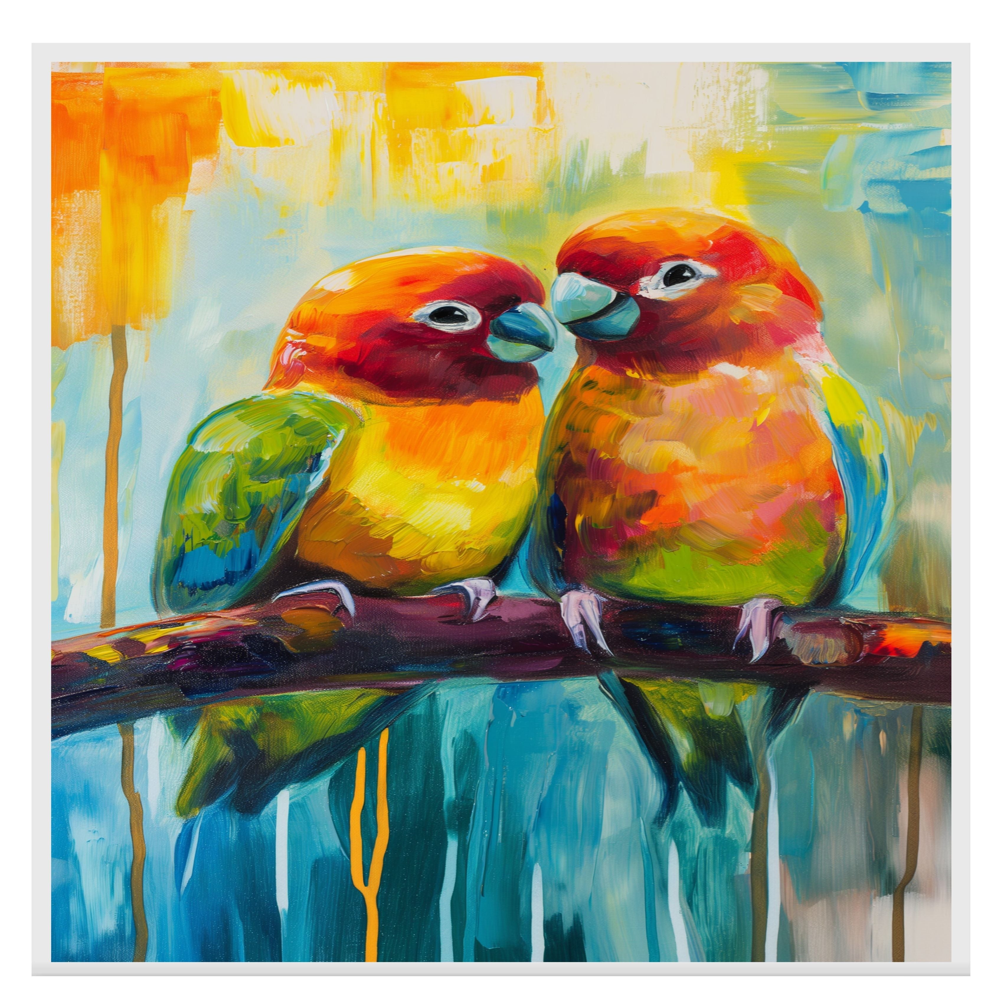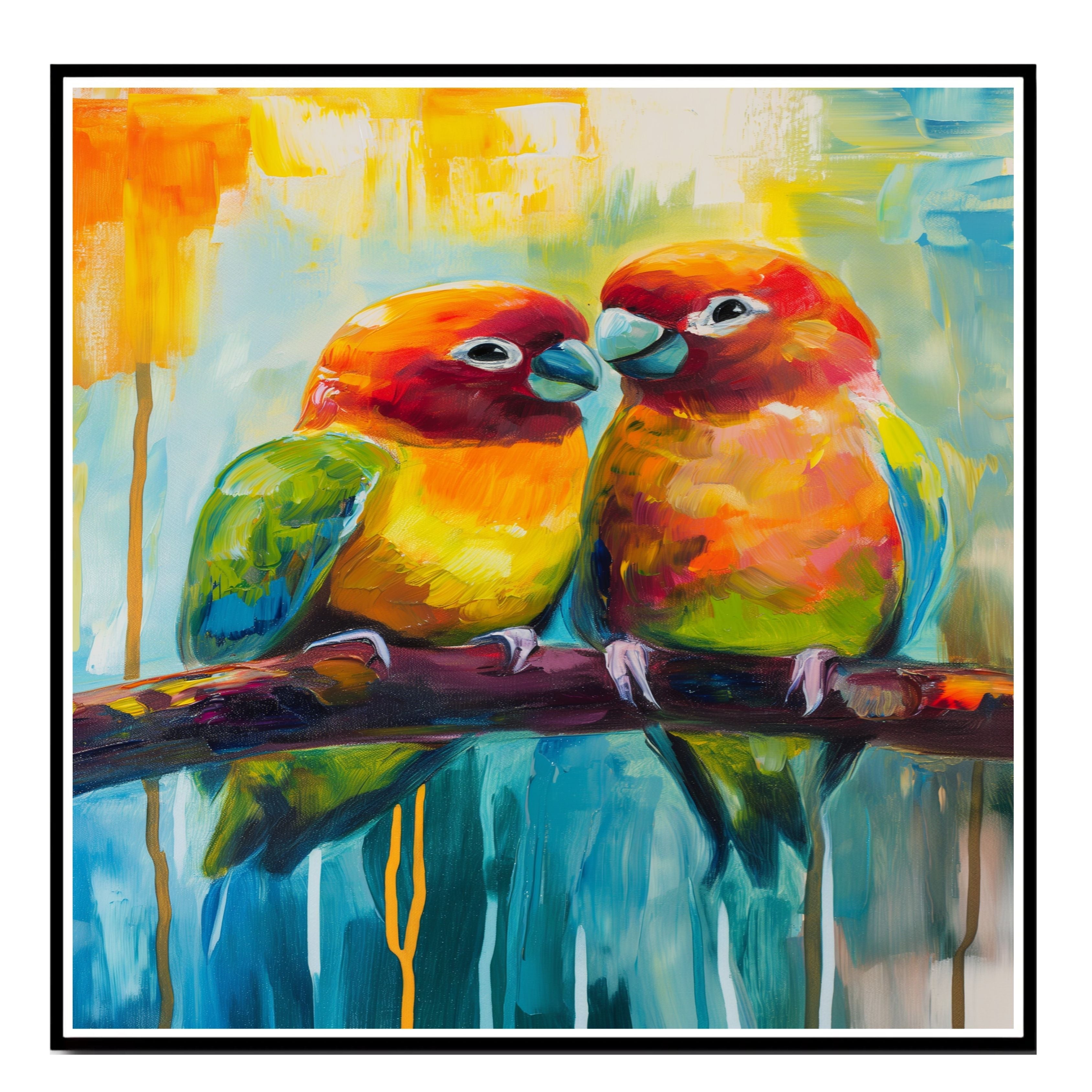 This abstract impressionist artwork portrays a pair of charming lovebirds, painted in bold hues of orange, red, green, and yellow. Their soft expressions and vivid plumage stand out against a beautifully blended background of cool blues and warm golden tones. A perfect piece for bird lovers or those who appreciate expressive, lively art that evokes joy and warmth.