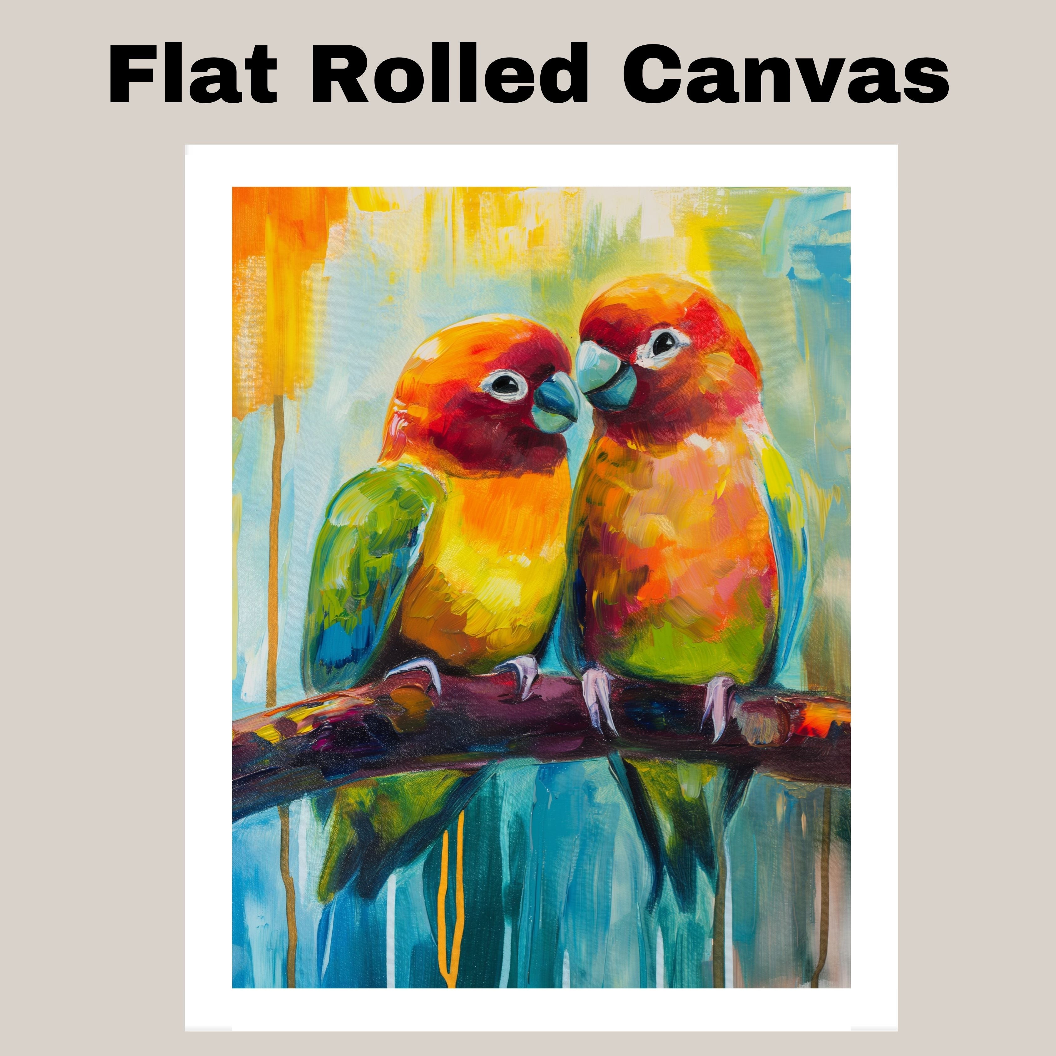 Colorful Lovebird Pair in Abstract Impressionist Style with Vibrant Tropical Hues Sitting on a Branch Against a Bright Blue and Yellow Background on Ready to Hang 1.5" Thick Canvas Wrap, Floating Framed Canvas, Flat Rolled Canvas
