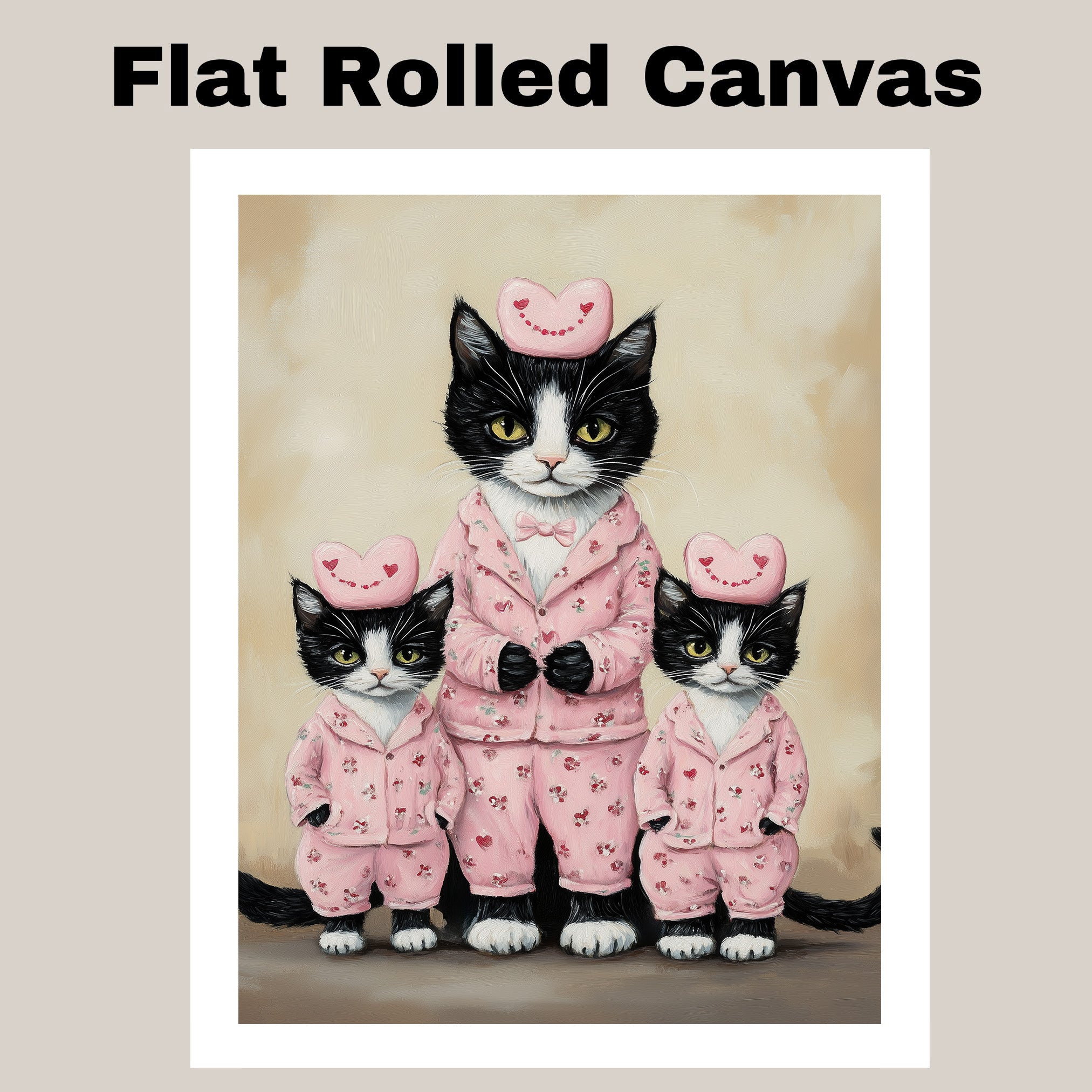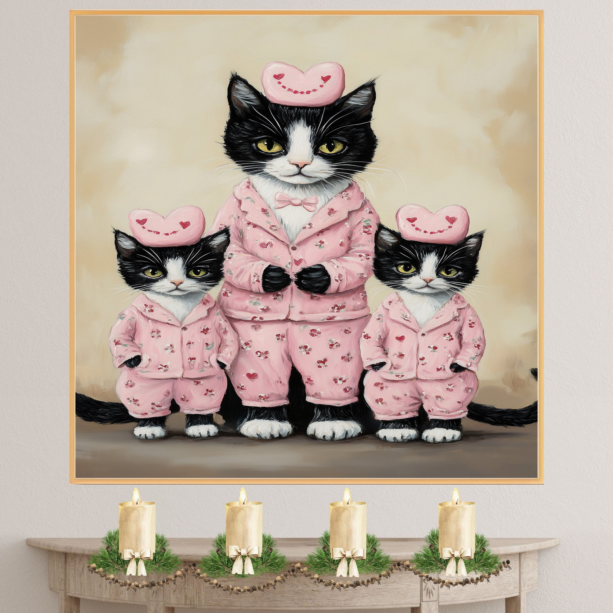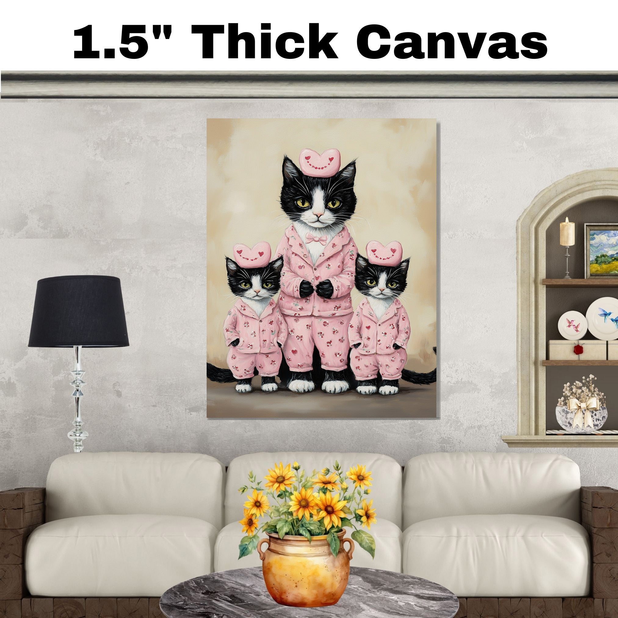 Colorful Oil Painting of Texudo Cat Family in Rainbow Outfits with Roses and Hearts for Cat Lovers and Whimsical Art Enthusiasts on Ready to Hang 1.5" Thick Canvas Wrap, Floating Framed Canvas, Flat Rolled Canvas