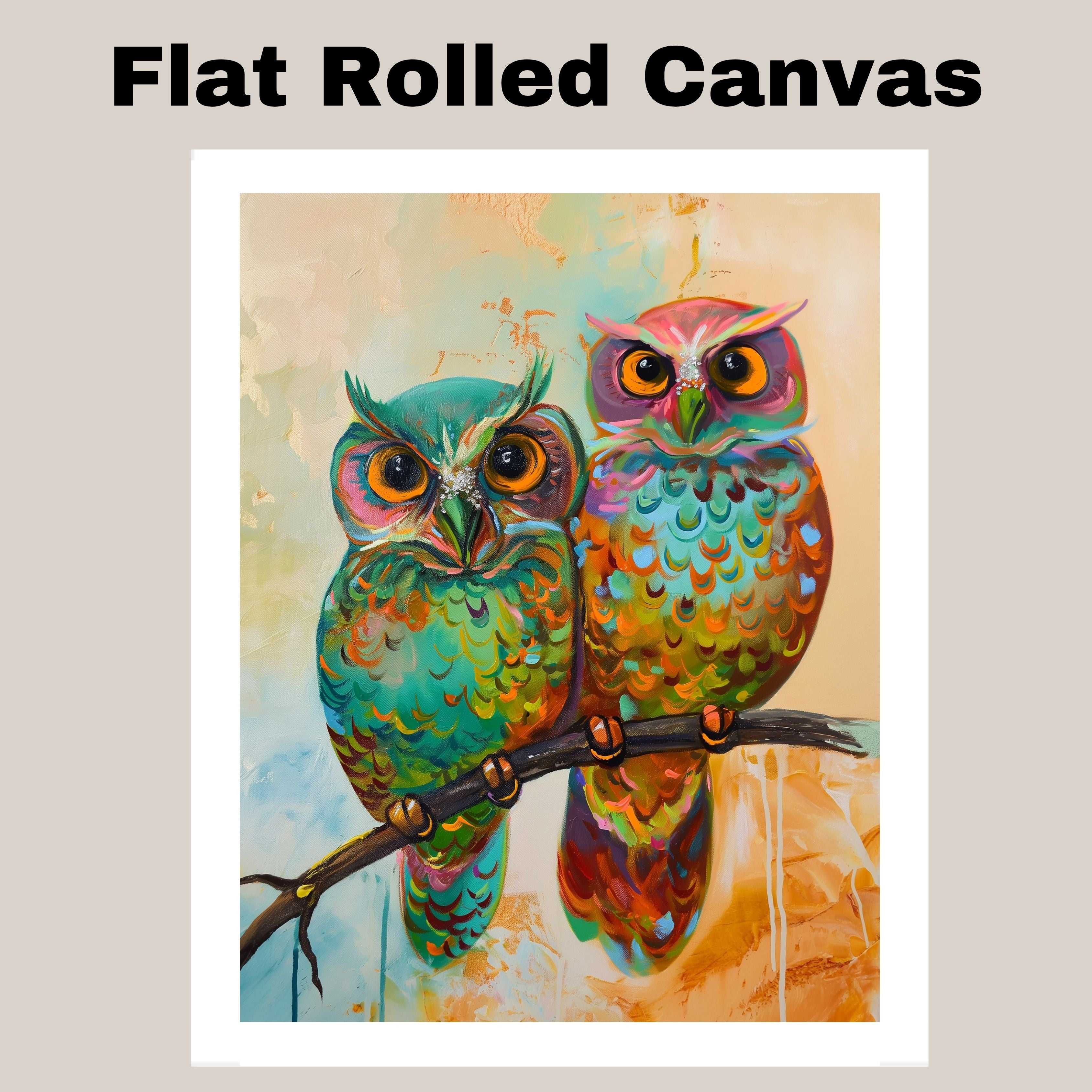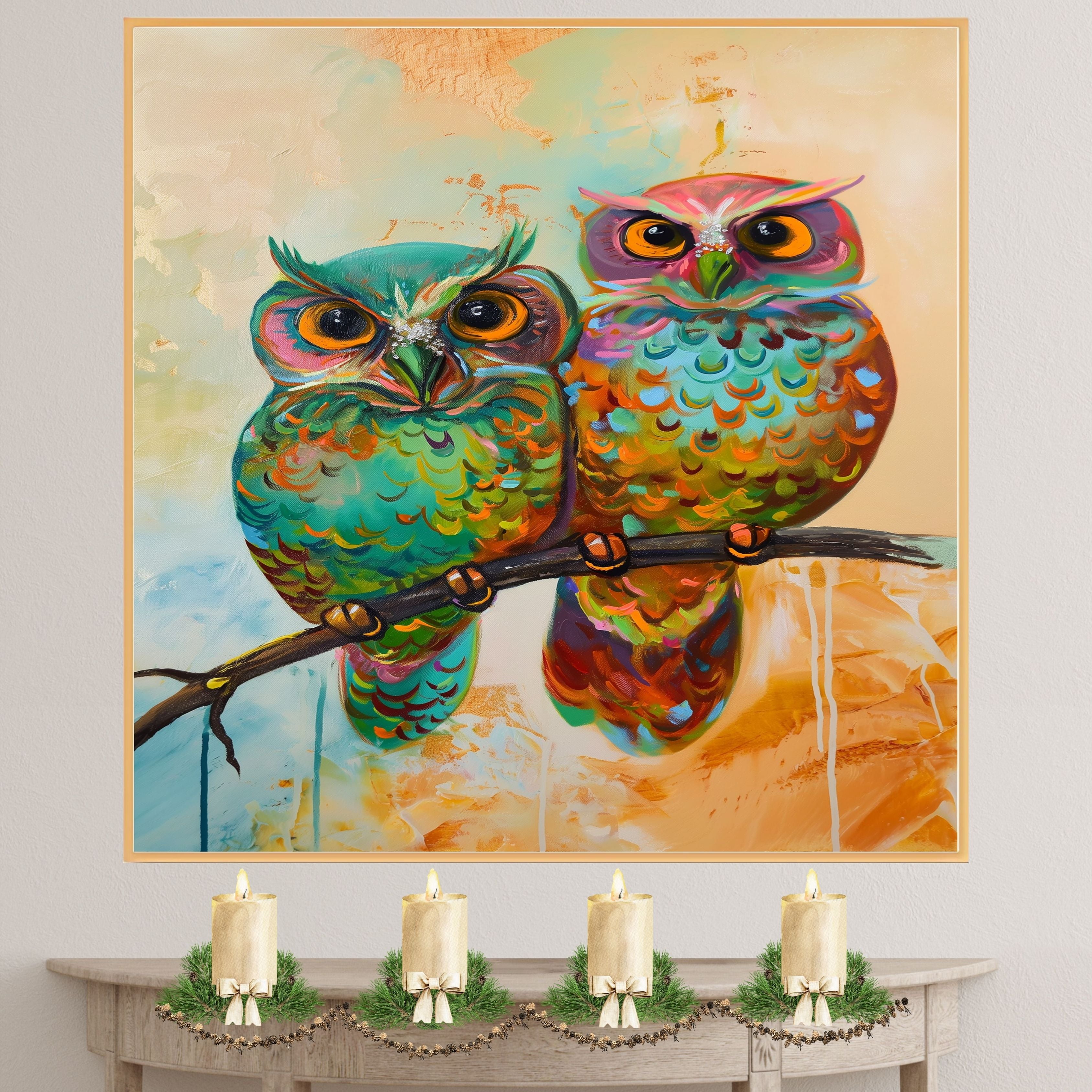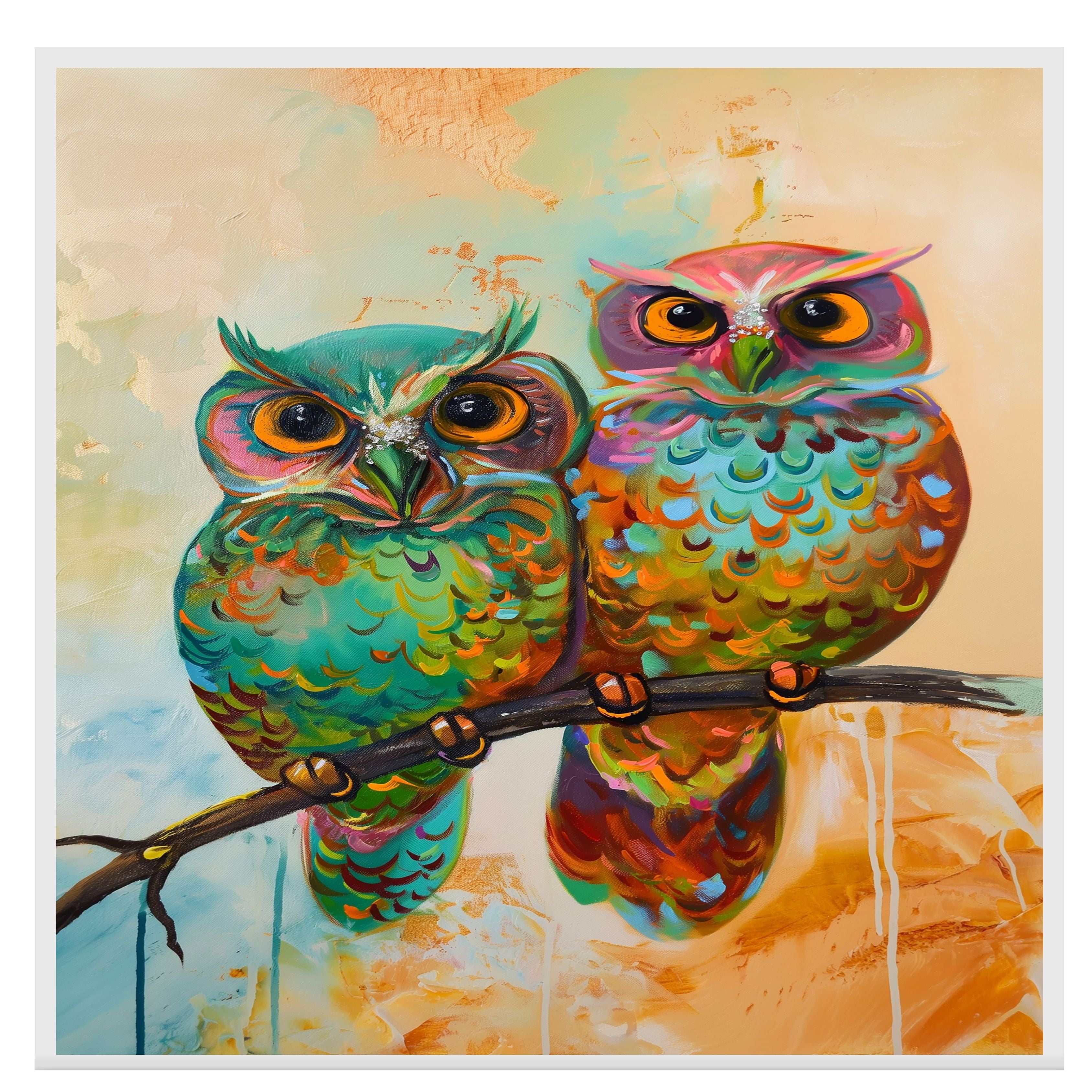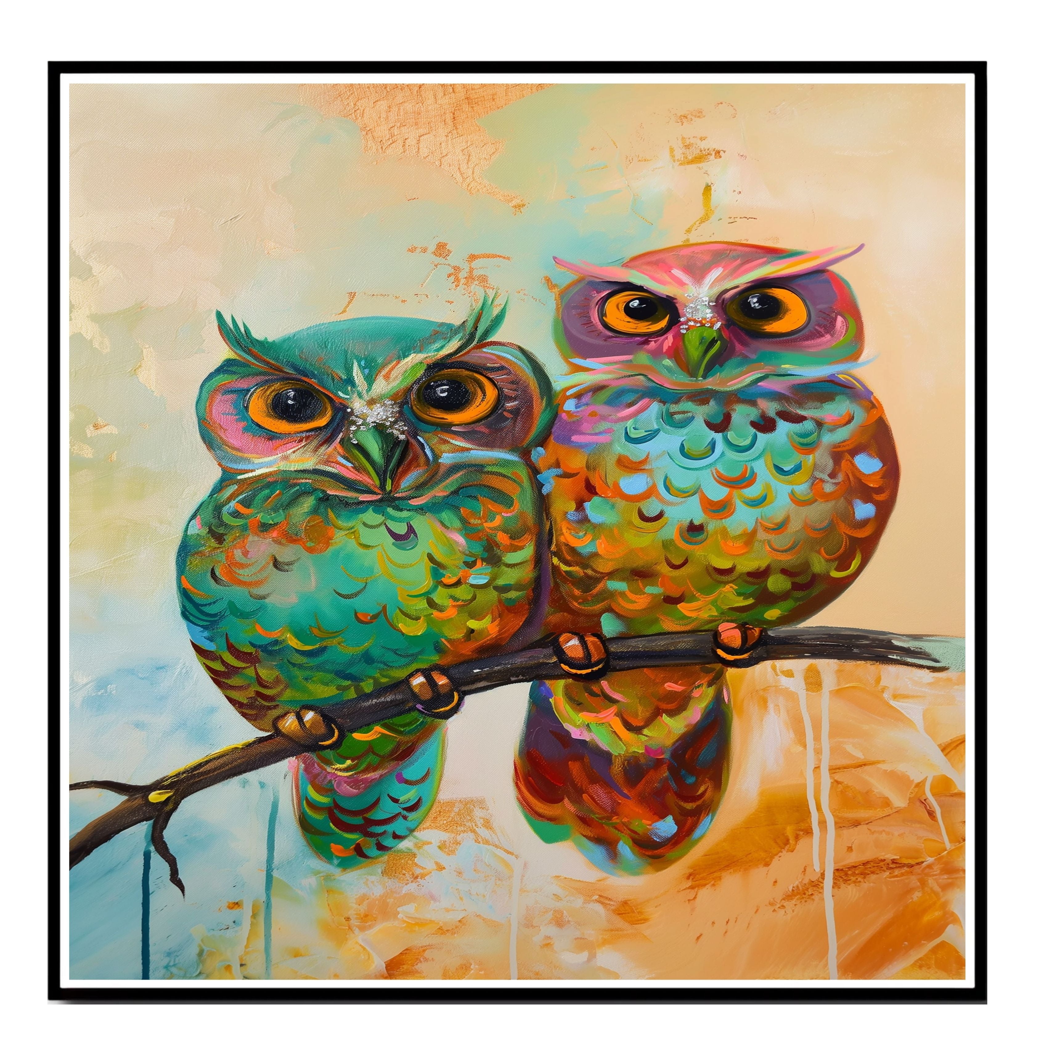 This delightful artwork features a pair of owls with vividly painted feathers in turquoise, pink, green, and orange, perched side by side on a branch. Their oversized orange eyes and whimsical expressions add personality and charm, while the warm-toned abstract background brings vibrant energy to any space.