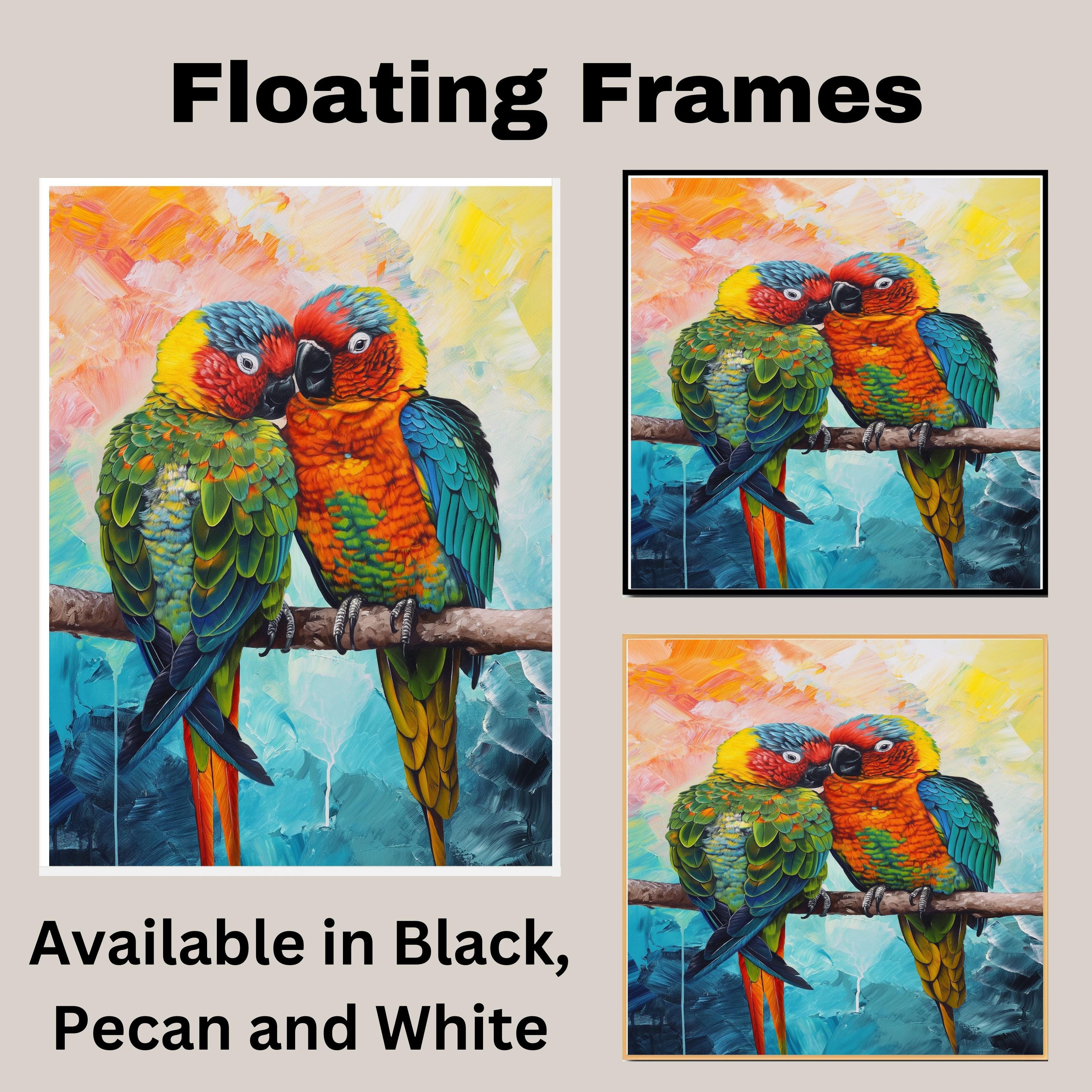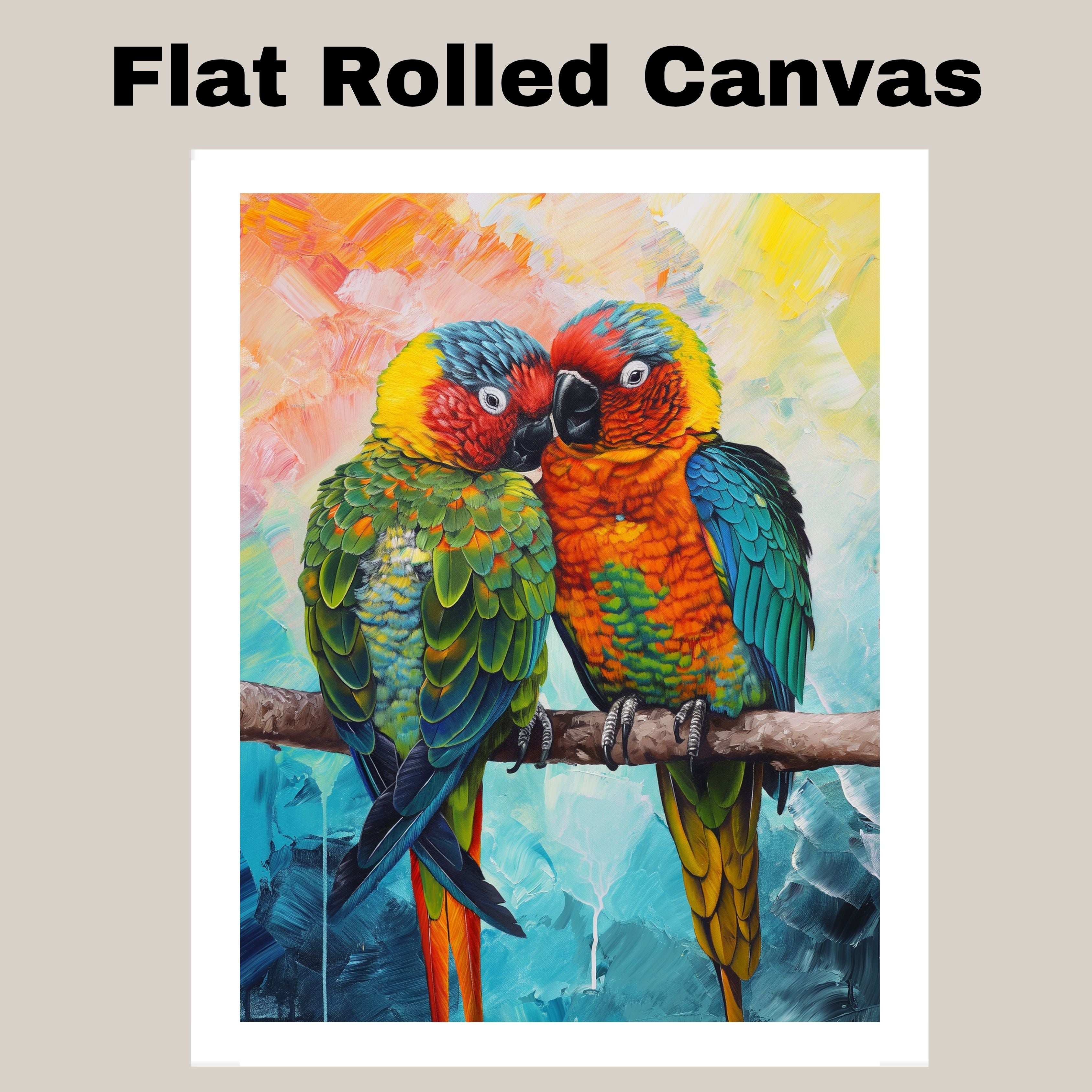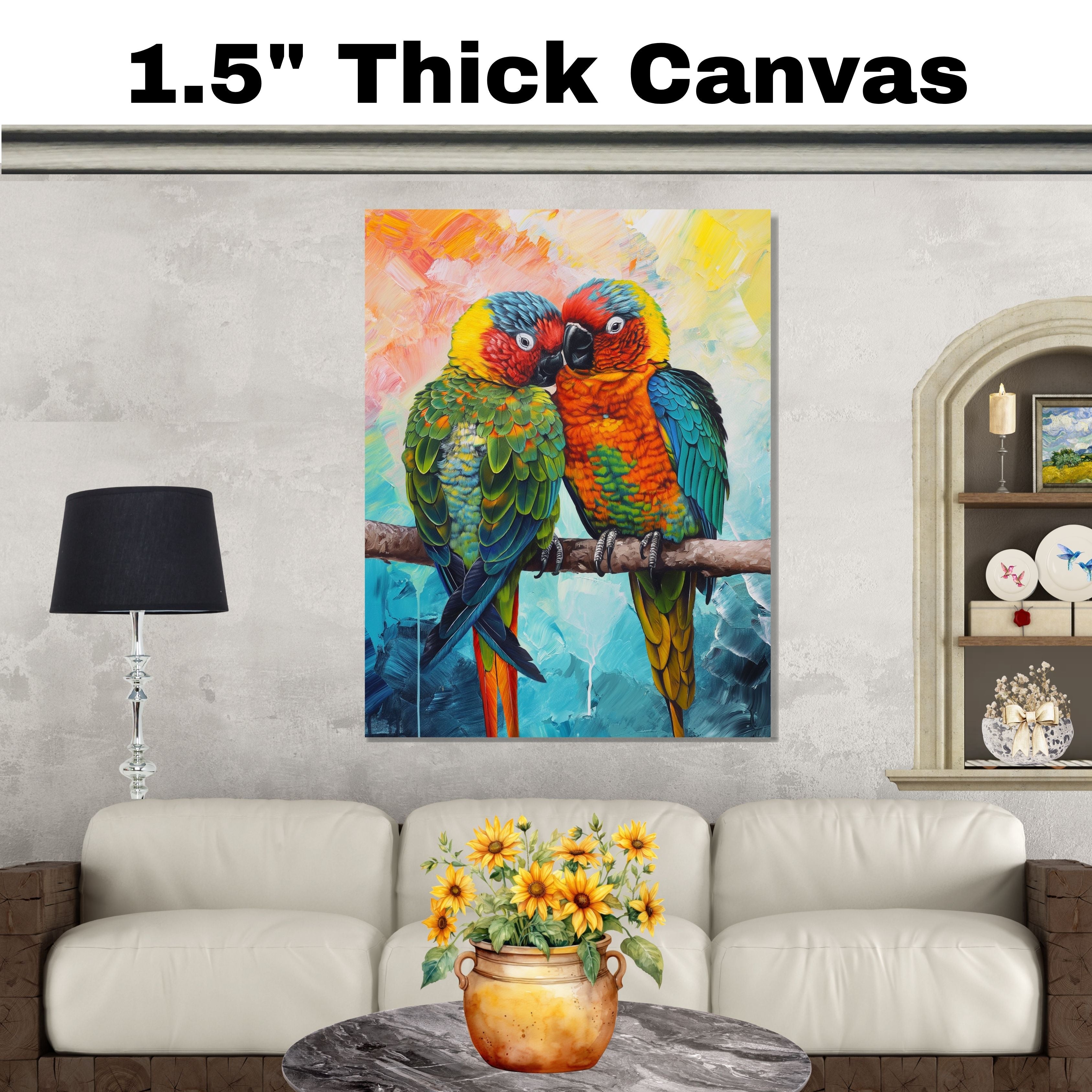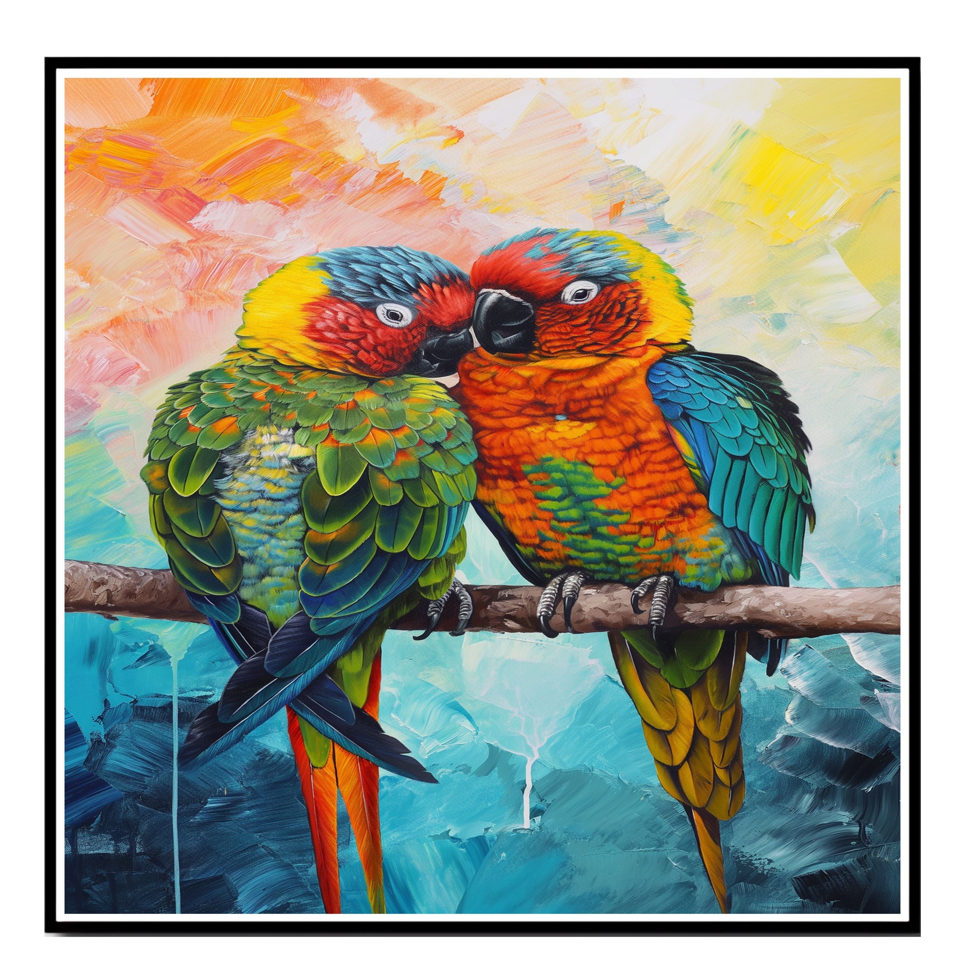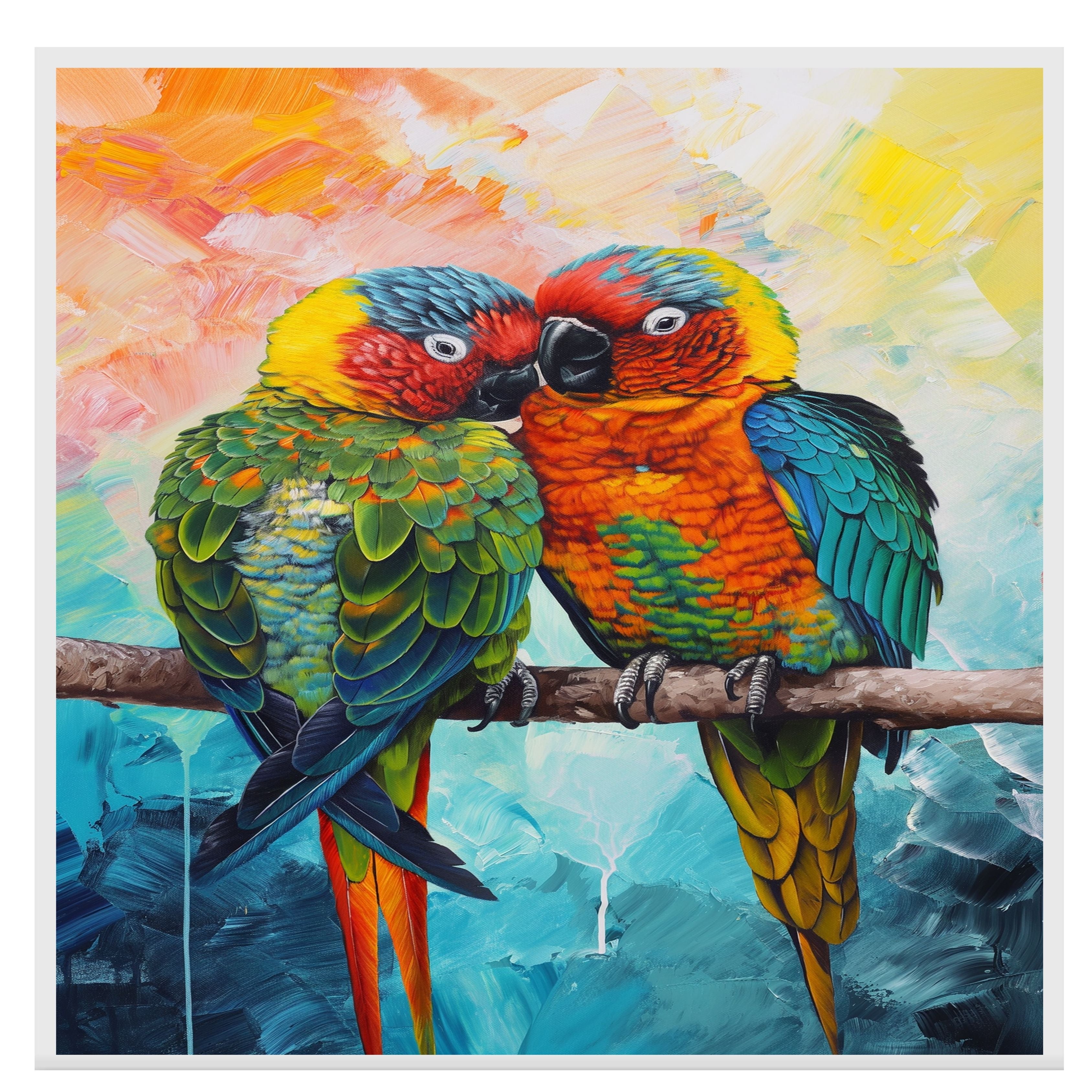 This striking artwork showcases a pair of tropical parrots perched closely on a branch, their brilliantly detailed feathers in red, blue, green, and yellow. The bold abstract background of warm and cool tones enhances the dynamic energy of the scene, perfect for bird and color lovers.