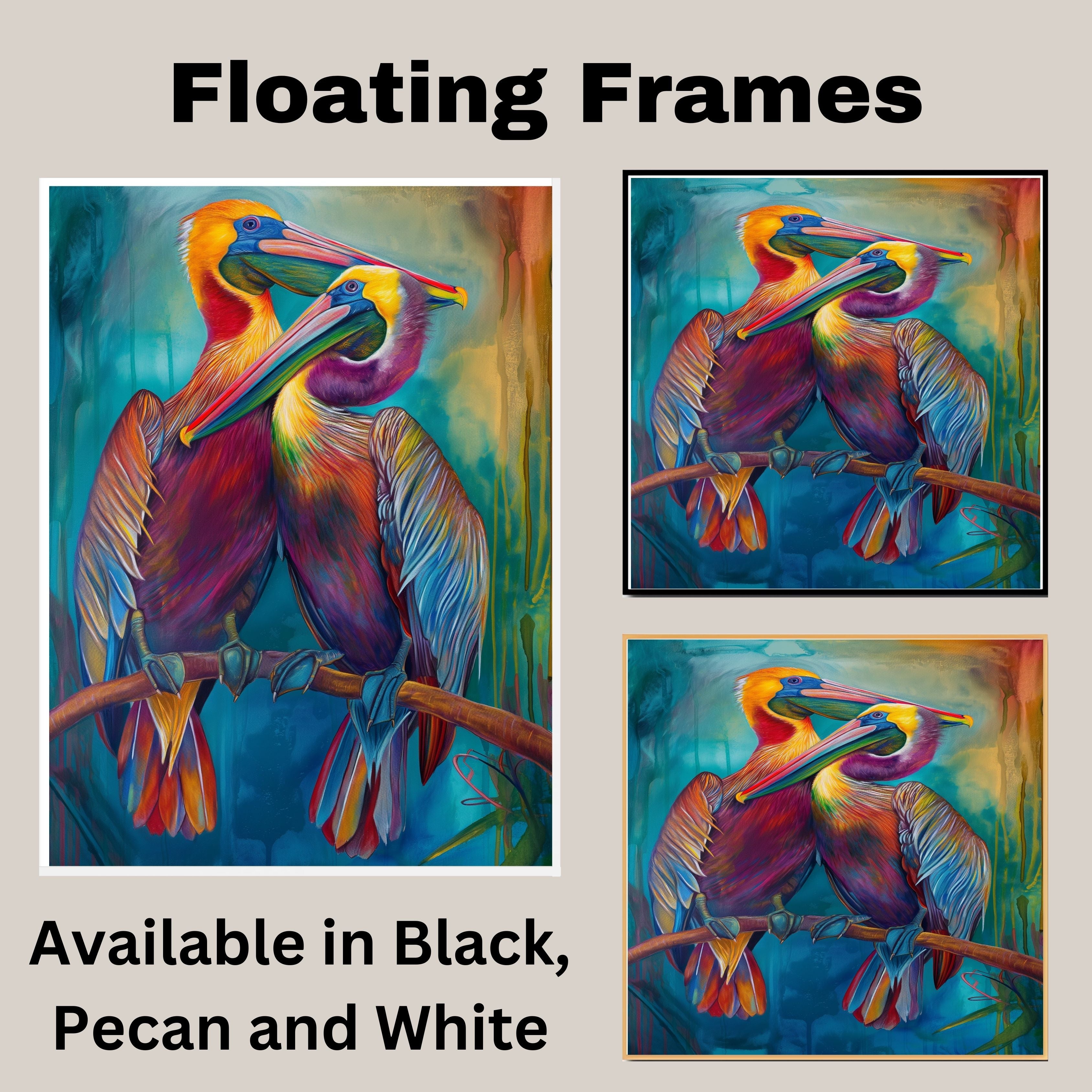 1.5" Thick Floating Framed Canvas: Available in Black, Pecan, and White Grain. Durable shrink-resistant frame. Comes with easy-to-install hanging kits, ready for immediate display.