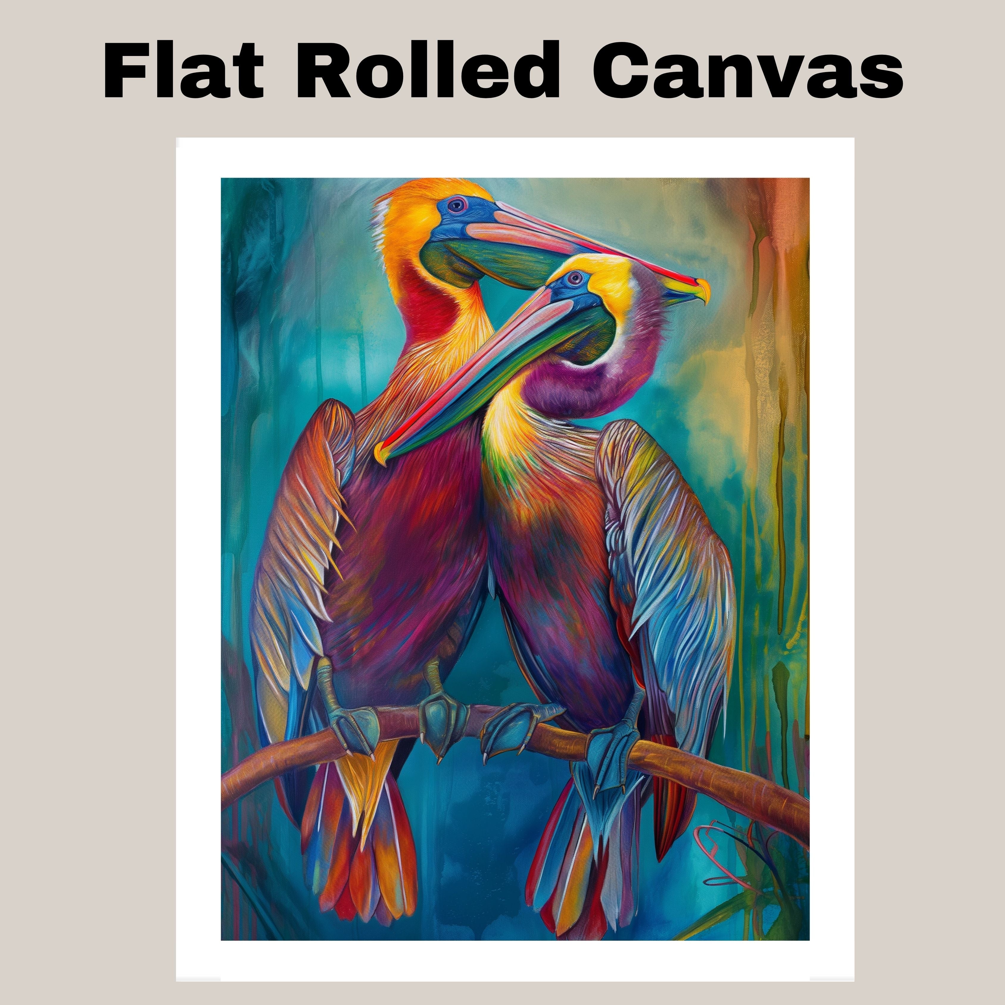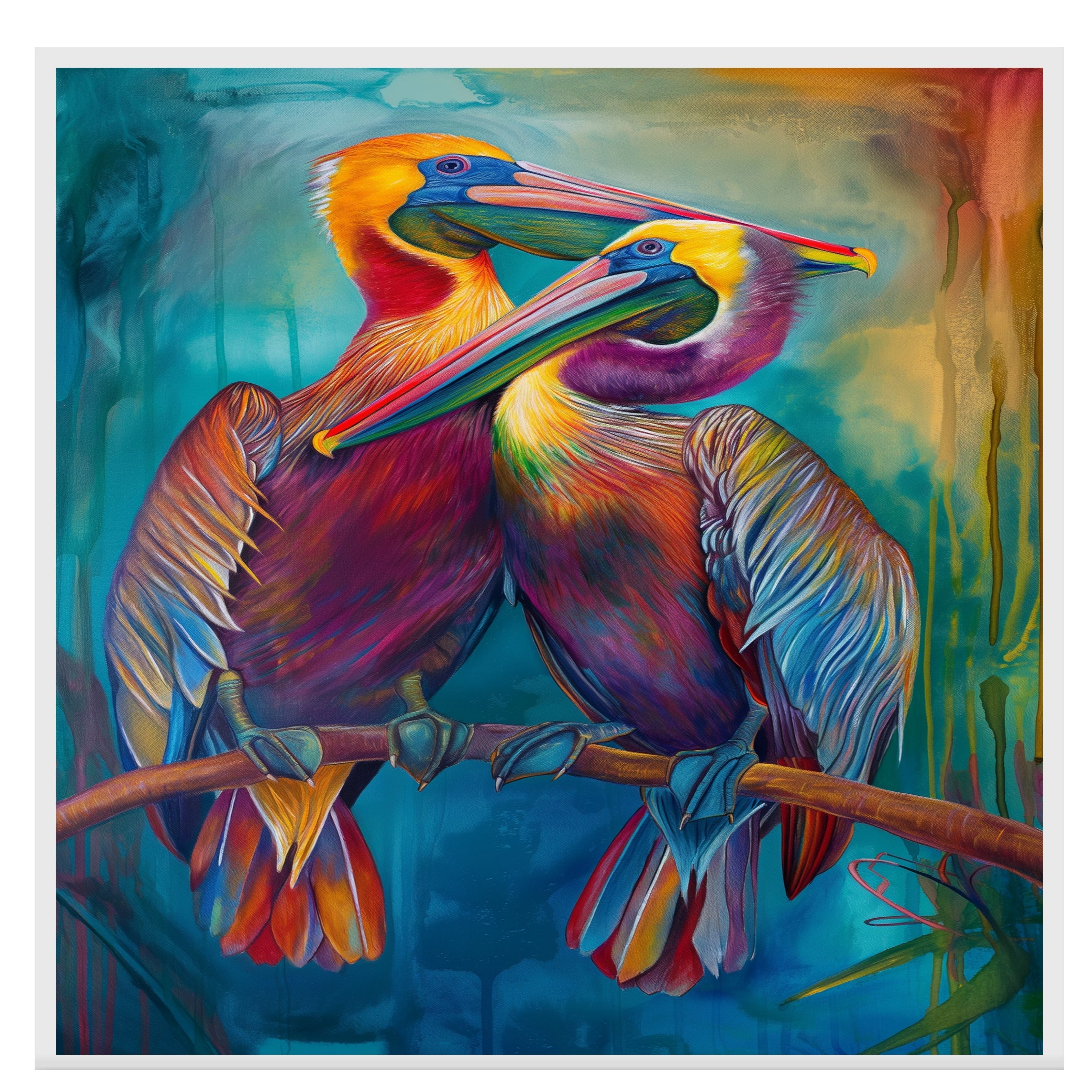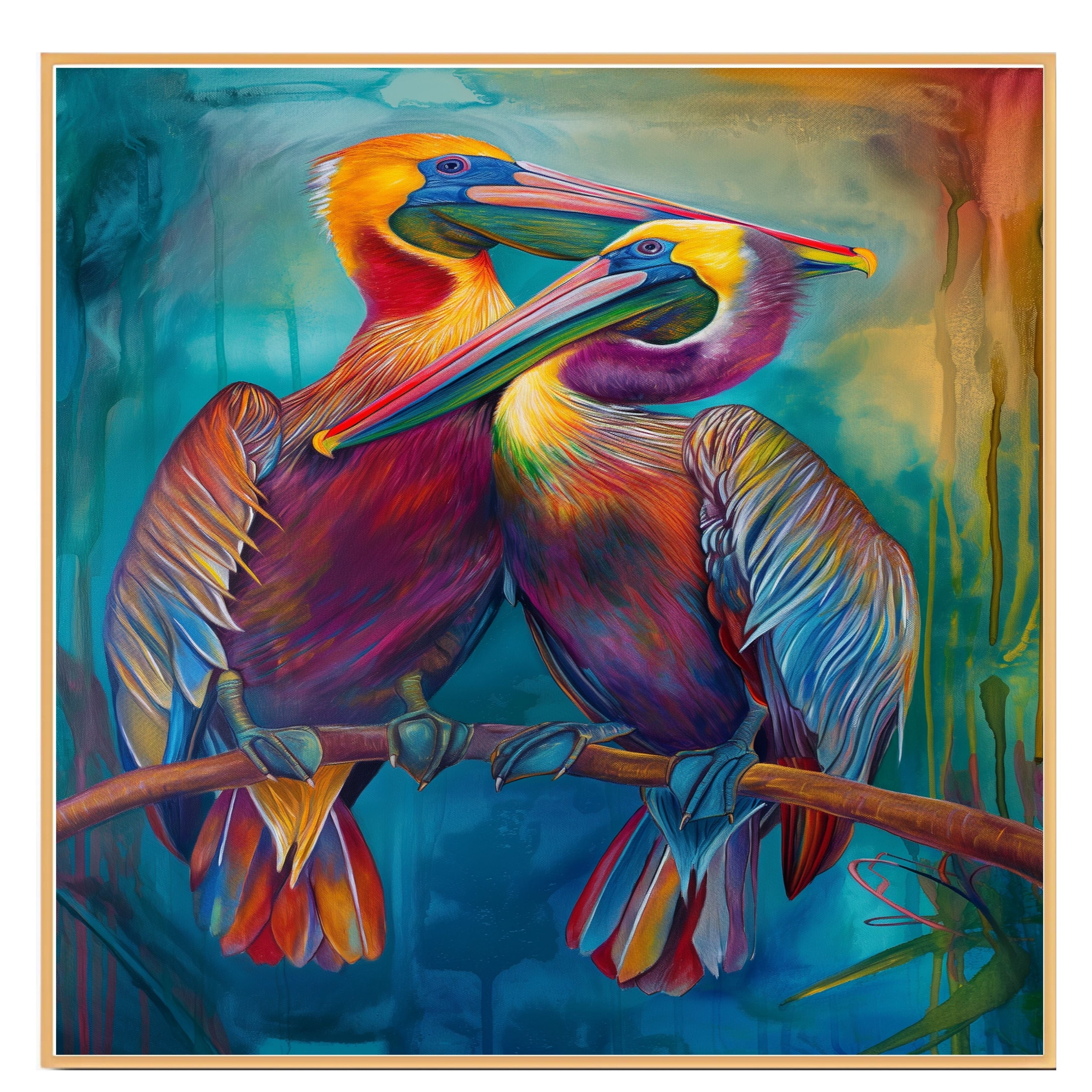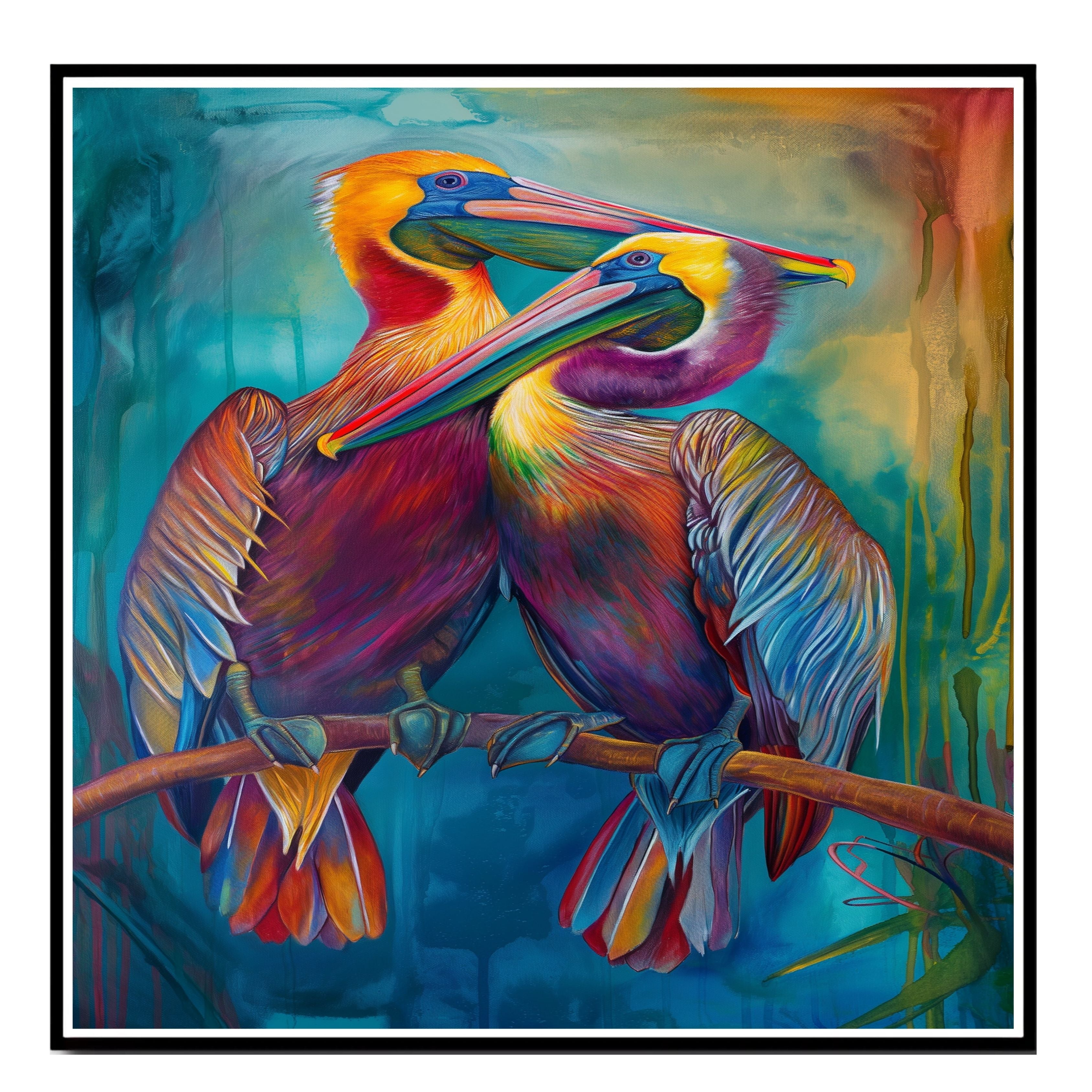 This stunning artwork features a pair of pelicans adorned in a rainbow of vivid hues including red, purple, yellow, and blue. Their long beaks and graceful stance are rendered in expressive detail, creating a lively and exotic composition set against a bold teal and orange backdrop—ideal for coastal, tropical, or modern art spaces.