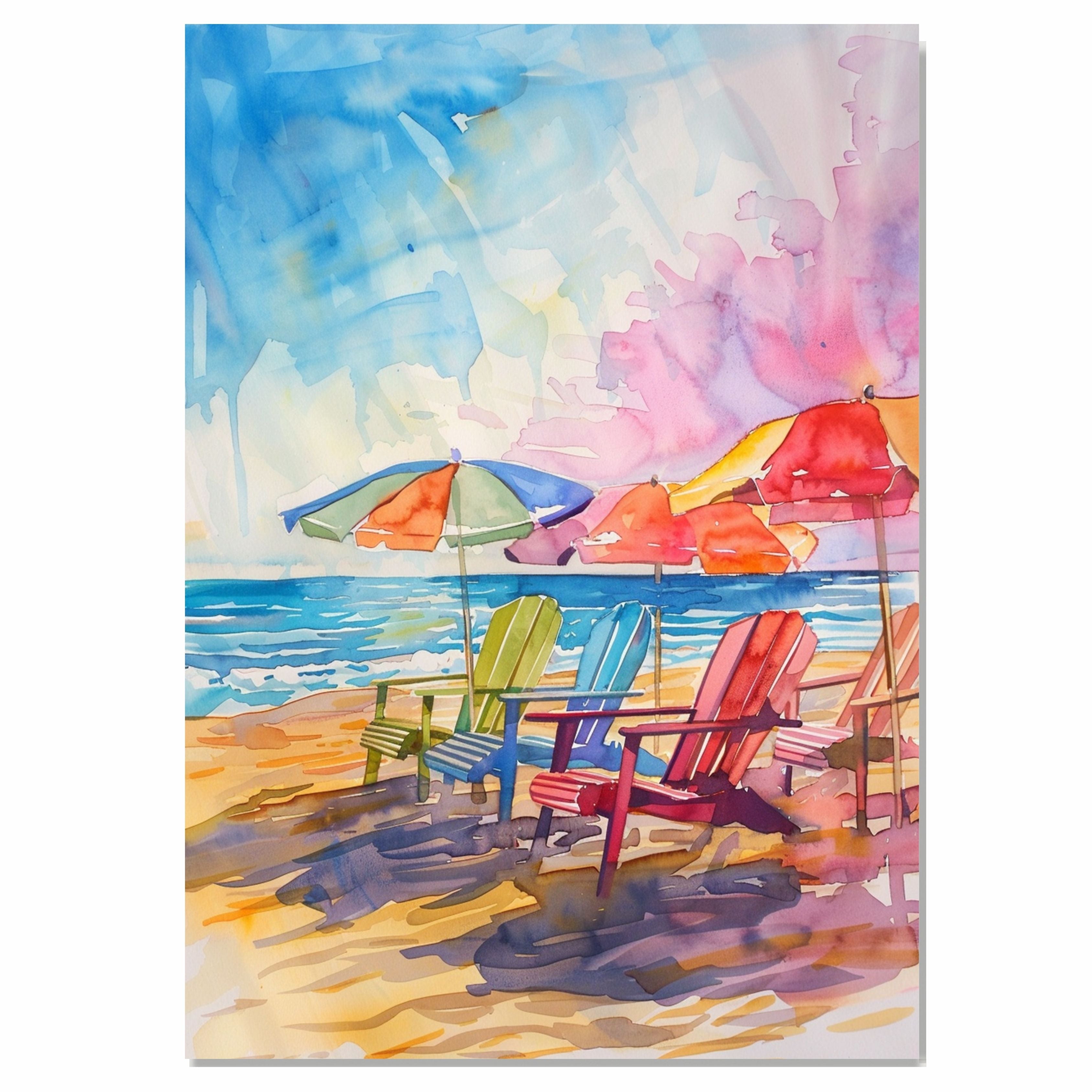Vibrant watercolor art of multicolored beach chairs and umbrellas set against the sea and sky. A cheerful, breezy seaside scene full of summer spirit.