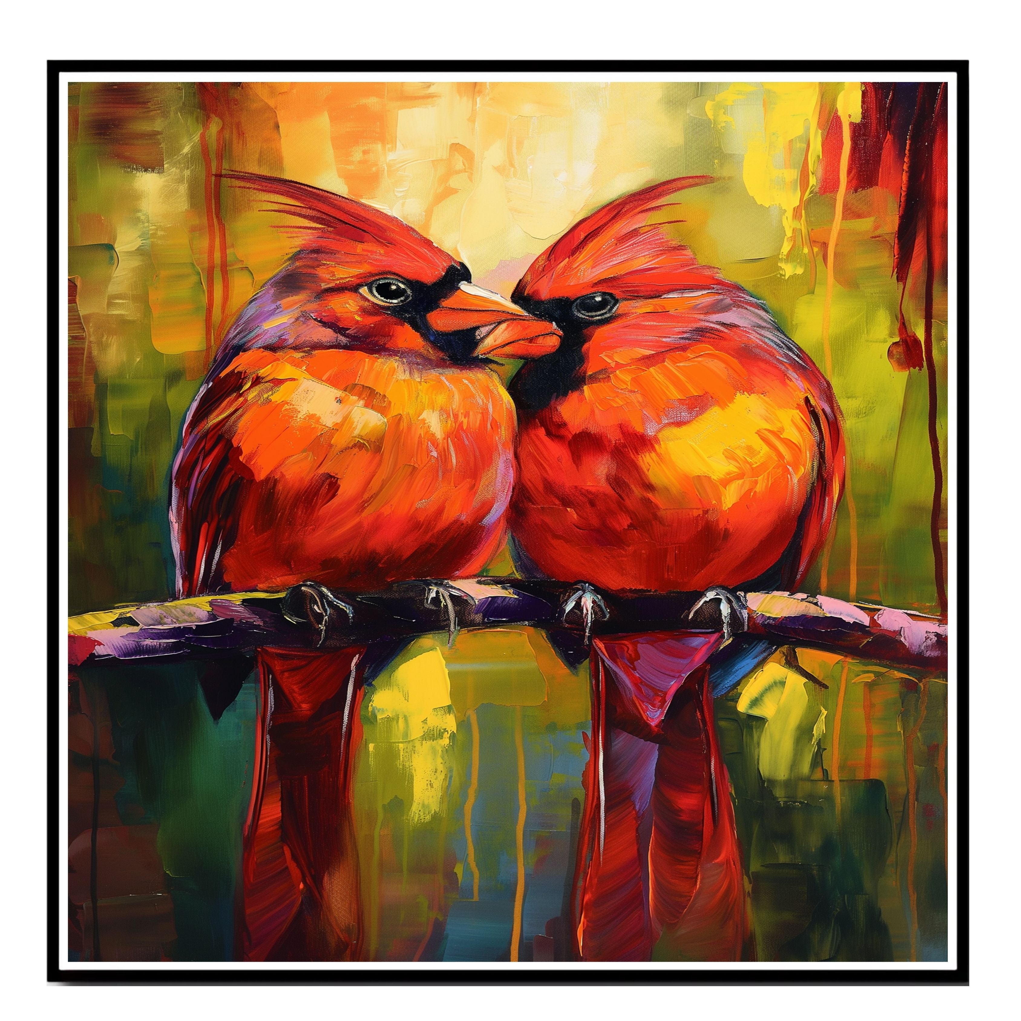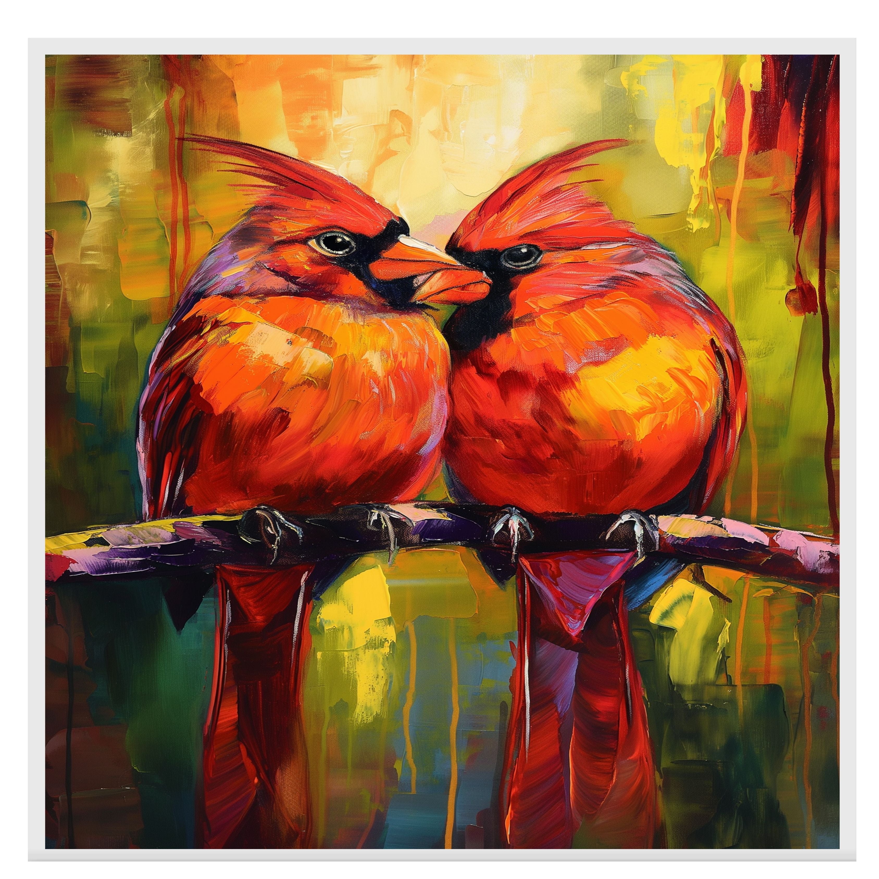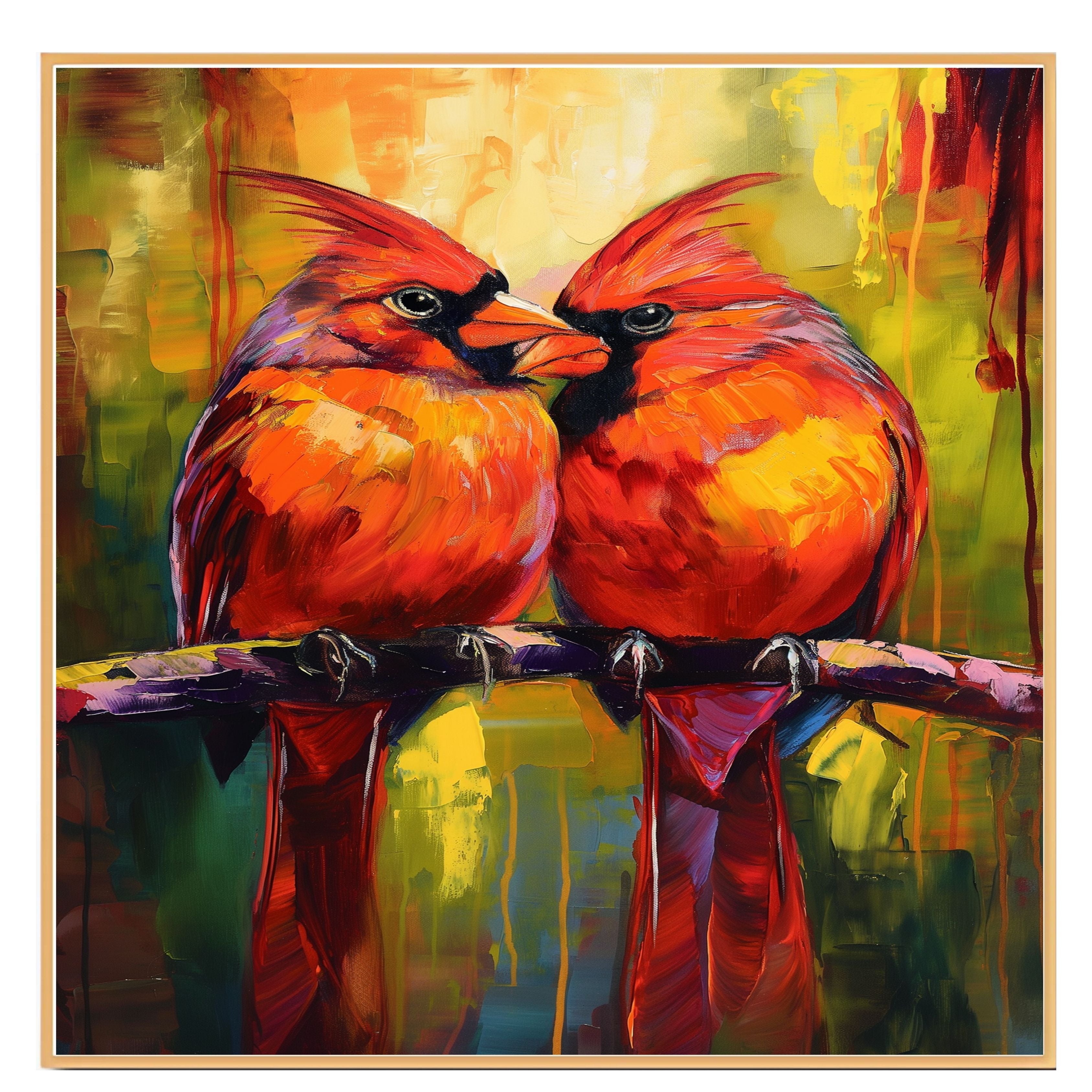 Contemporary Red Cardinal Pair – Artistic Nature-Inspired Painting with Abstract Background and Dripping Color Details on Ready to Hang 1.5" Thick Canvas Wrap, Floating Framed Canvas, Flat Rolled Canvas