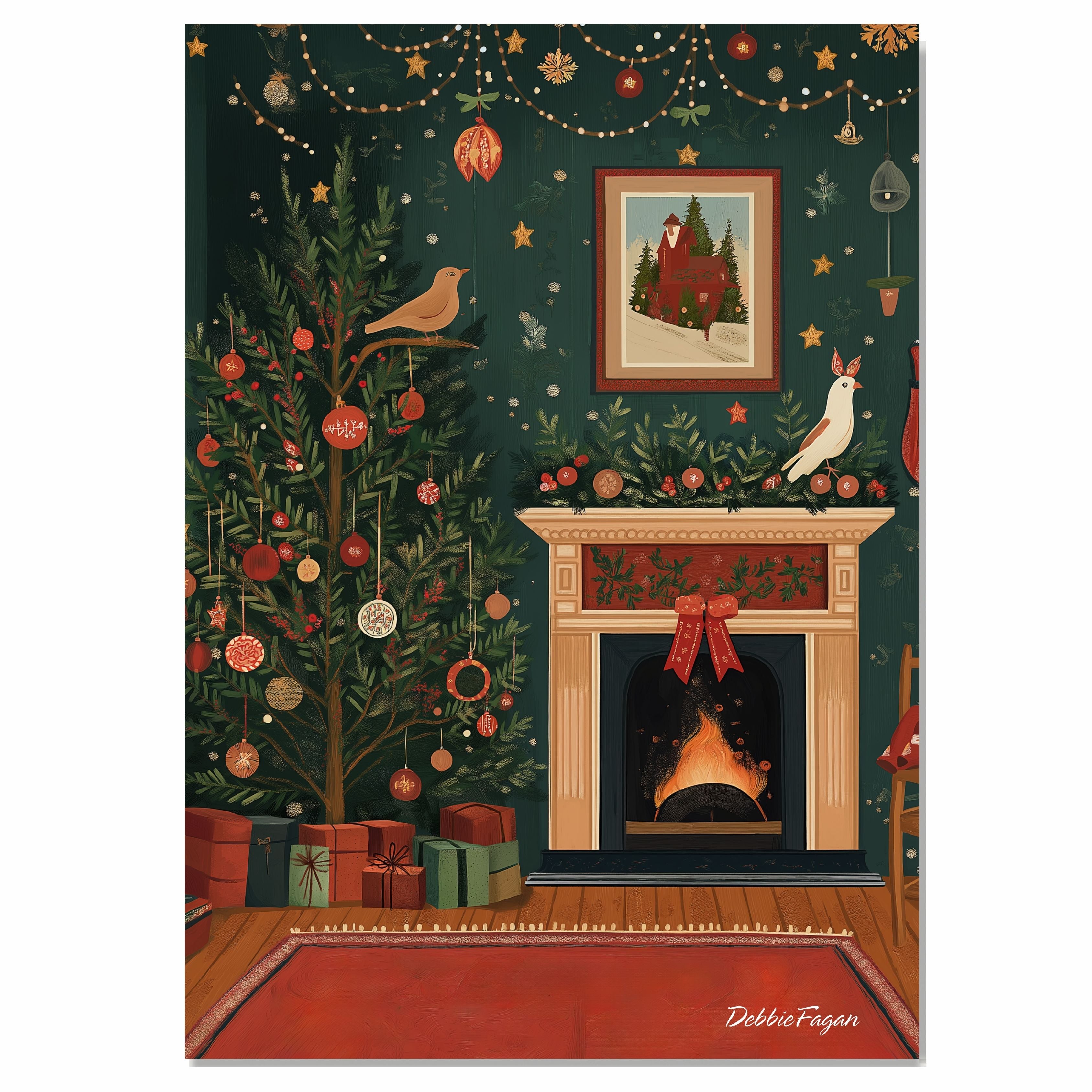 This charming folk art Christmas illustration features a decorated tree, glowing fireplace, holiday garlands, wrapped presents, and birds, creating a nostalgic and heartwarming festive atmosphere.