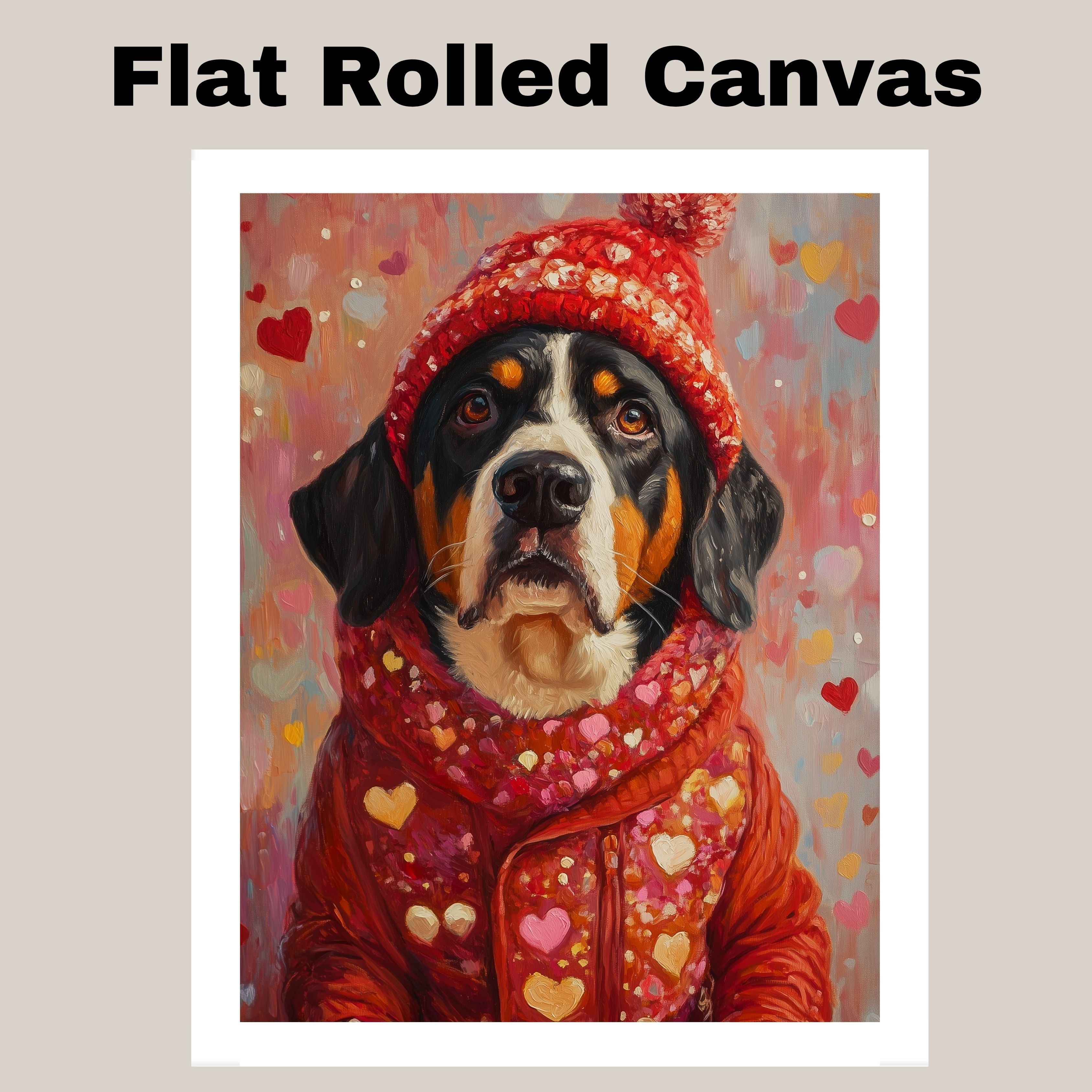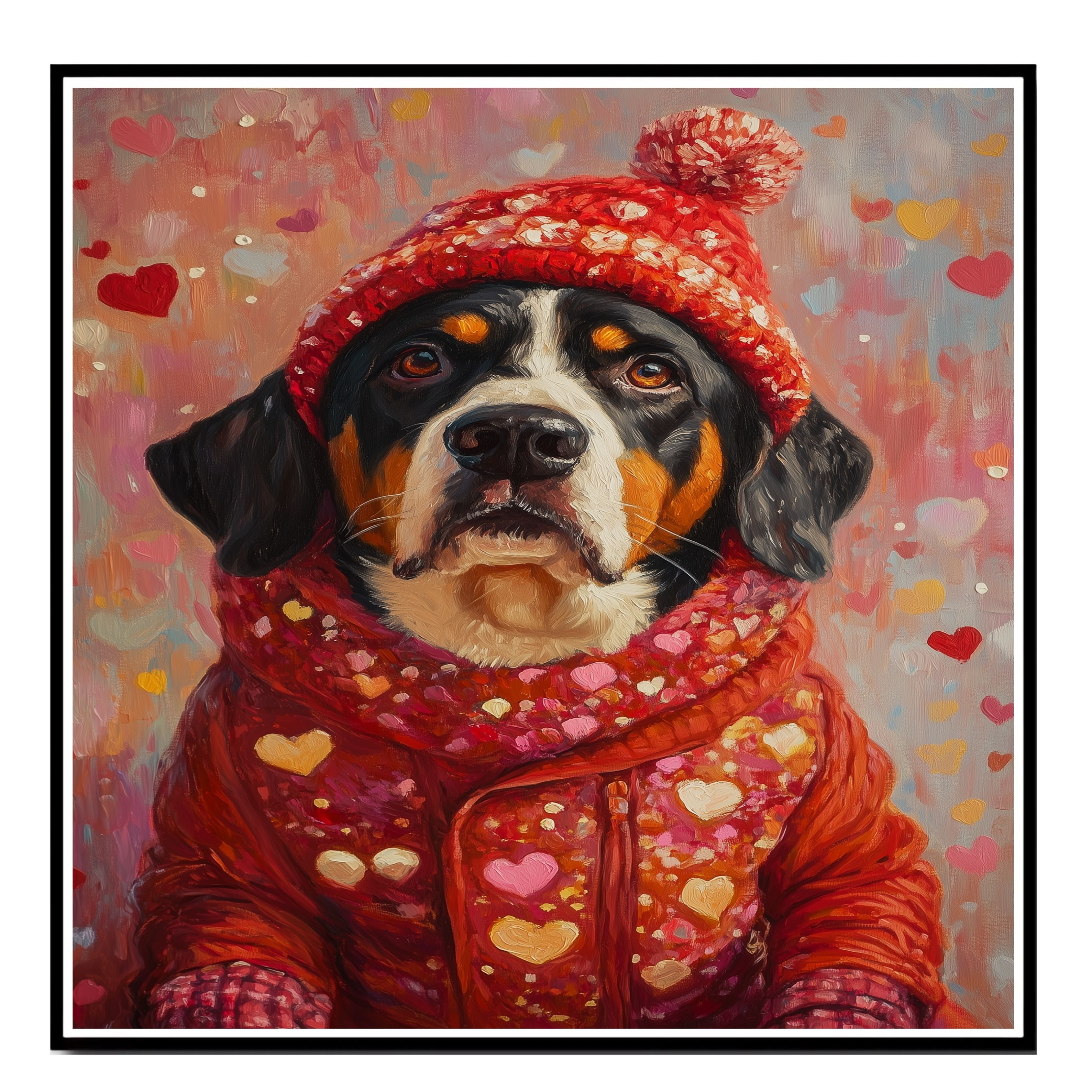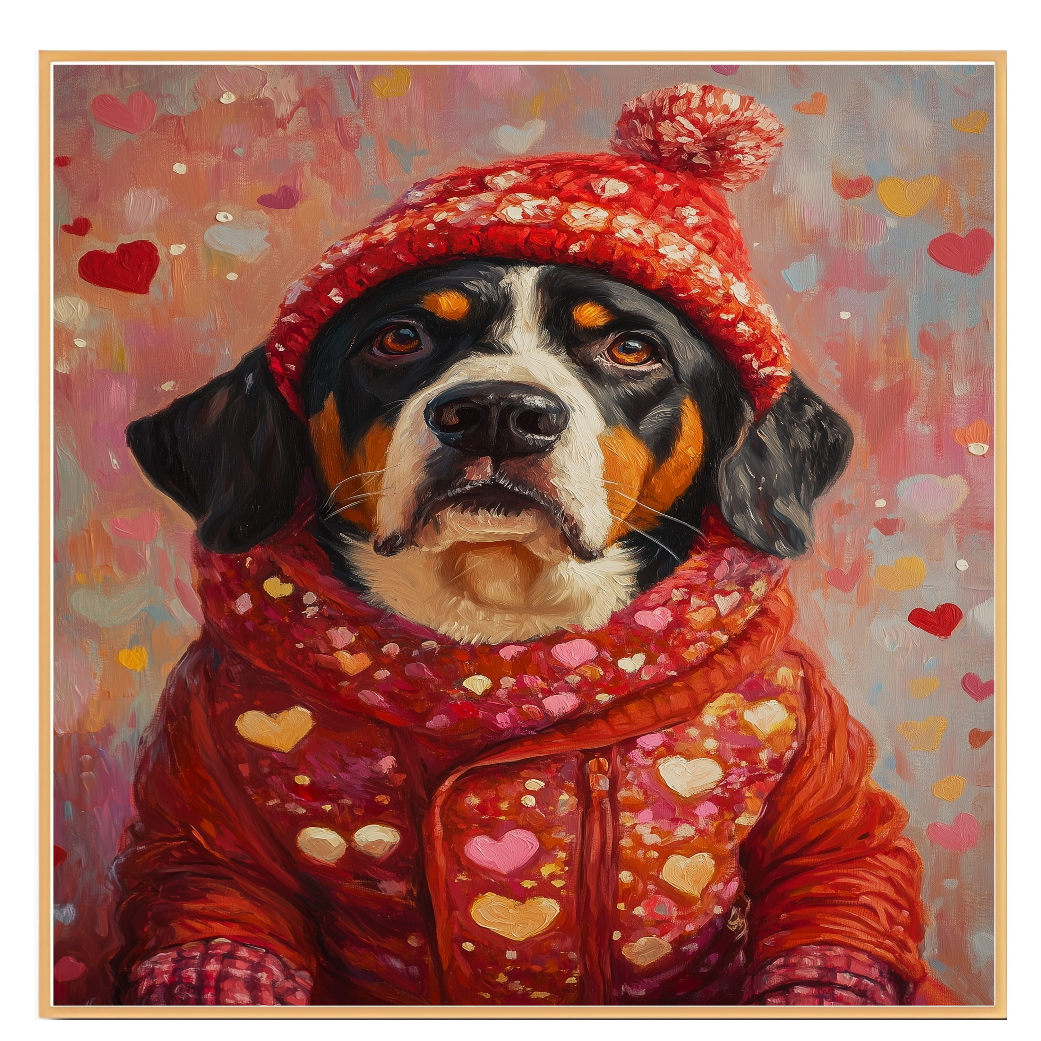 Our "Cozy Heart" Canvas captures the lovable charm of a Bernese Mountain Dog dressed in a festive red winter jacket and hat, radiating warmth and seasonal joy. This whimsical artwork beautifully blends the dogs gentle nature with the coziness of winter, making it a heartwarming addition to your holiday decor. With rich, vibrant colors and intricate detailing, this enchanting piece brings a touch of seasonal magic to any space. Available on a 1.5" thick canvas wrap, floating framed canvas, or flat rolled canvas, it makes a perfect gift for Bernese Mountain Dog lovers and those who cherish the spirit of winter.