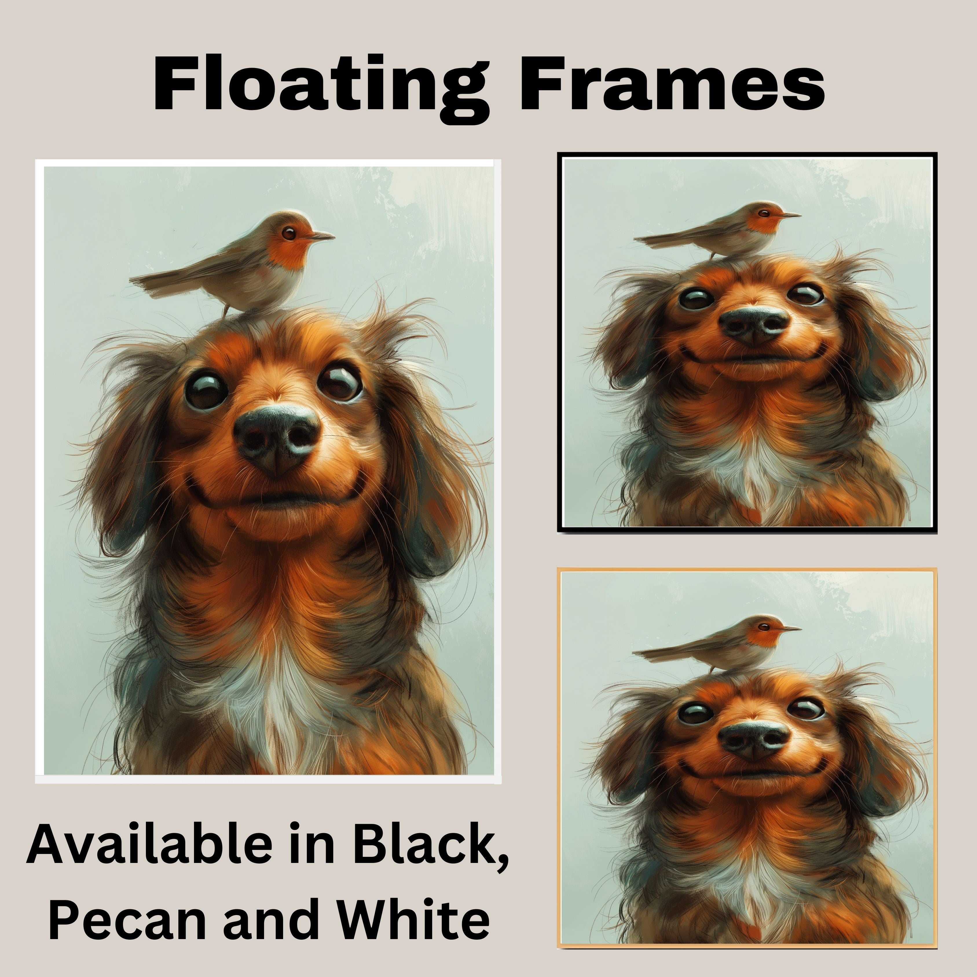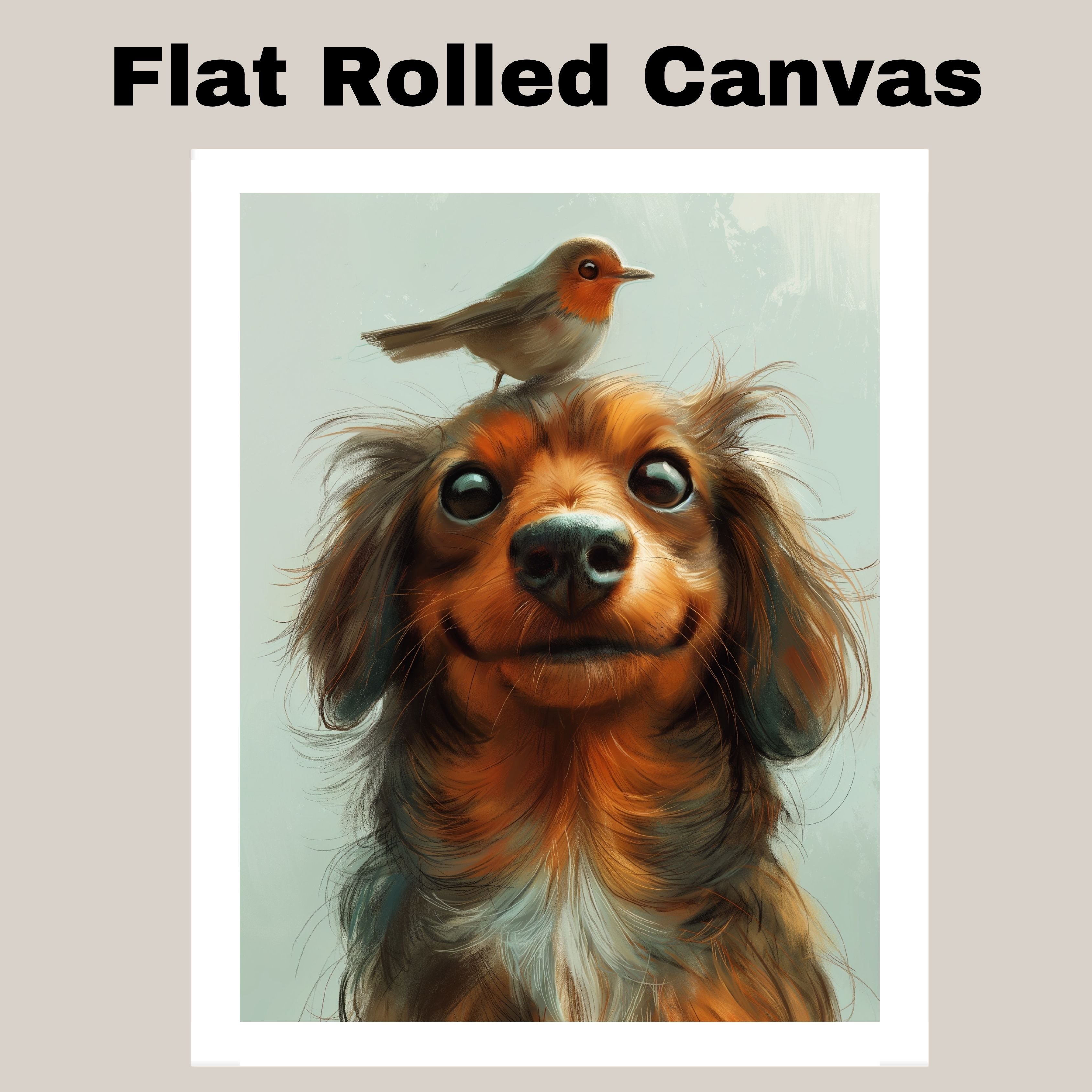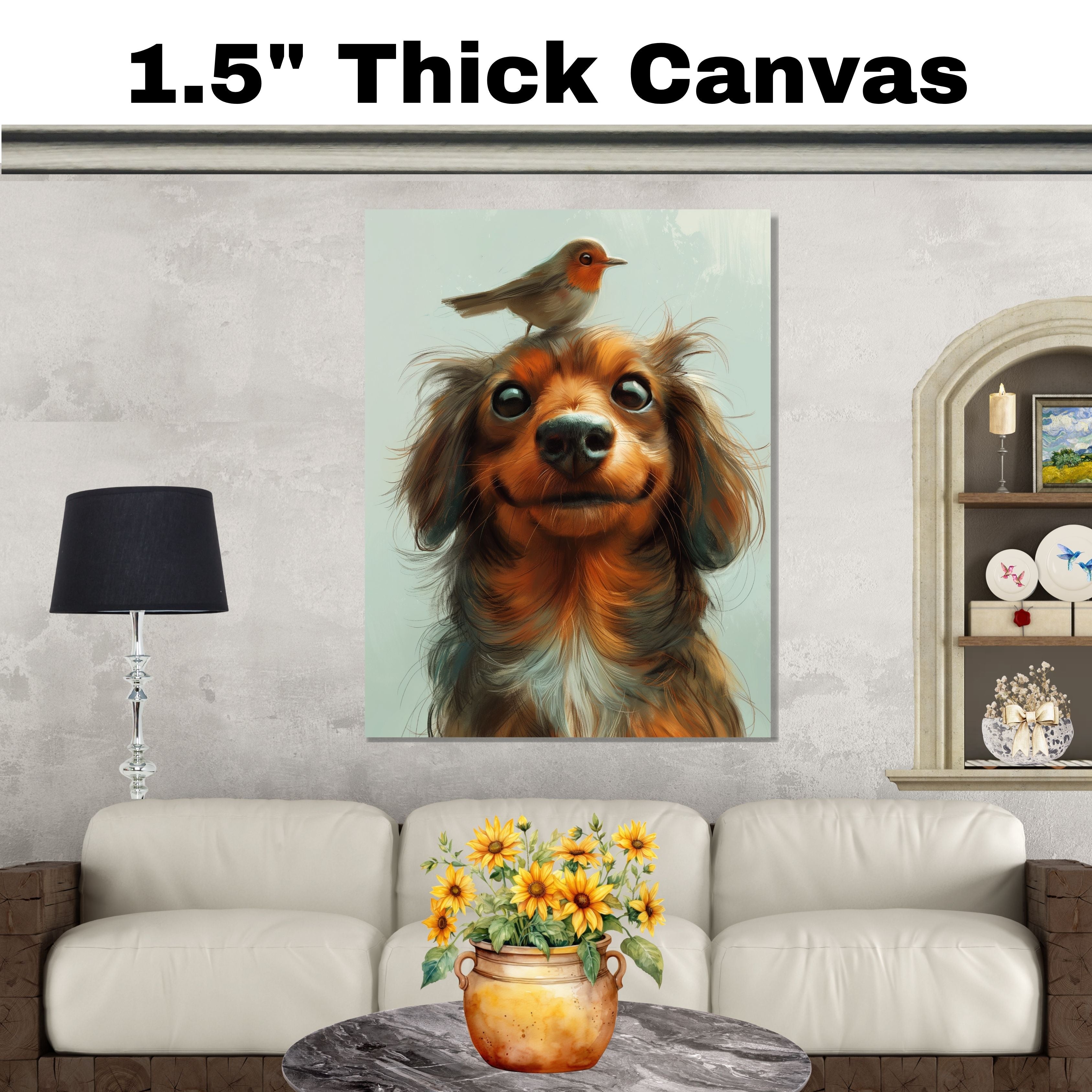 Cute Long-Haired Dachshund with Red-Breasted Bird on Head Whimsical Animal Illustration for Kids Room or Nursery Art Print for Dog and Bird Lovers on Ready to Hang 1.5" Thick Canvas Wrap, Floating Framed Canvas, Flat Rolled Canvas