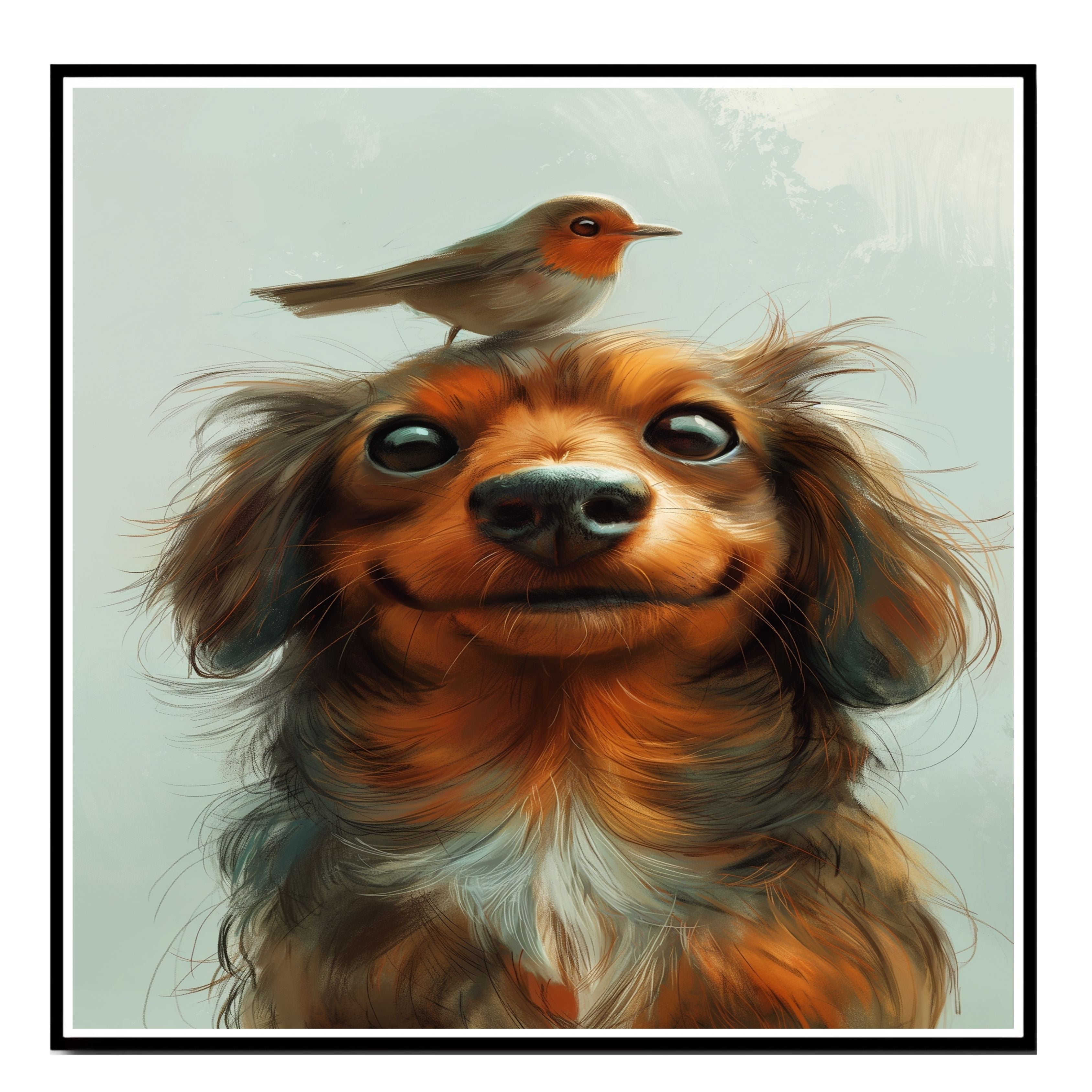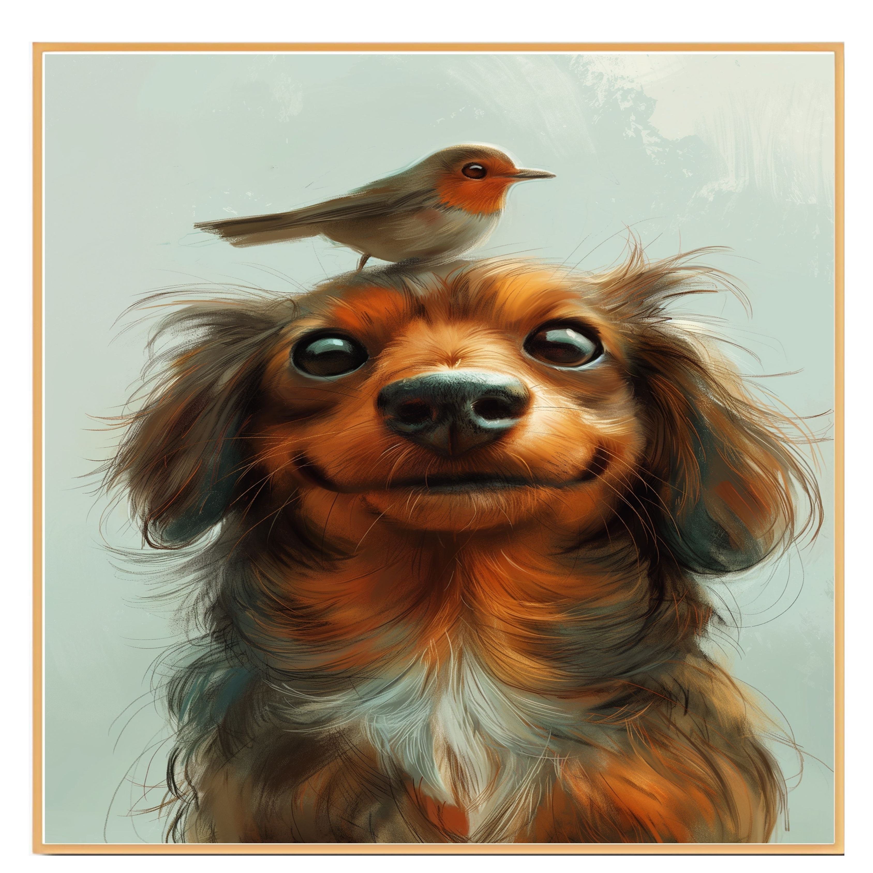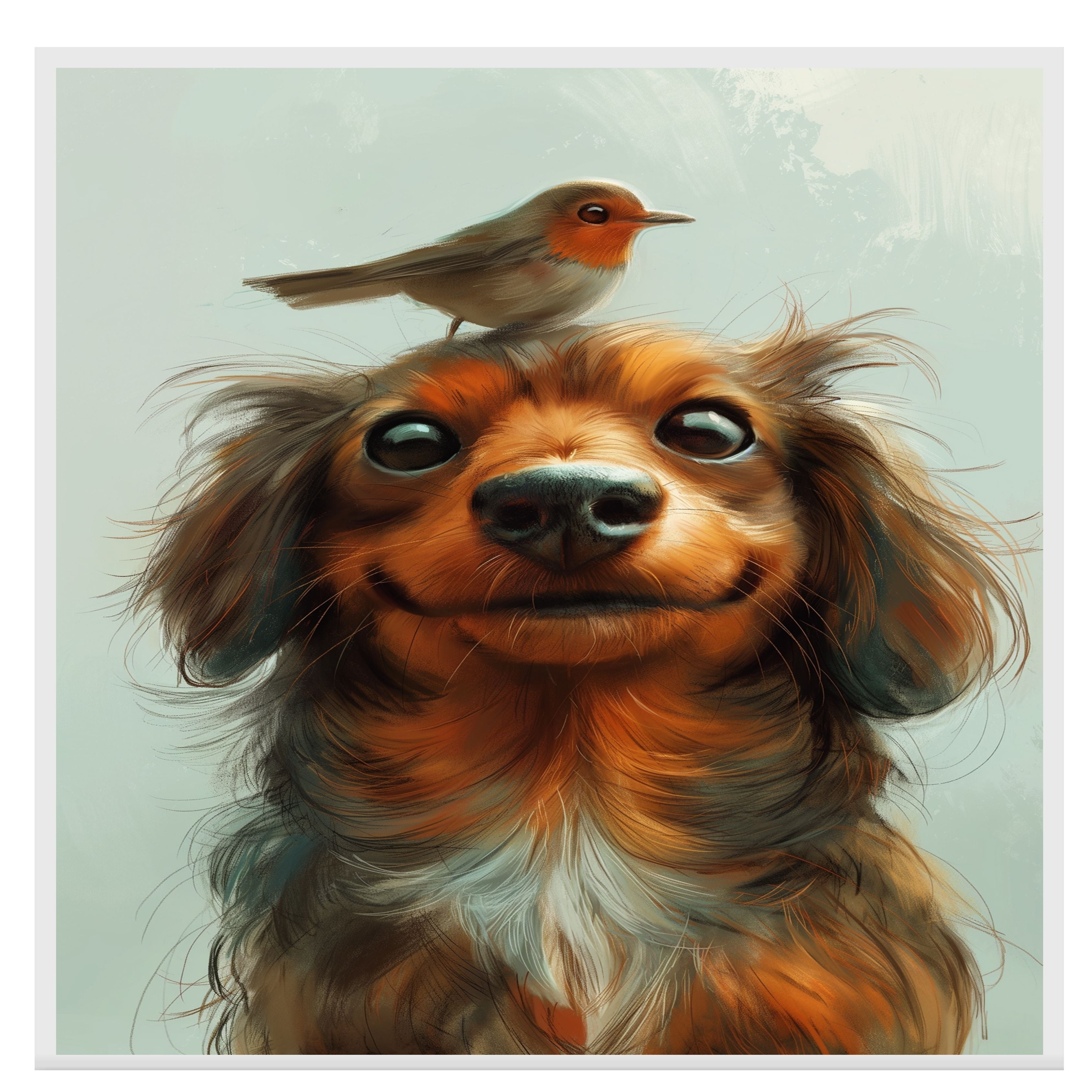 This heartwarming artwork features a joyful long-haired dachshund with a gentle red-breasted bird perched on its head....