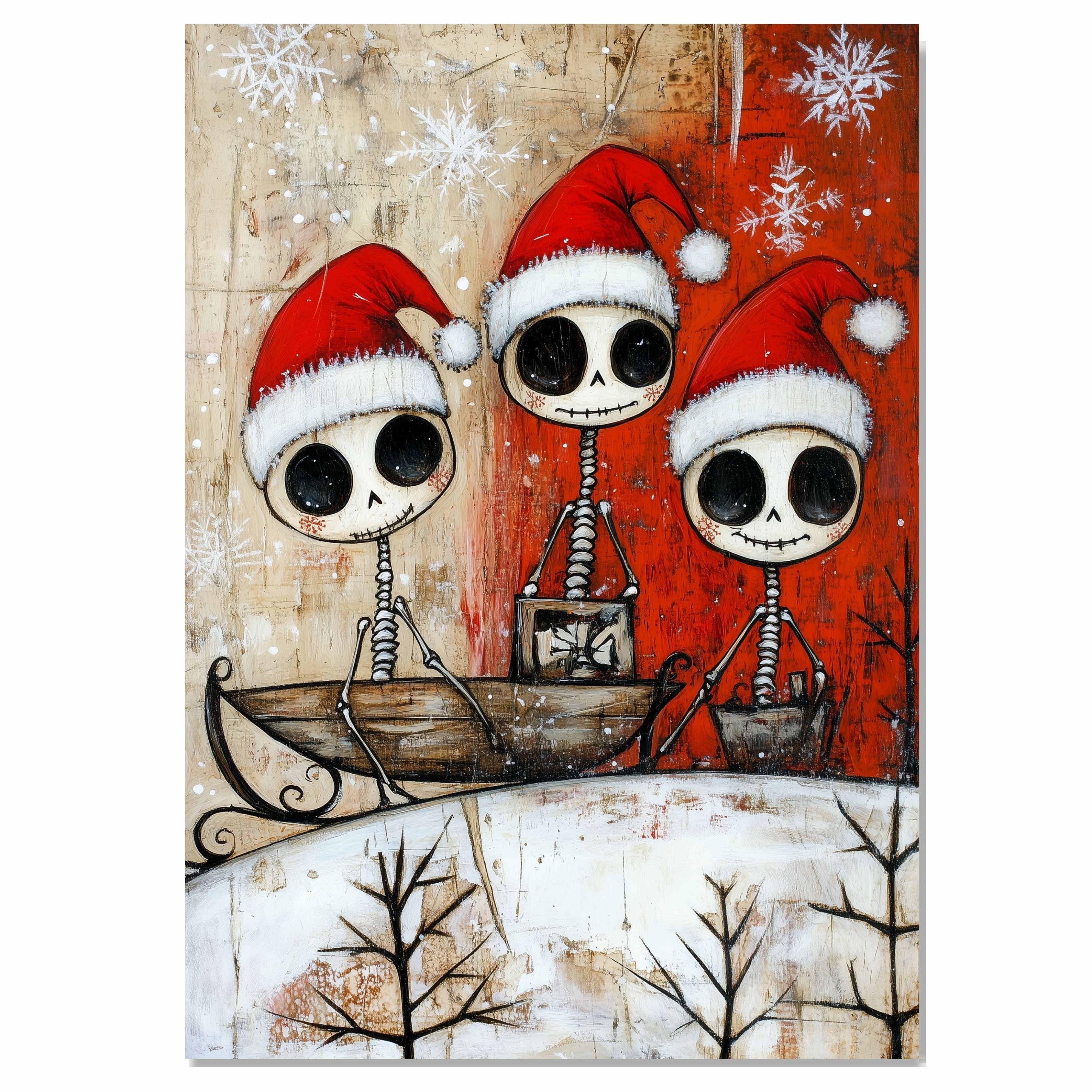 Cute Skeleton Trio Sleigh Ride Christmas Art Print – Whimsical Gothic Holiday Decor with Santa Hats & Gifts, Alternative Winter Wall Art for Spooky Season Lovers on Ready to Hang 1.5" Thick Canvas Wrap, Floating Framed Canvas, Flat Rolled Canvas