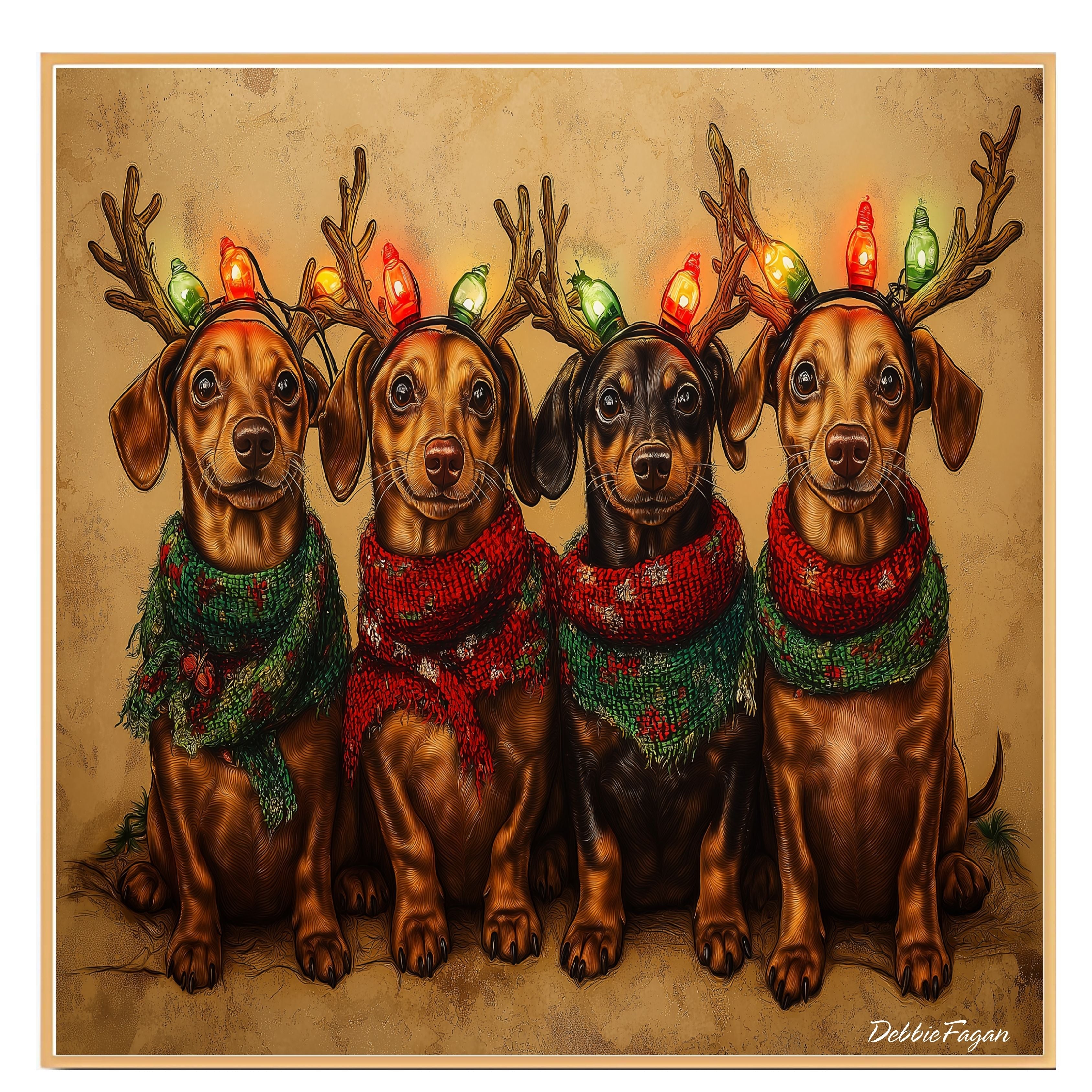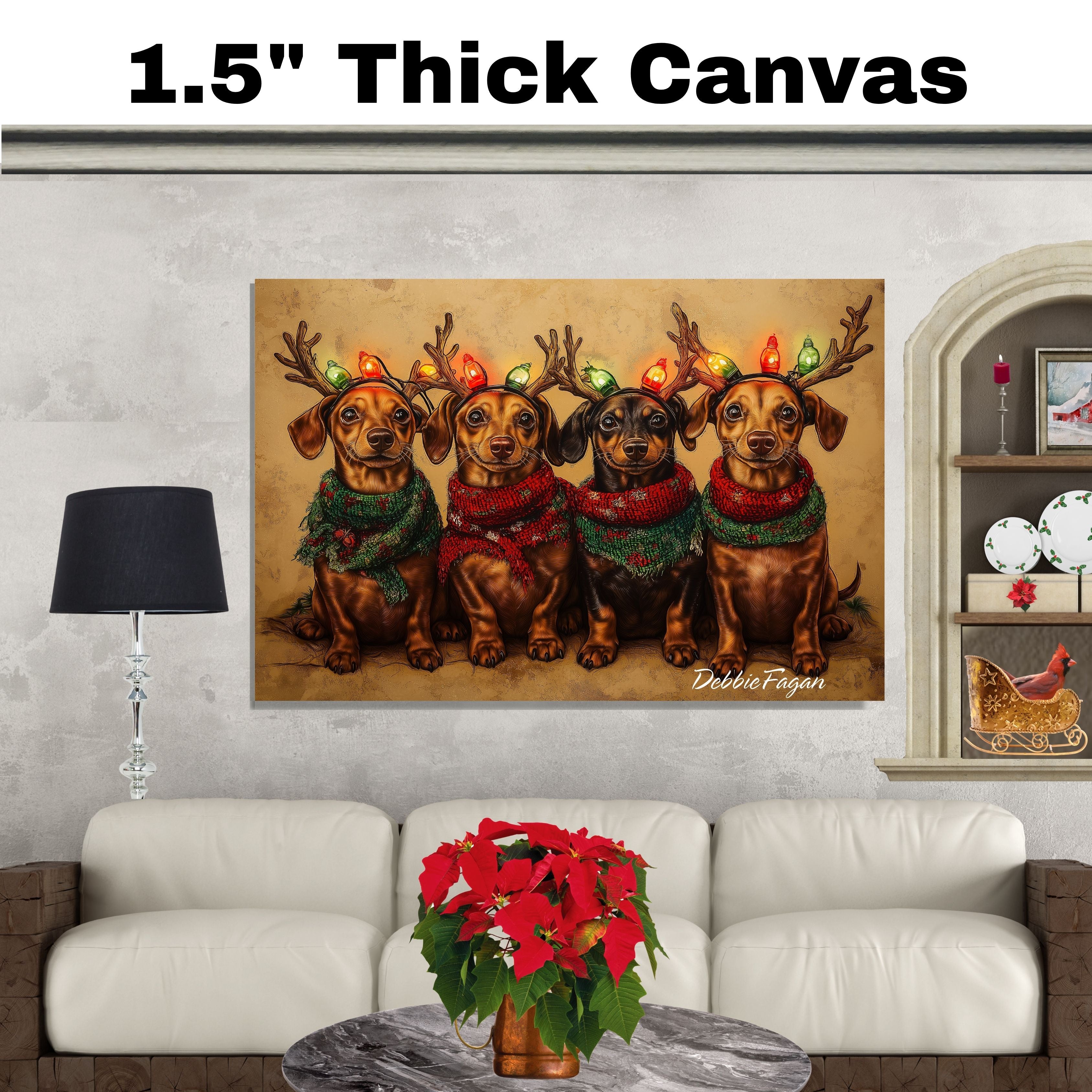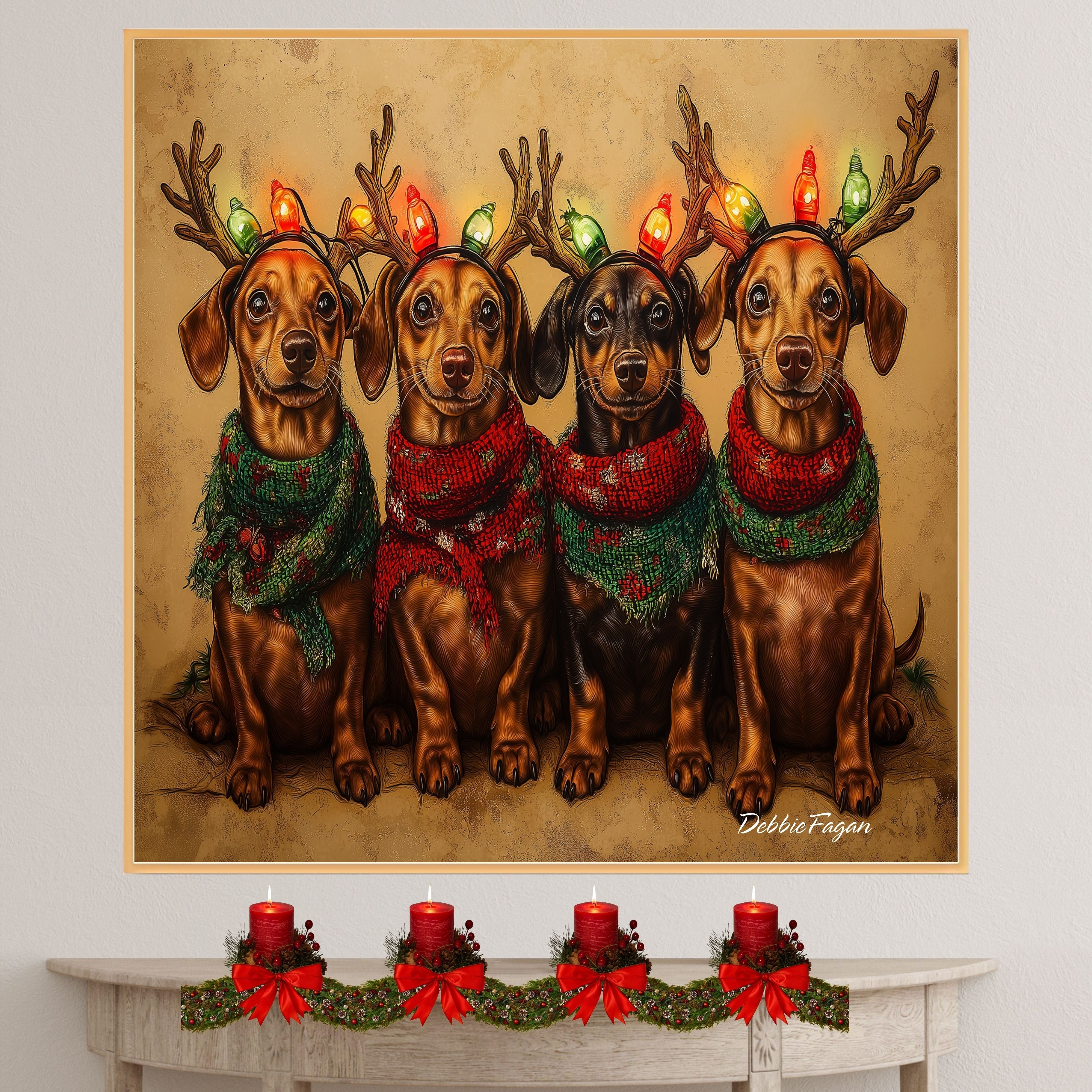 Festively Adorned Dachshund in Cozy Scarves Painting Our Rusty Rudolph Canvas adds a touch of holiday charm...