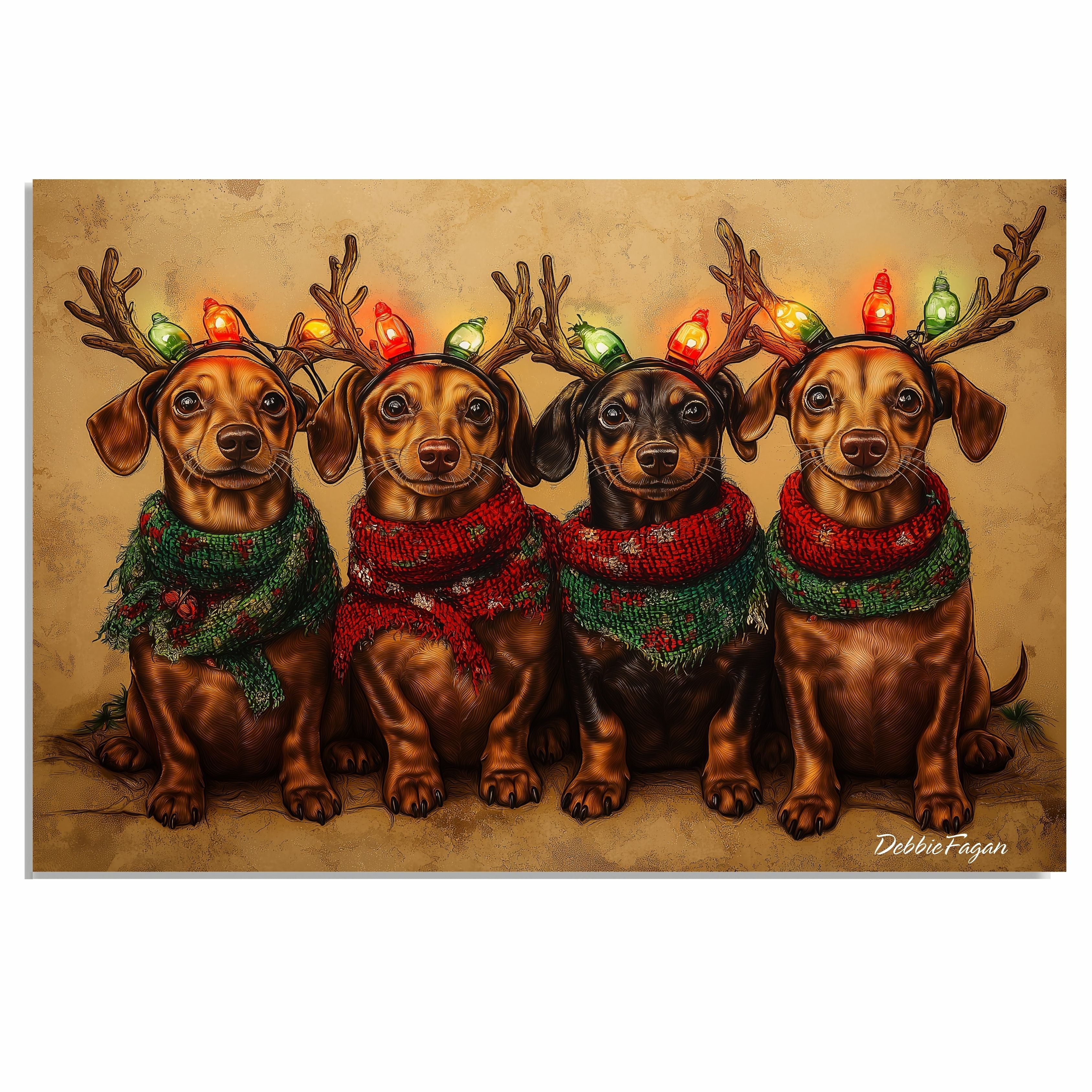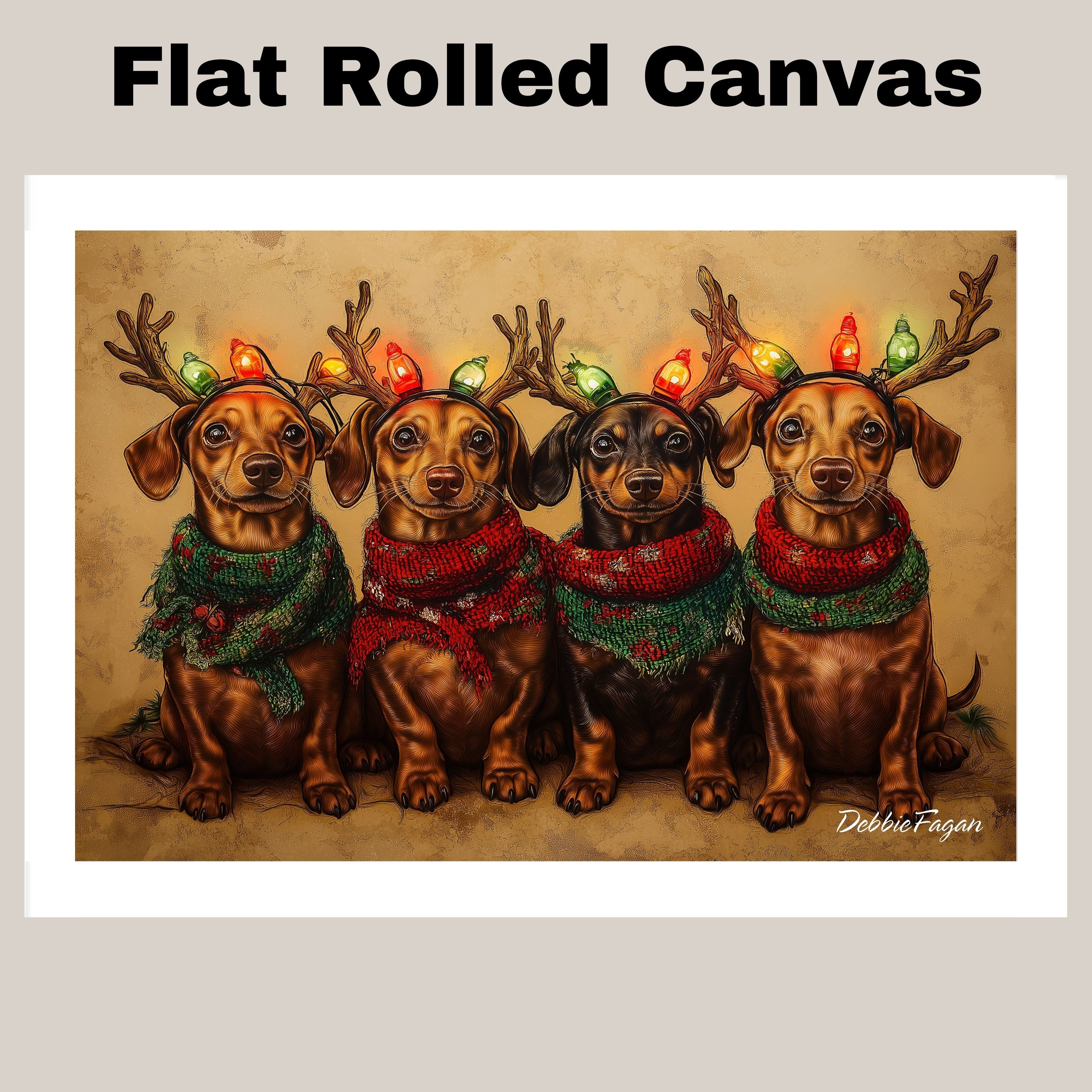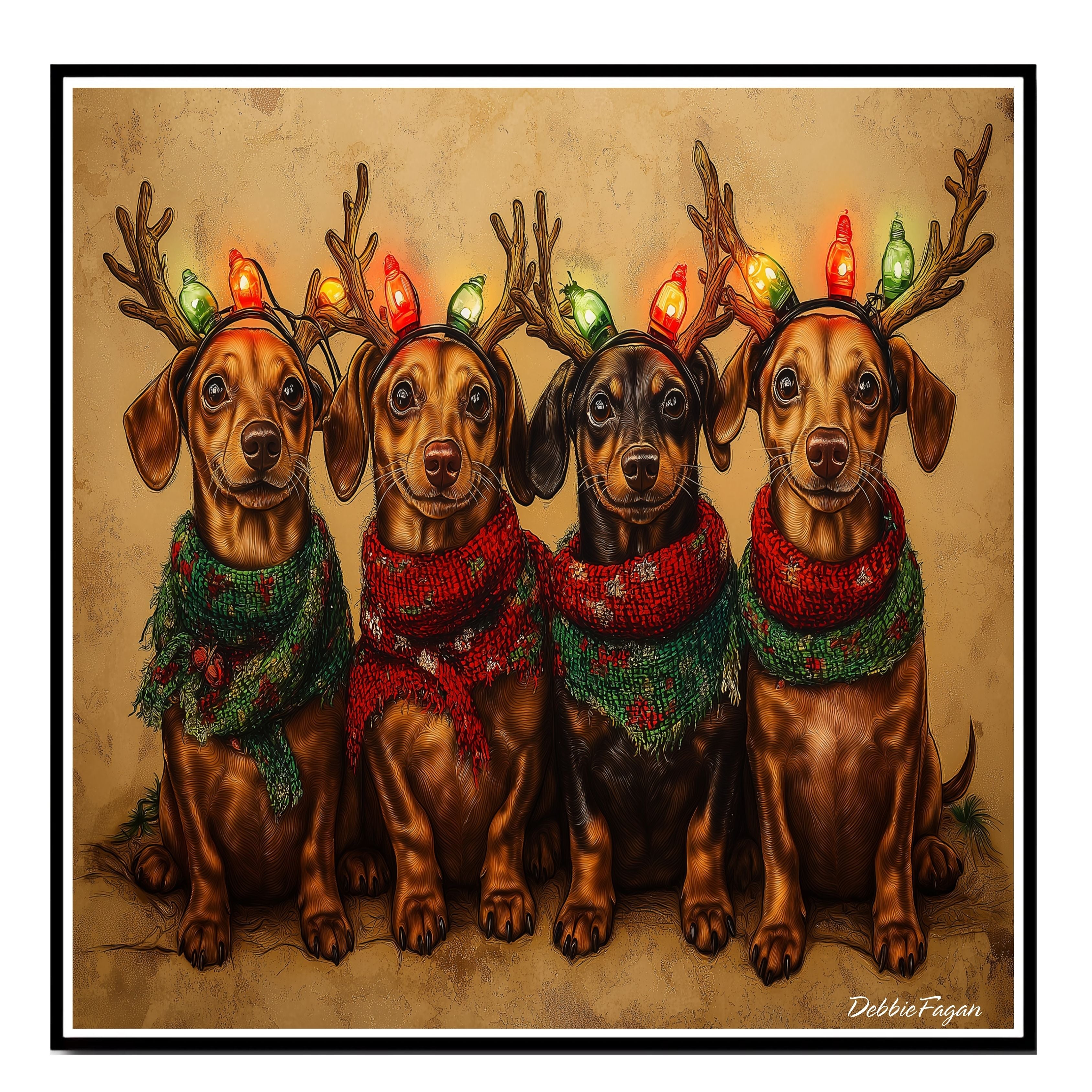 Festively Adorned Dachshund in Cozy Scarves Painting Our Rusty Rudolph Canvas adds a touch of holiday charm...