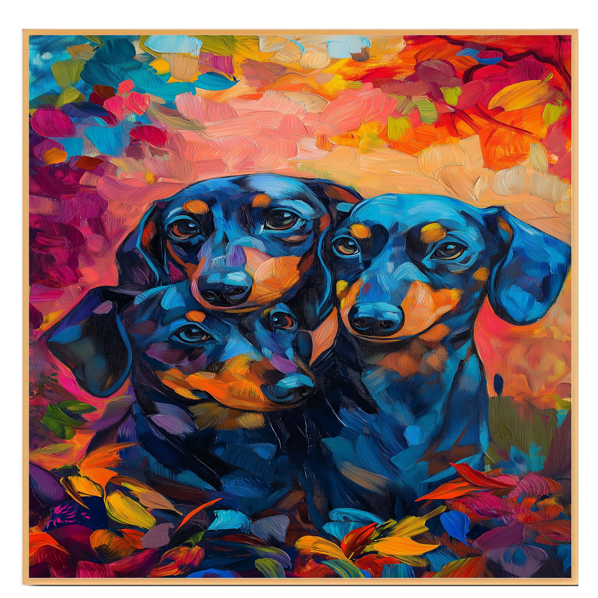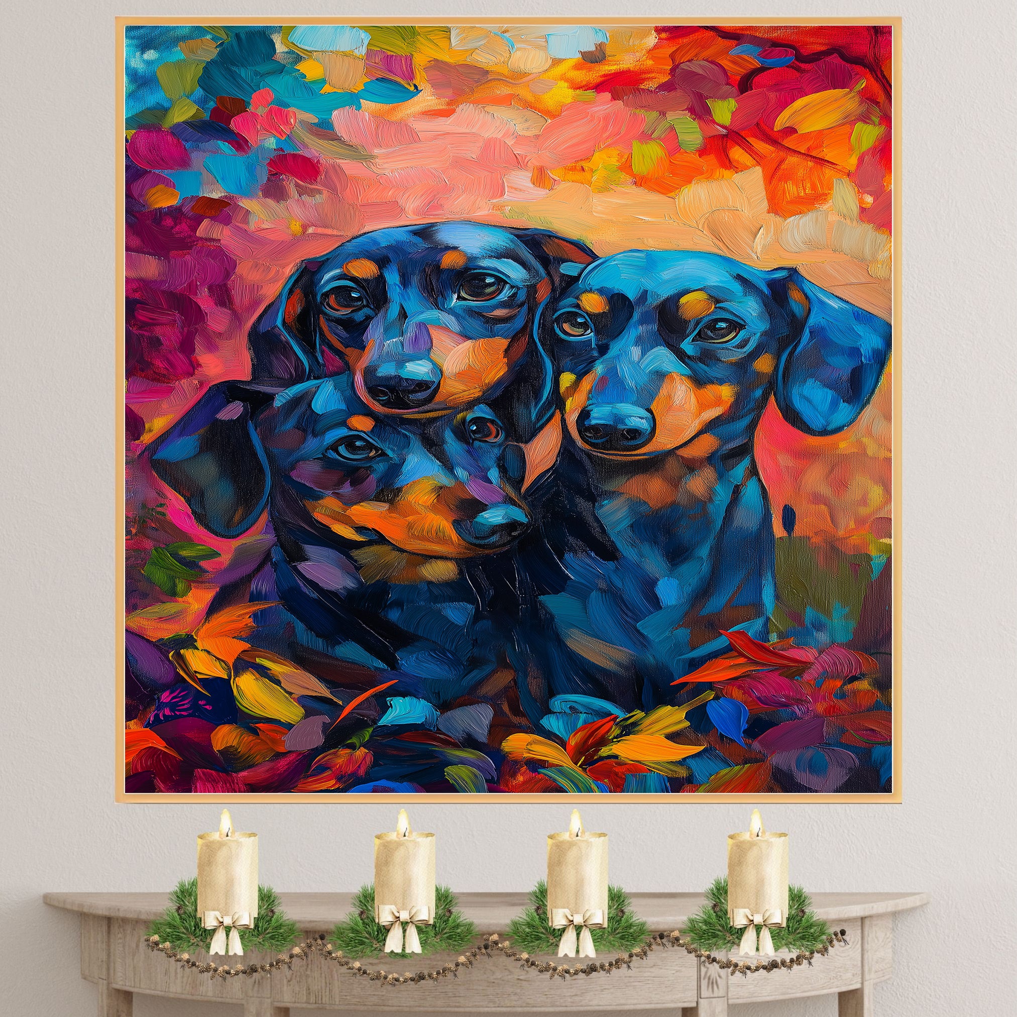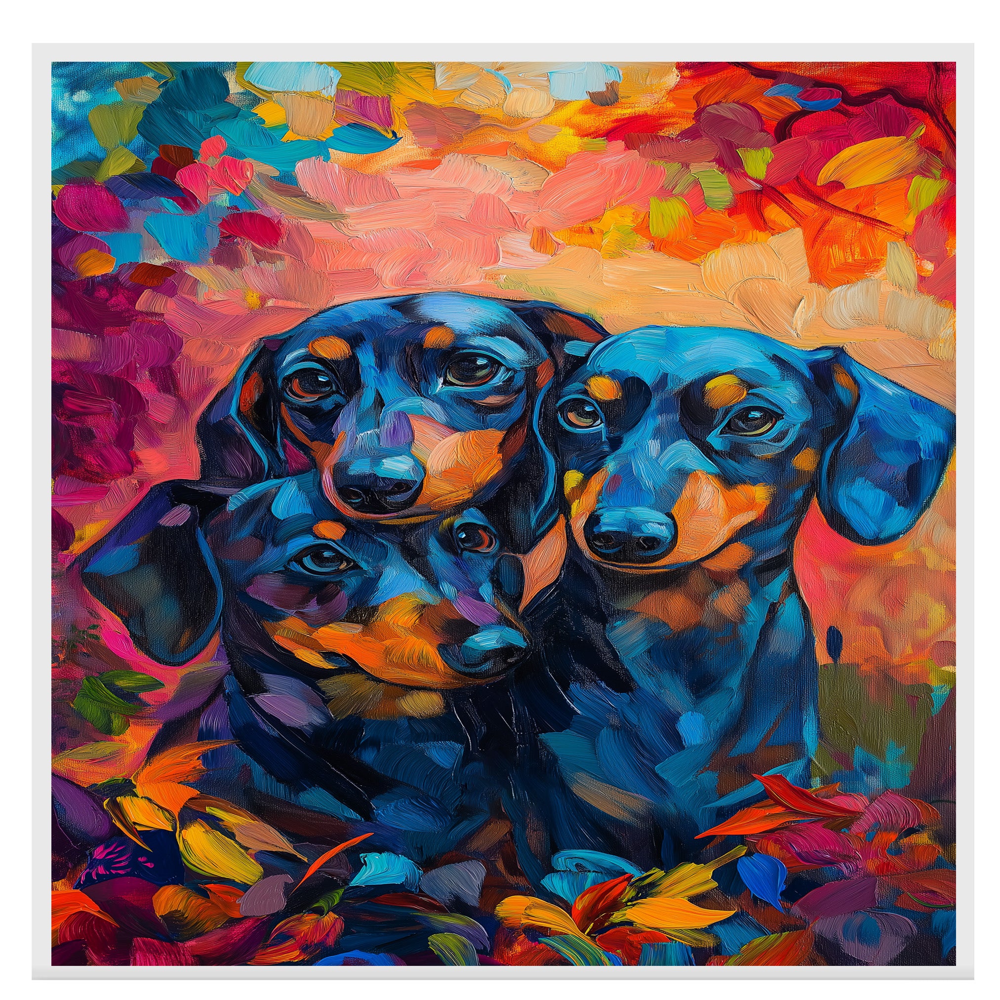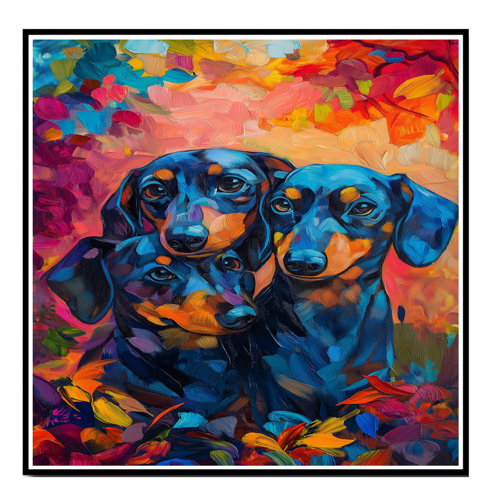Celebrate love and loyalty with this beautiful painting featuring a dachshund couple adorned with red heart collars, surrounded by a vibrant orange and red textured background. Expressive and heartwarming, this artwork is a perfect fit for cozy home decor, dog lovers, or meaningful gift ideas.