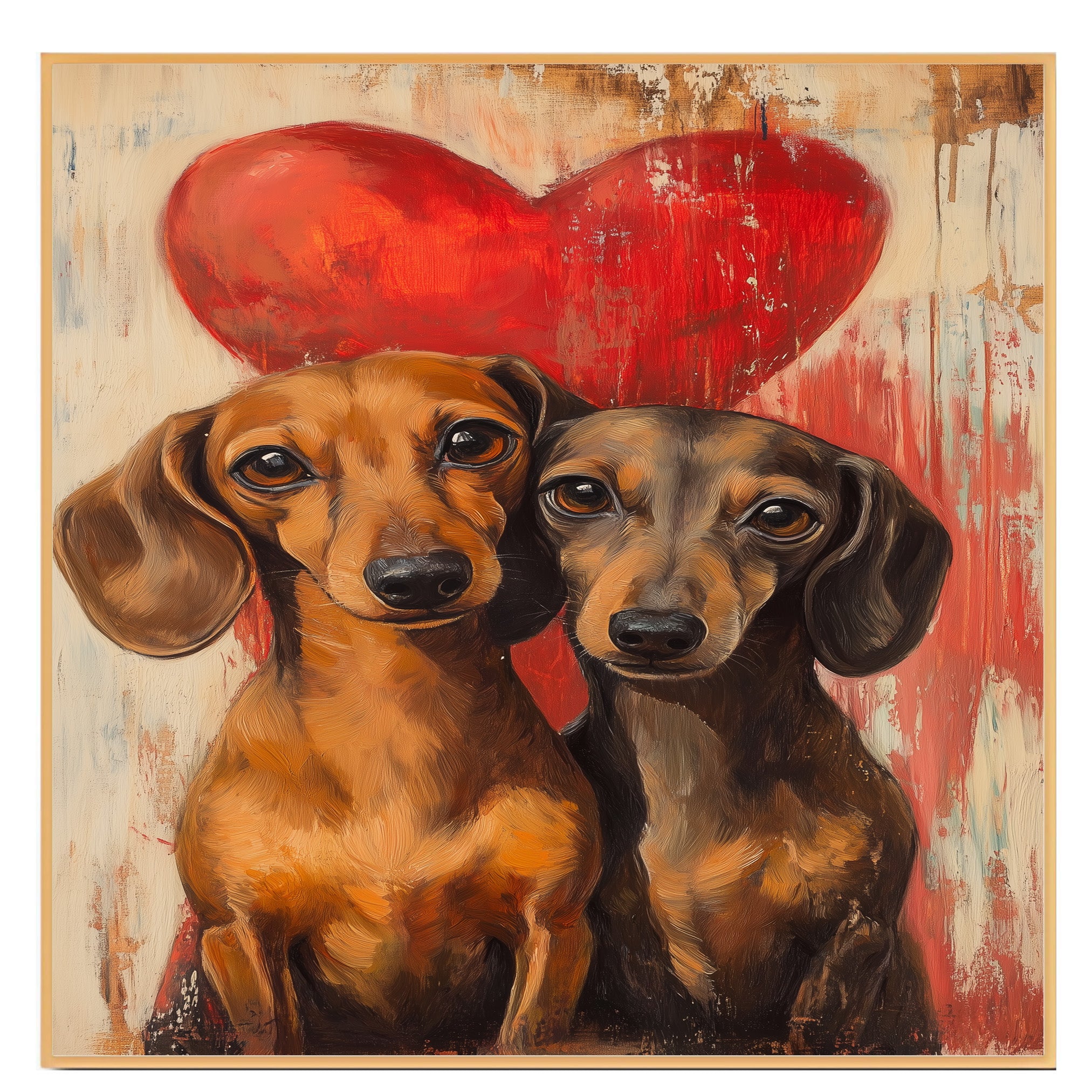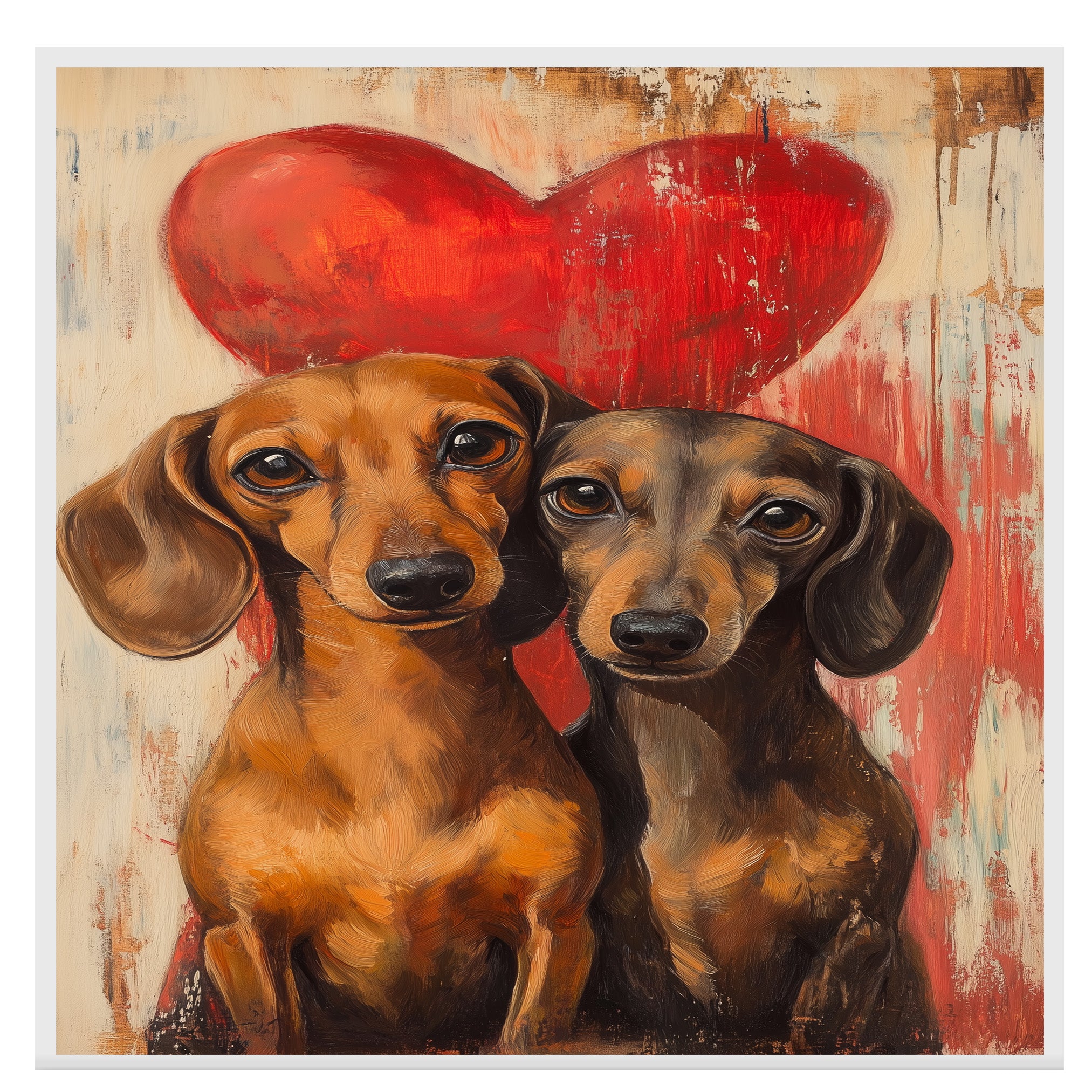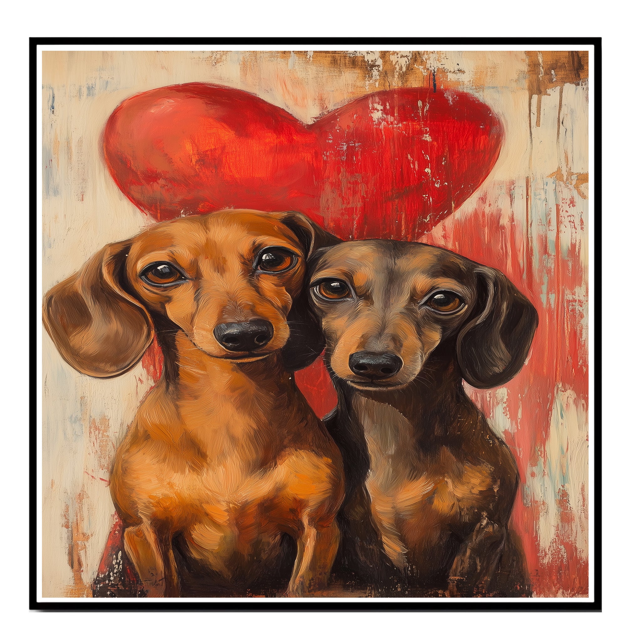 Capture the bond of love and loyalty with this charming painting featuring an adorable dachshund couple against a rustic background and bold red heart. With expressive eyes and warm tones, this artwork brings coziness and romance to any space. Perfect for dog lovers, couples, or heartfelt gift ideas.