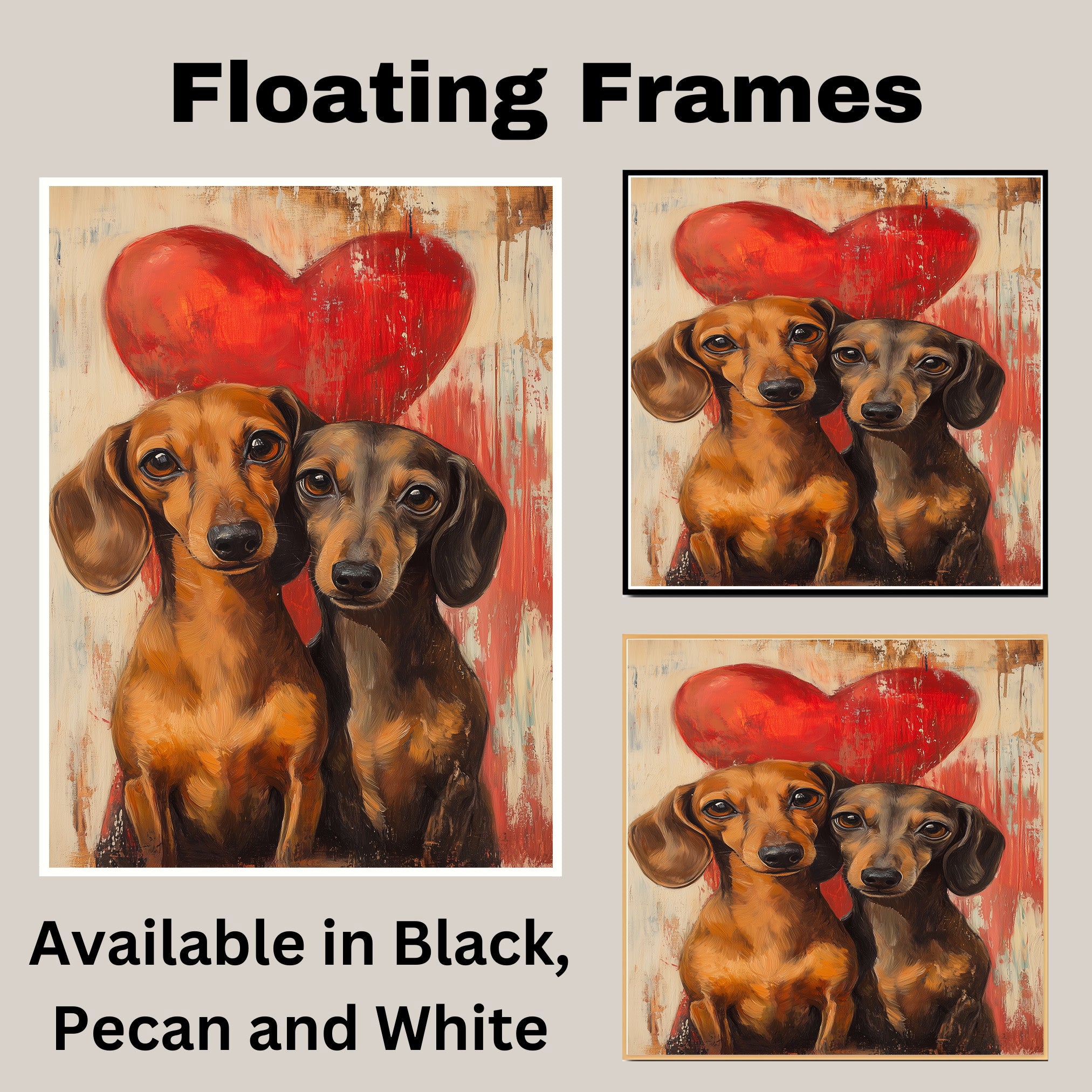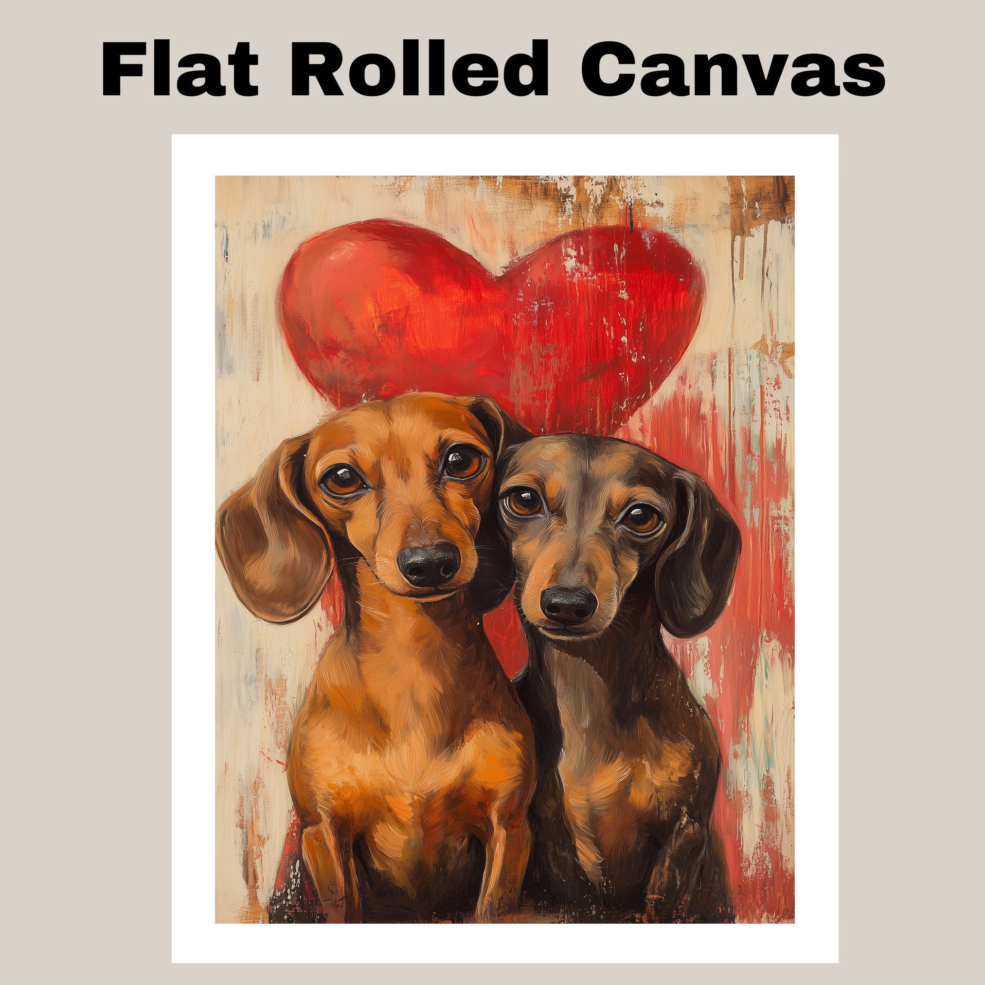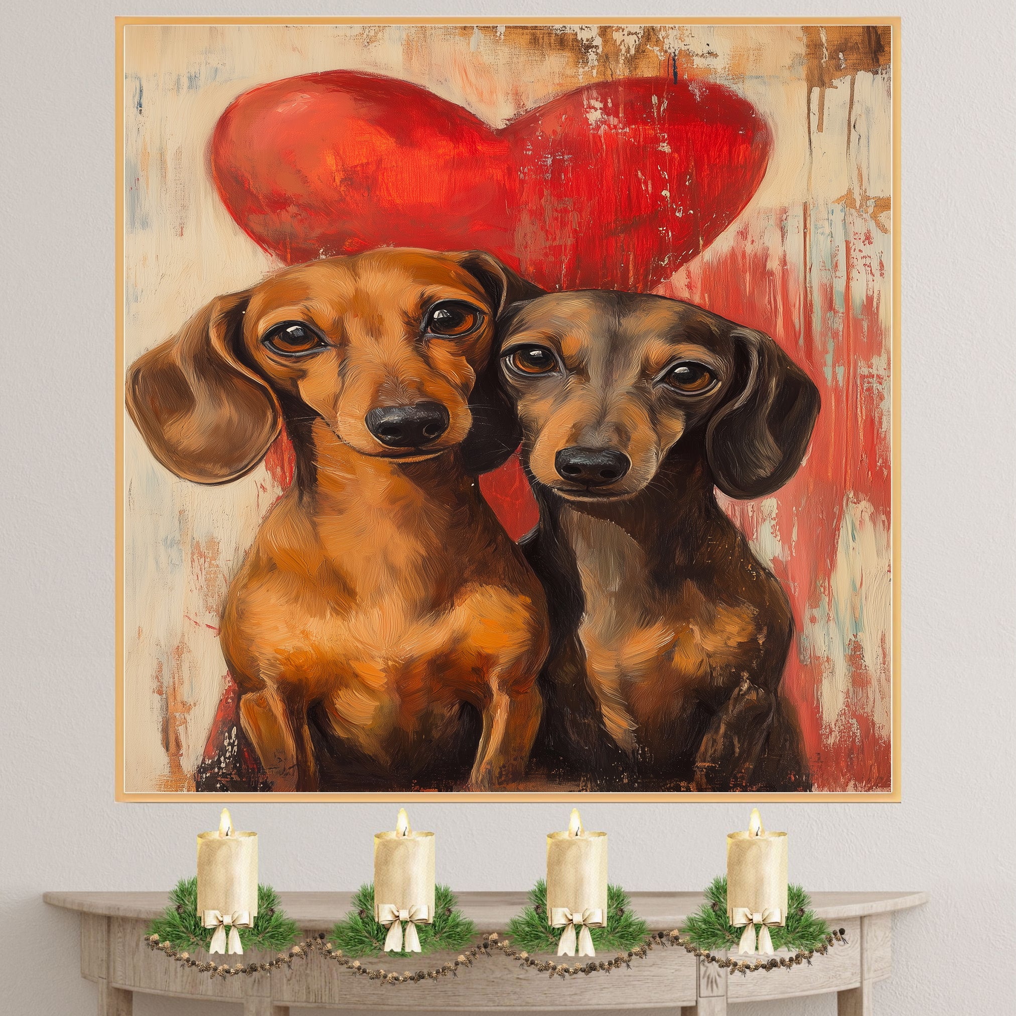 Capture the bond of love and loyalty with this charming painting featuring an adorable dachshund couple against a rustic background and bold red heart. With expressive eyes and warm tones, this artwork brings coziness and romance to any space. Perfect for dog lovers, couples, or heartfelt gift ideas.