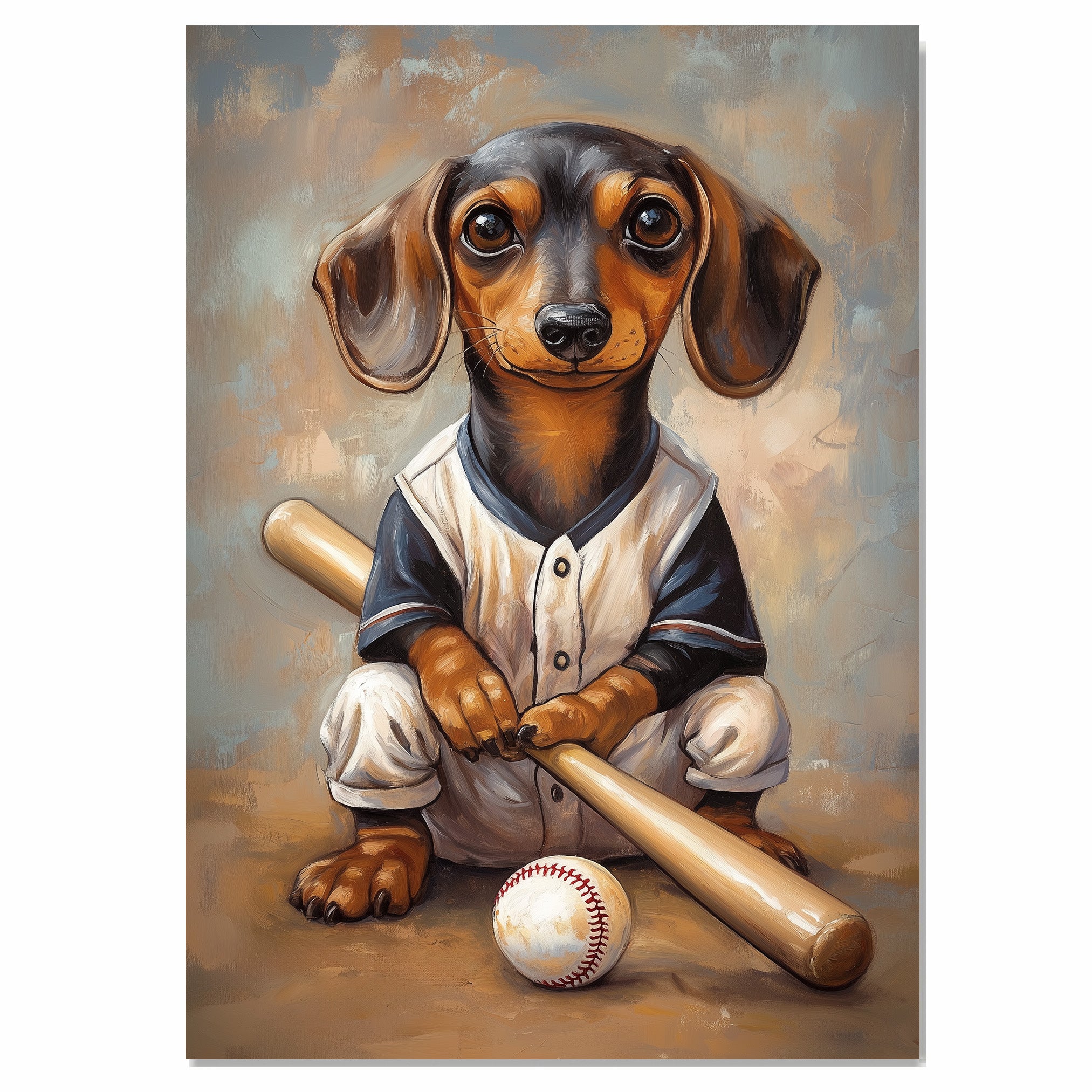 This artwork features an expressive dachshund dog dressed in a baseball uniform, holding a bat with a ball nearby. A perfect design for sports-themed home decor, kids’ room artwork, pet lover gifts, or poster prints. The painterly style and character-filled pose make it ideal for anyone who loves dogs, baseball, or whimsical animal art. Great for wall art, nursery decoration, themed collections, or creative design projects.