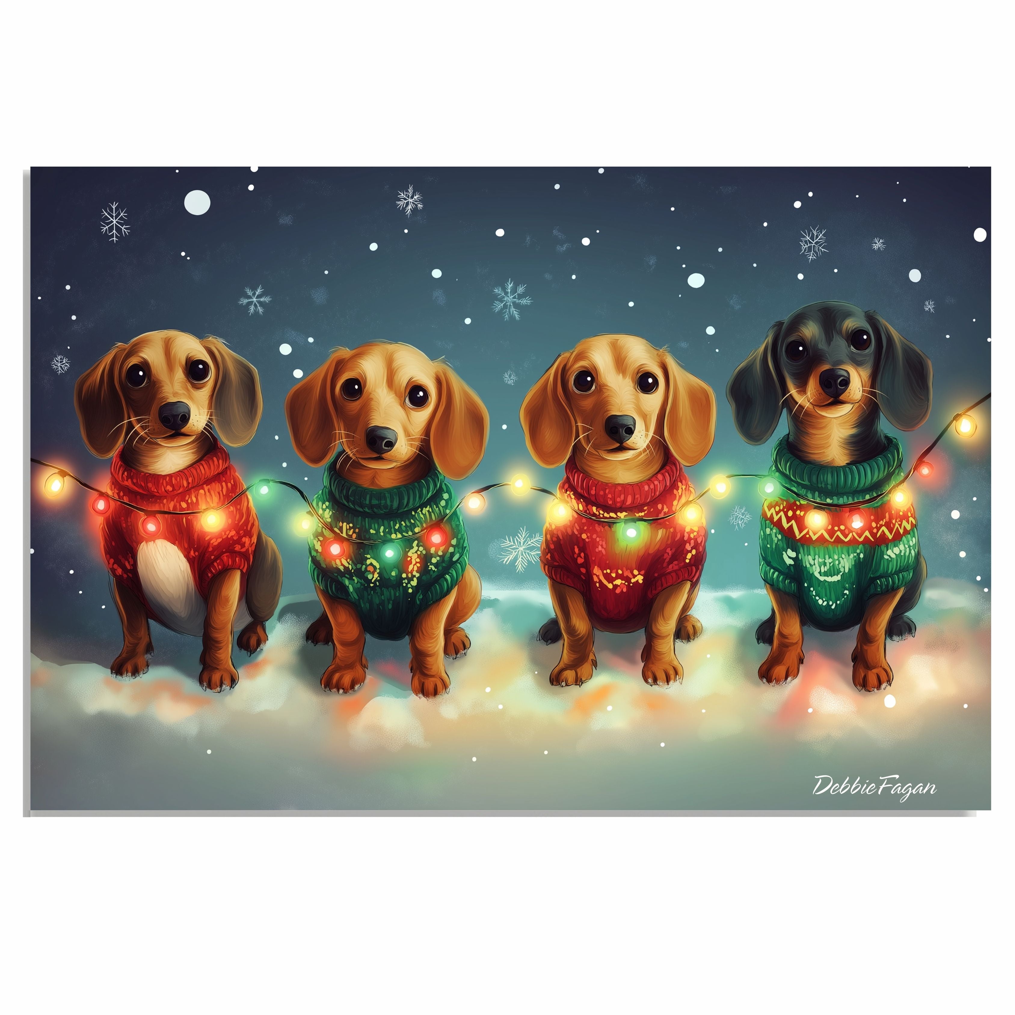 Cozy Doxies in Festive Sweaters Twinkling Holiday Lights in Winter Wonderland Painting Our Dachshund Merriment Canvas adds...