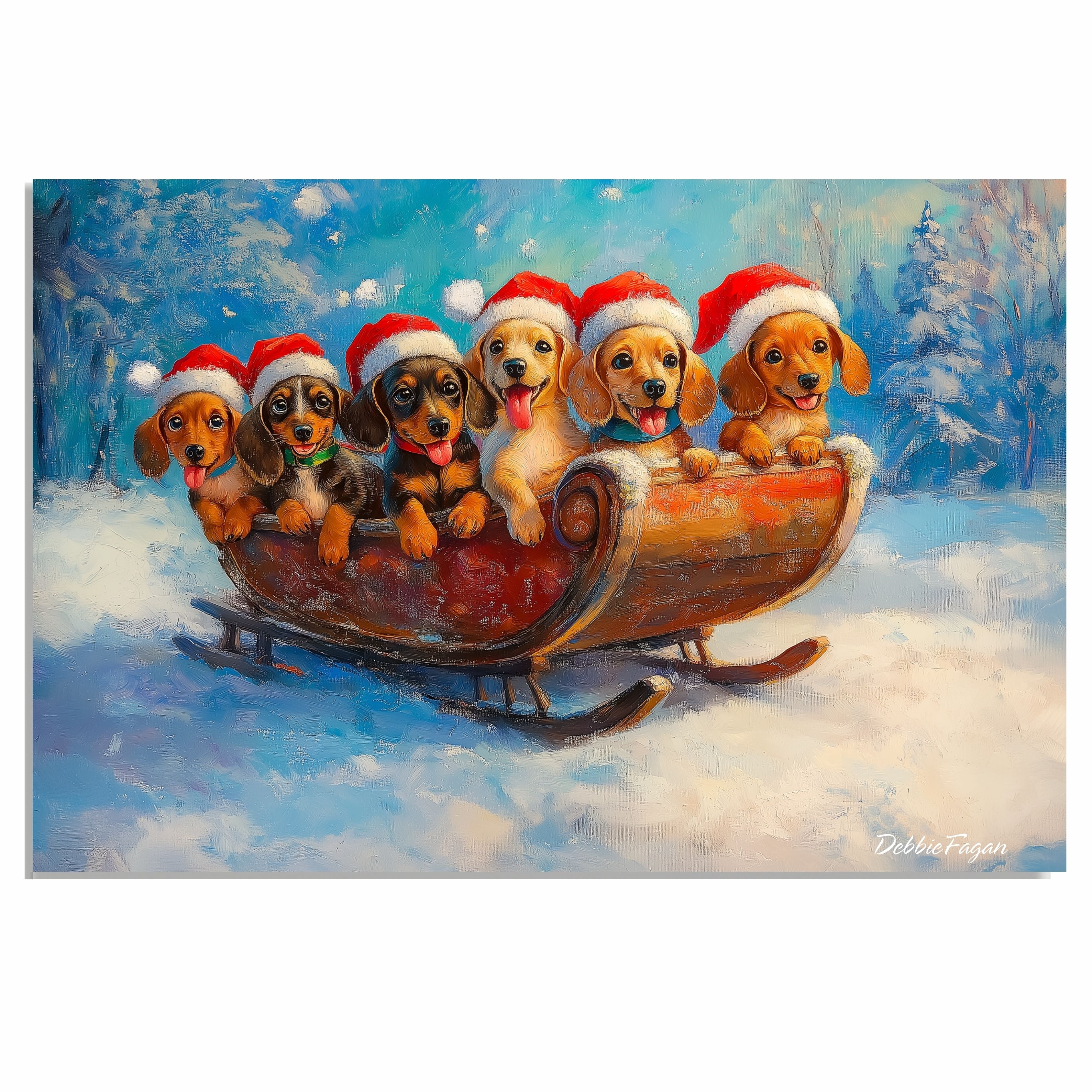 Our Dachshund Sleigh Ride Canvas adds a touch of festive fun and charm to your space, featuring a pair of adorable Dachshunds in Santa hats joyfully embarking on a sleigh ride through a snowy winter forest. Available on a 1.5" thick canvas wrap, floating framed canvas, or as a flat rolled canvas, this delightful artwork captures the whimsical holiday spirit with its playful scene. Perfect for bringing cheer to your holiday decor, this heartwarming piece will be an eye-catching focal point in any room, evoking smiles and creating a cozy, festive atmosphere.
