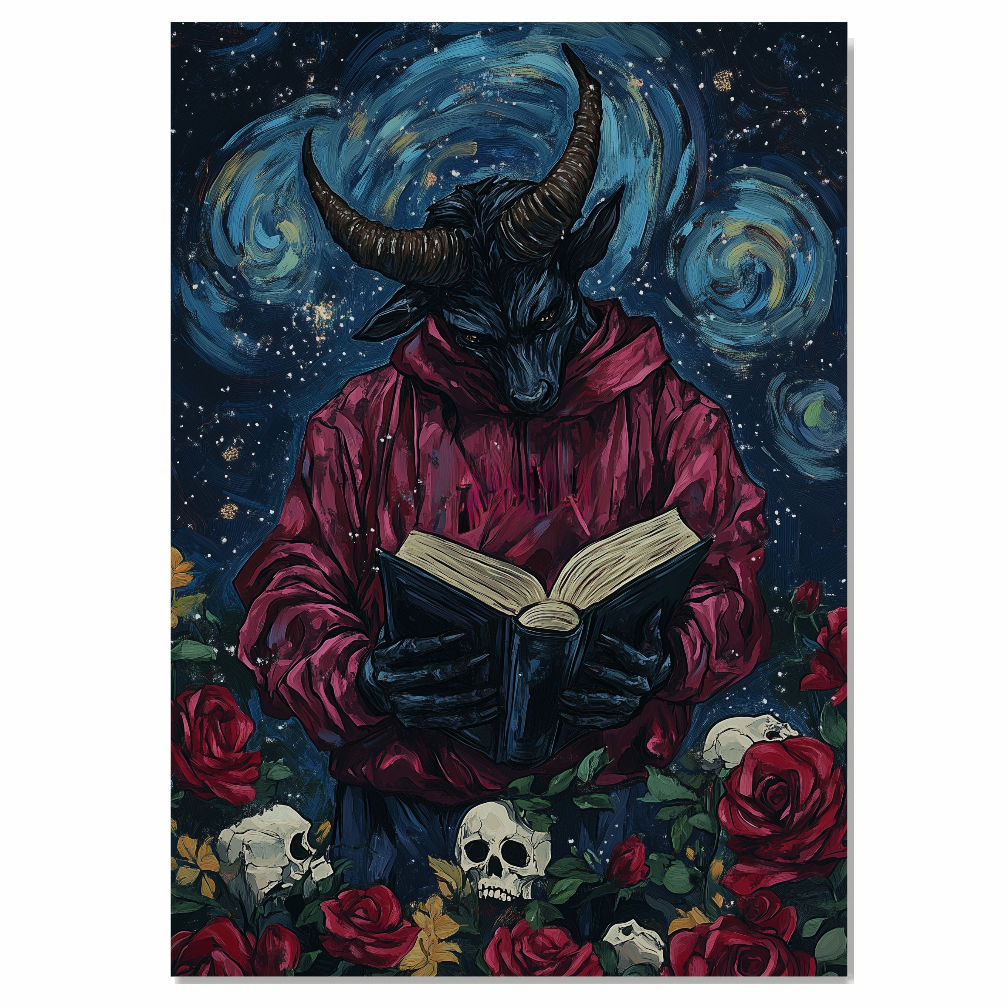 A powerful blend of modern and mythic, this artwork features a horned demon-like figure cloaked in a red hoodie, engrossed in a mysterious book. Surrounded by roses and human skulls, with swirling Van Gogh–inspired stars overhead, this piece merges urban symbolism with gothic and fantasy storytelling. Perfect for lovers of occult art, surreal horror, and bold visual narratives.