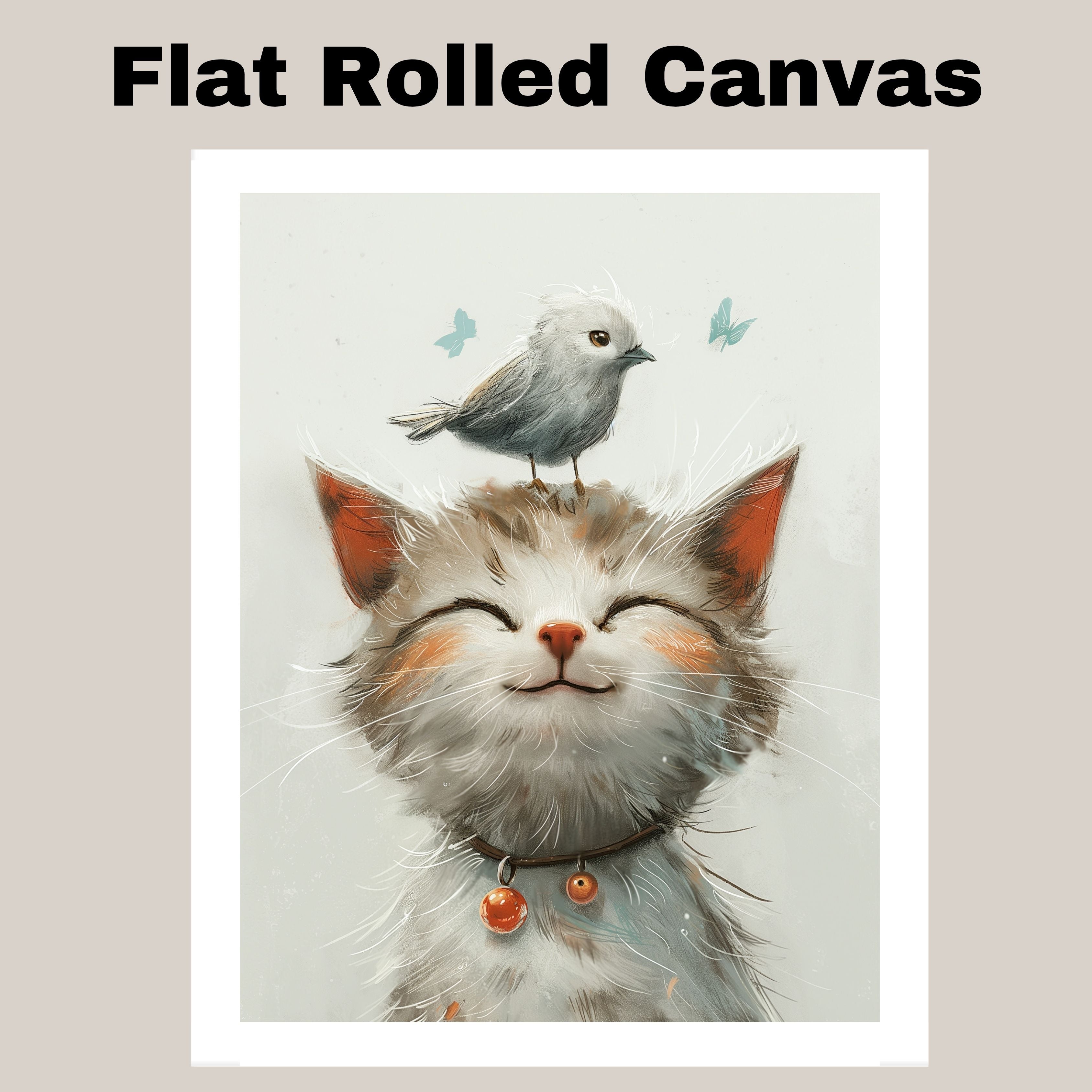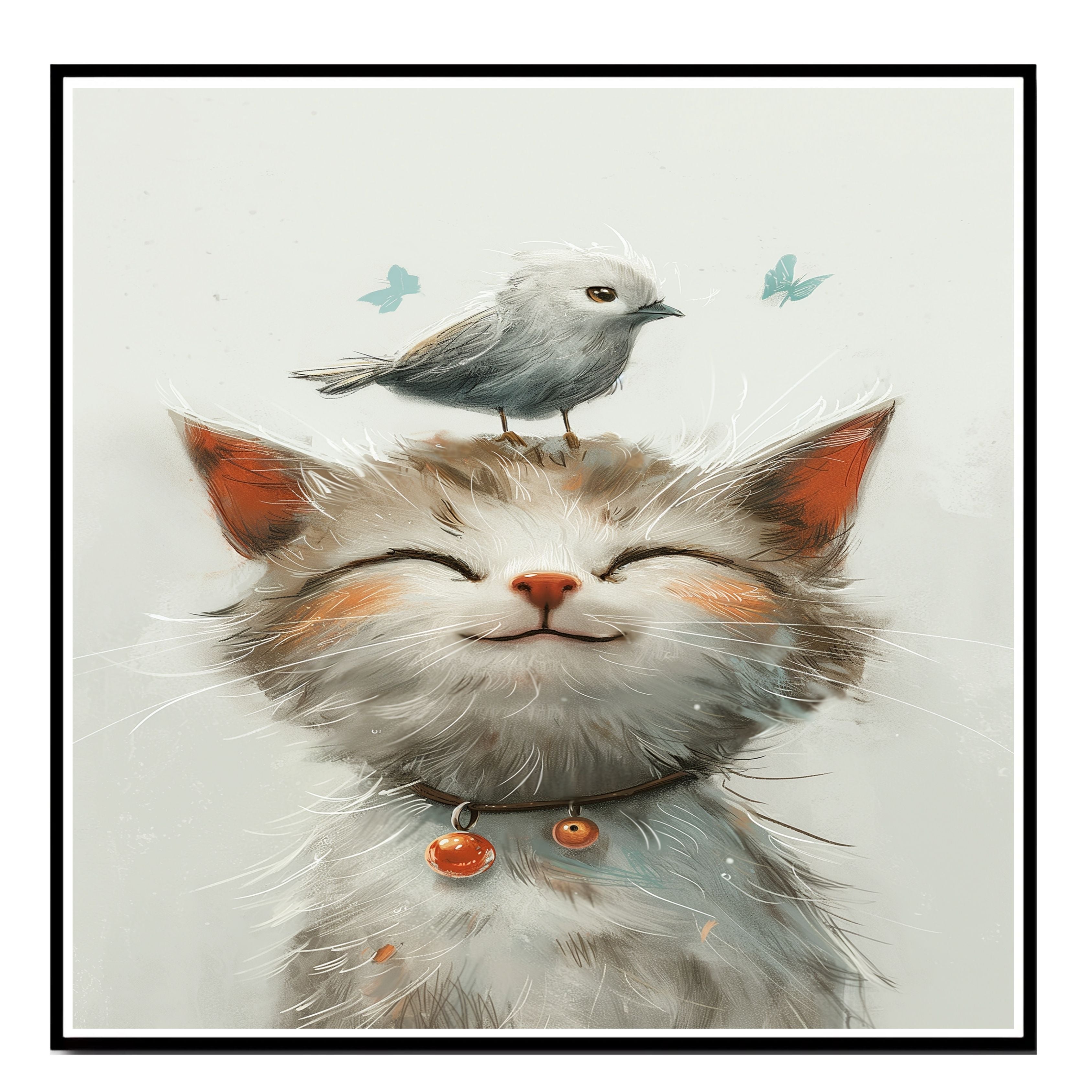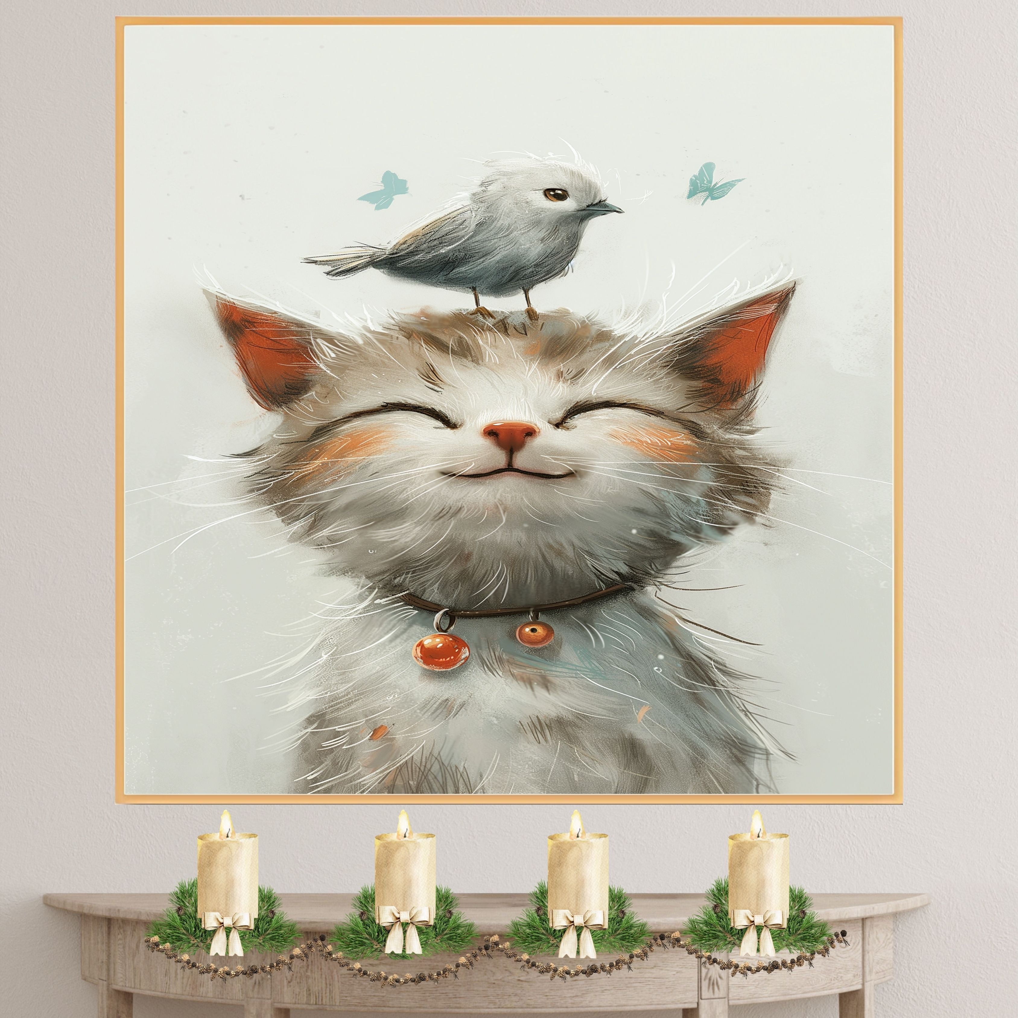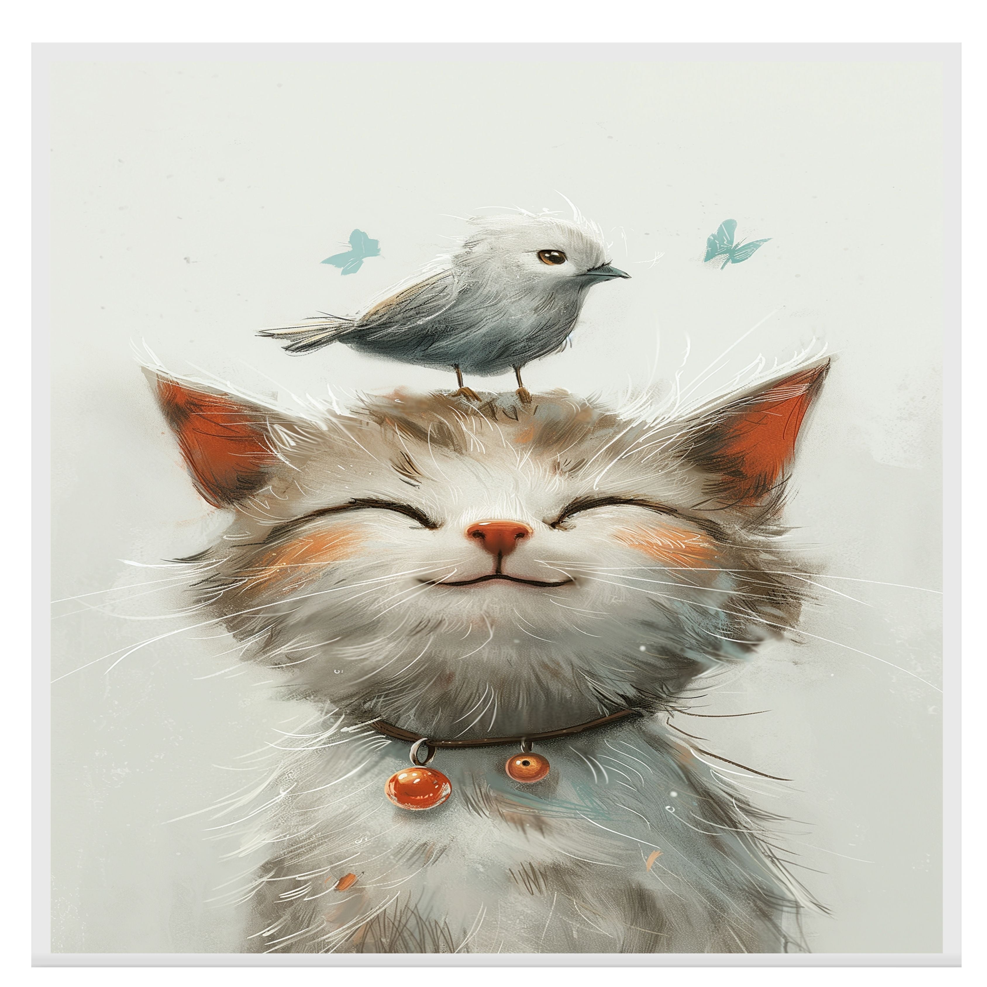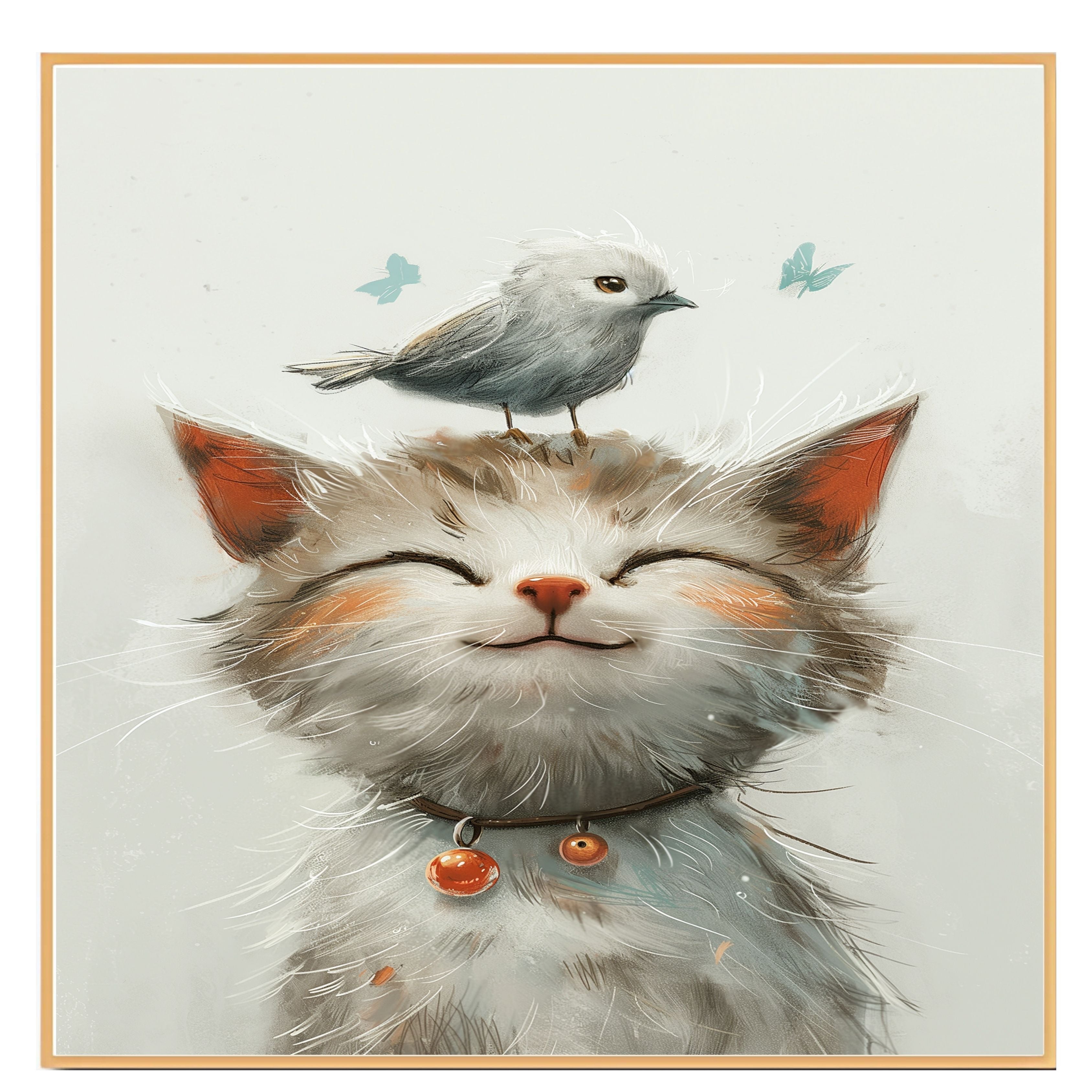 This sweet and heartwarming painting features a fluffy kitten beaming with joy as a soft white bird perches on its head. The addition of gentle butterflies and a pair of orange bells on the collar adds playful charm. A perfect piece for nurseries, pet lovers, and anyone who enjoys imaginative animal-themed decor.