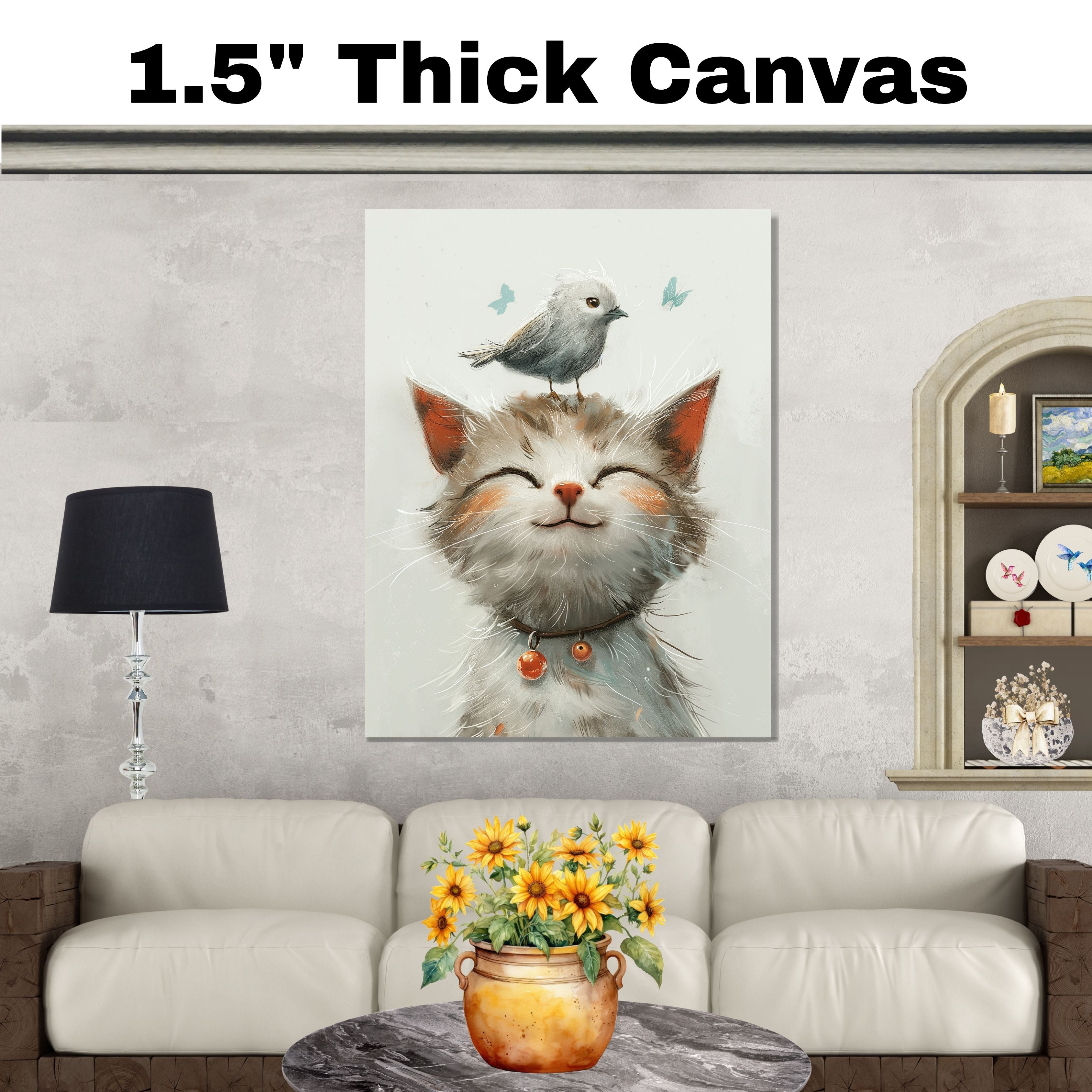 Delightful Painting of a Smiling Kitten with a White Bird on Its Head and Bells on Its Collar Perfect for Whimsical Decor or Gifts for Cat and Animal Lovers on Ready to Hang 1.5" Thick Canvas Wrap, Floating Framed Canvas, Flat Rolled Canvas