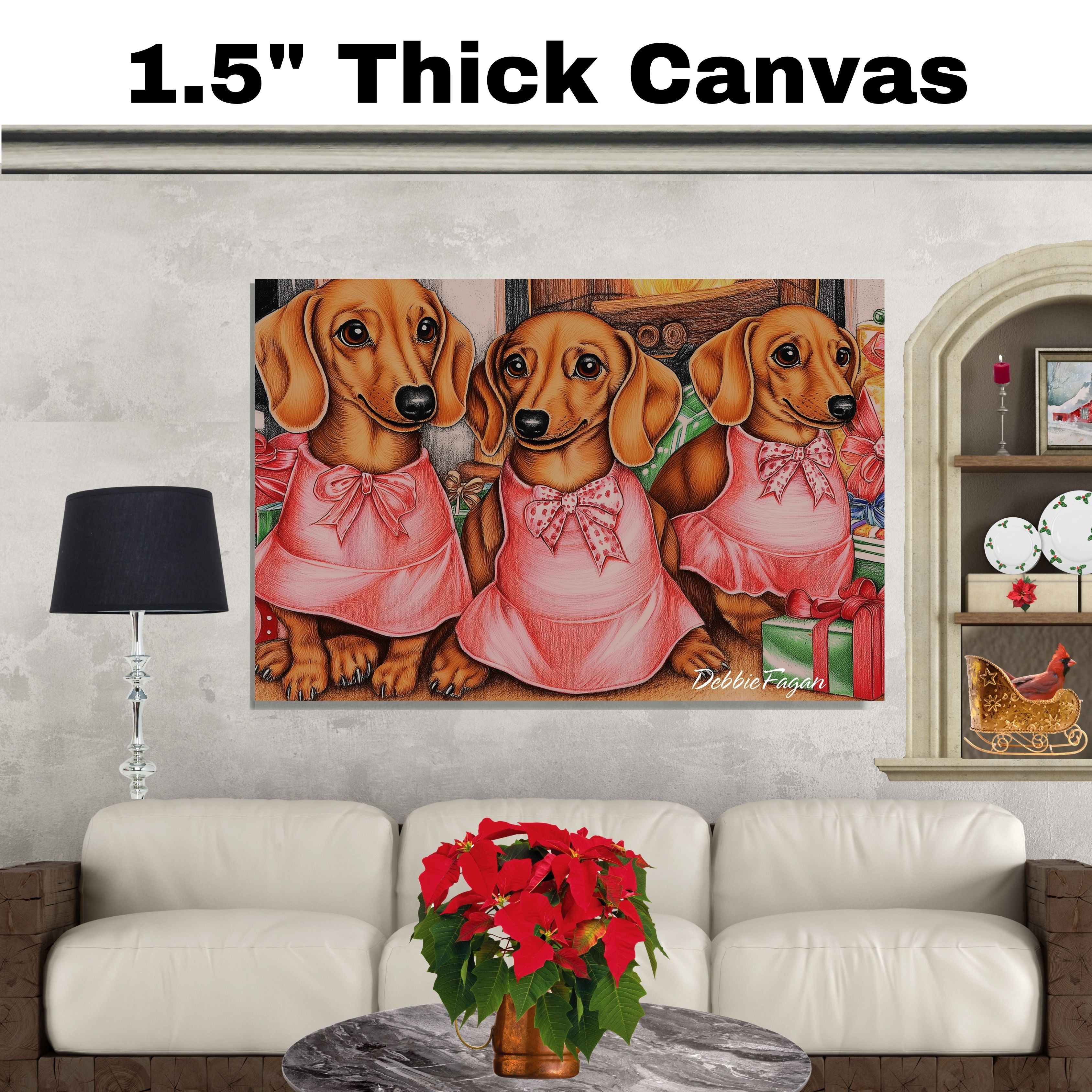 Dog Christmas Canvas - "Dachshund Delight" - Vintage-Inspired Art with Festive Presents on Ready to Hang 1.5" Thick Canvas Wrap, Floating Framed Canvas, Flat Rolled Canvas