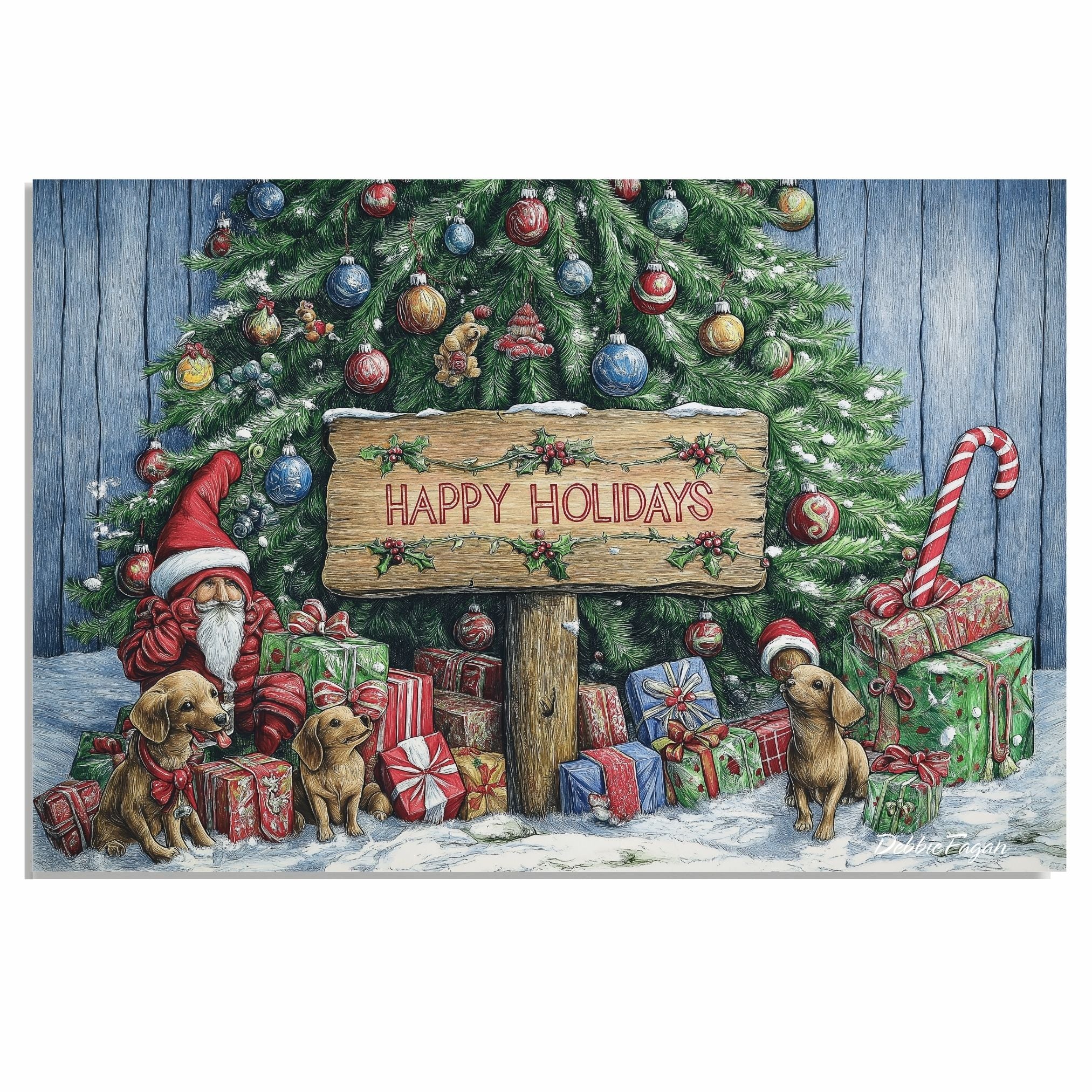 Our Holiday Paws Canvas adds a touch of festive delight to your home, showcasing a charming scene of adorable puppies wearing cheerful elf hats, surrounded by beautifully wrapped presents beneath a glowing Christmas tree. Available in a 1.5" thick canvas wrap, floating framed canvas, or as a flat rolled canvas, this enchanting artwork titled Holiday Paws captures the heartwarming essence of the holiday season. With its delightful blend of playful puppy antics and joyful holiday spirit, this vibrant piece is perfect for bringing cheer to your festive decor and serves as a whimsical focal point in any room.